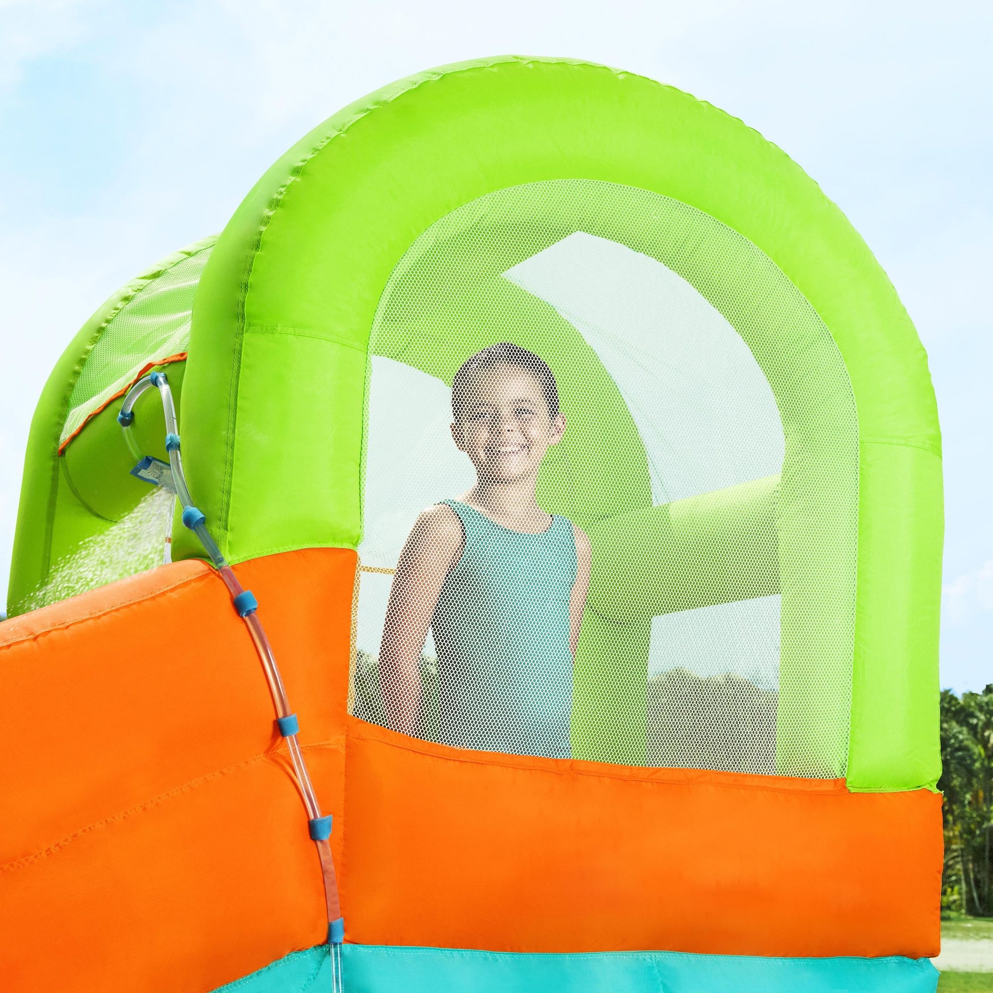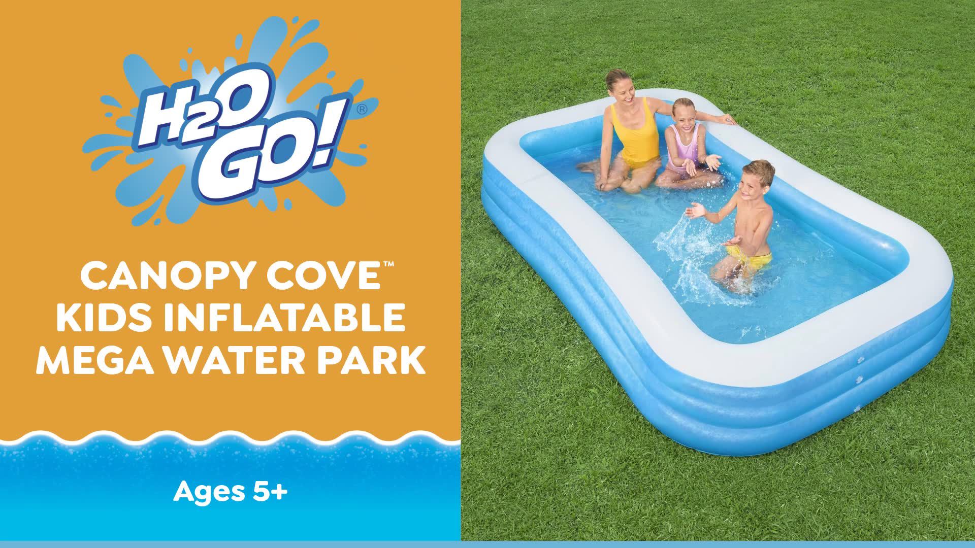 Playtime happens together with the H2OGO! Canopy Cove Inflatable Mega Water Park! Sit under the shaded canopy, feel the cool water on your feet and put a refreshing drink in your hand (or the cup holder beside you!) while the kids climb, slide and navigate their very own water park. Let your kids take aim with the point ‘n spray water blaster – or turn the spray action on them and join in on the fun! Kids can take their adventure to new heights by scaling the climbing wall, which features padded grab handles and footholds. Once they're at the top, they'll slide down quickly into the large splash pool thanks to the built-in water sprayer that keeps the inflatable water slide speedy and slippery. Constructed with durable, double-stitched material, you can feel confident this outdoor water toy is built to last. With the included heavy-duty blower that inflates the entire water park in less than two minutes, you'll be enjoying quality time together on the H2OGO! Canopy Cove Mega Water Park summer after summer.
