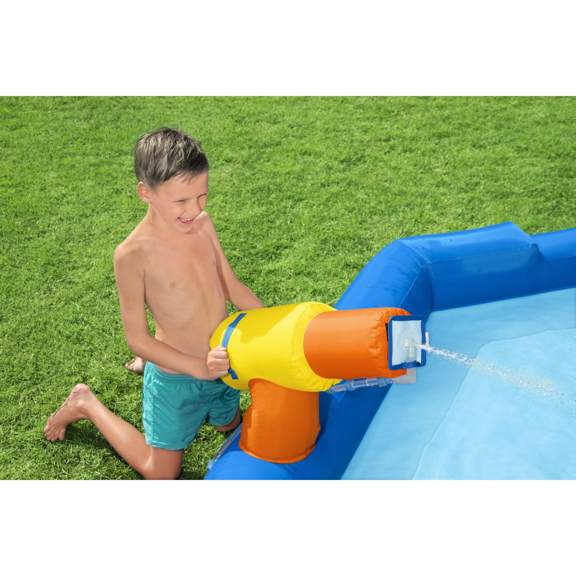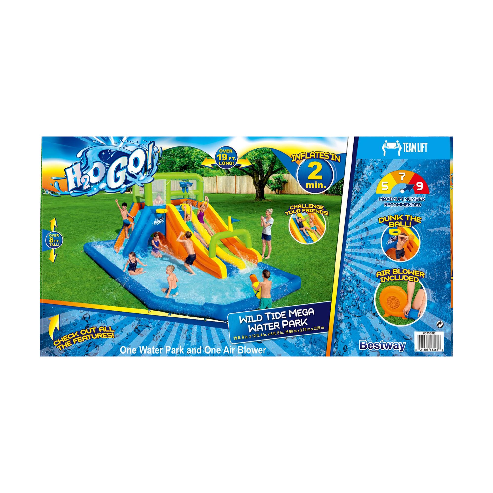 The park is constructed of double-stitched, PVC coated polyester material that is super durable and provides a comfortable feel and touch for kids, keeping the fun splashing year after year. The included heavy-duty blower effortlessly inflates the water park in less than two minutes, so the H20GO! Wild Tide Water Park can go from the box to party-mode in no time.