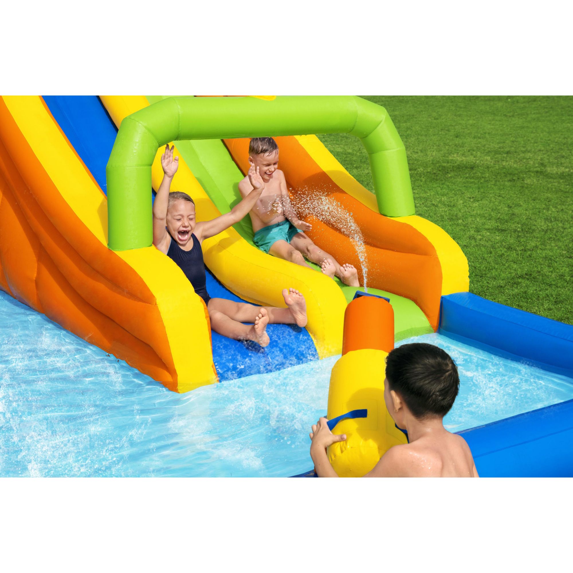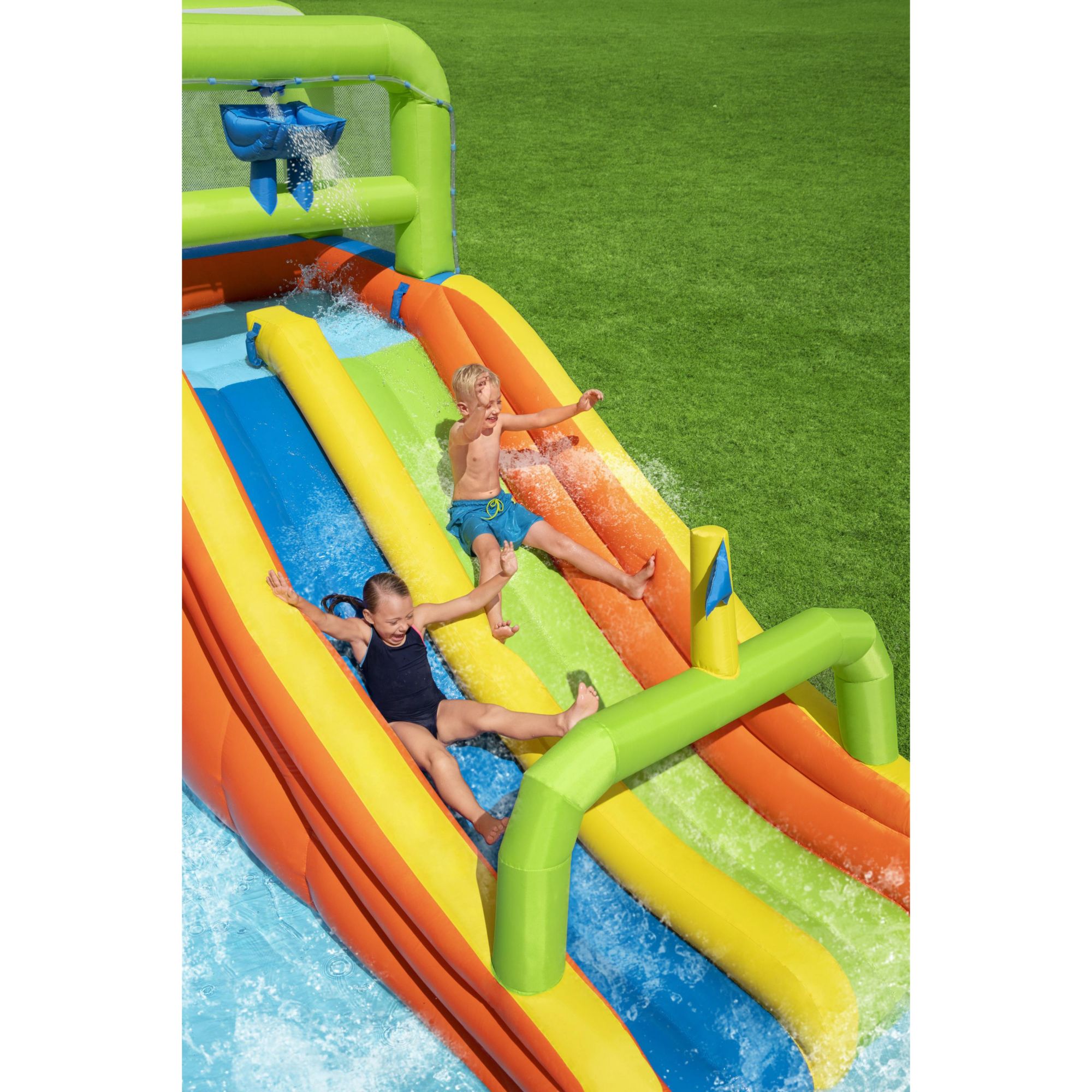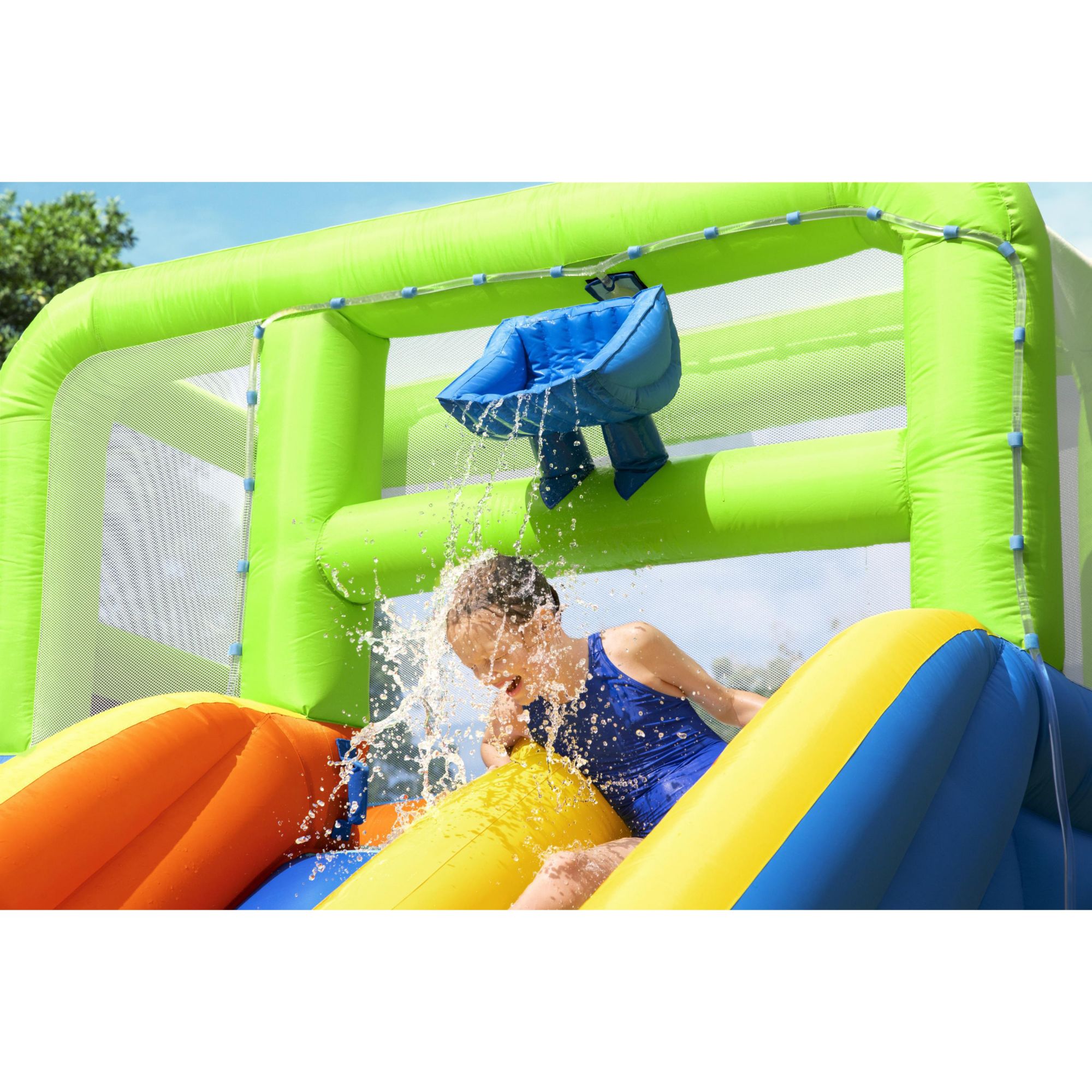 Double-lane race slide with surprise dump bucket that randomly soaks kids 110-120V blower inflates the water park in two minutes Extra-large splash pool with a point and spray water blaster Hidden crawl-through tunnel under climbing wall Ball hoop and included basketball for extra water fun Double-stitched material for increased durability Top platform weight capacity: 120 lbs. Splash pool water capacity: 560 gals. Two-lane race-ready water slide Includes water slide, blower, water spraying hose, repair kit, storage bag, 15 stakes, and basketball