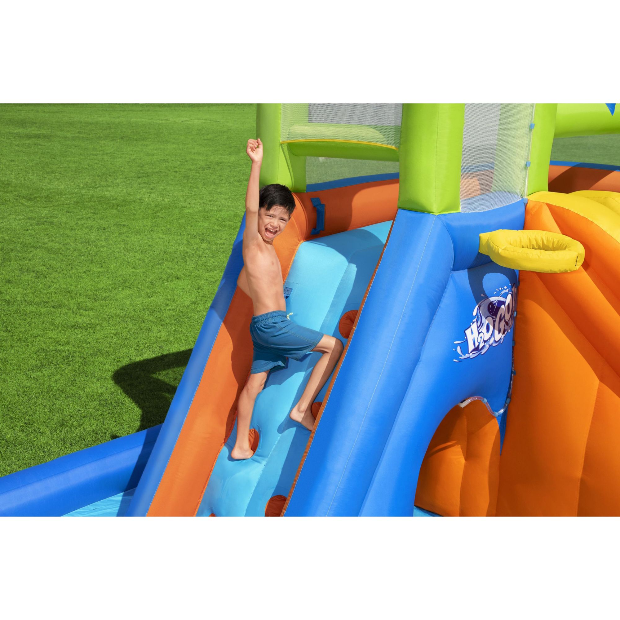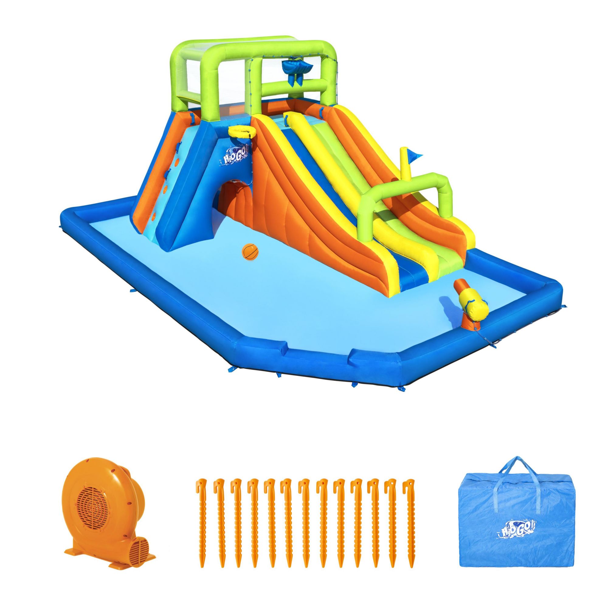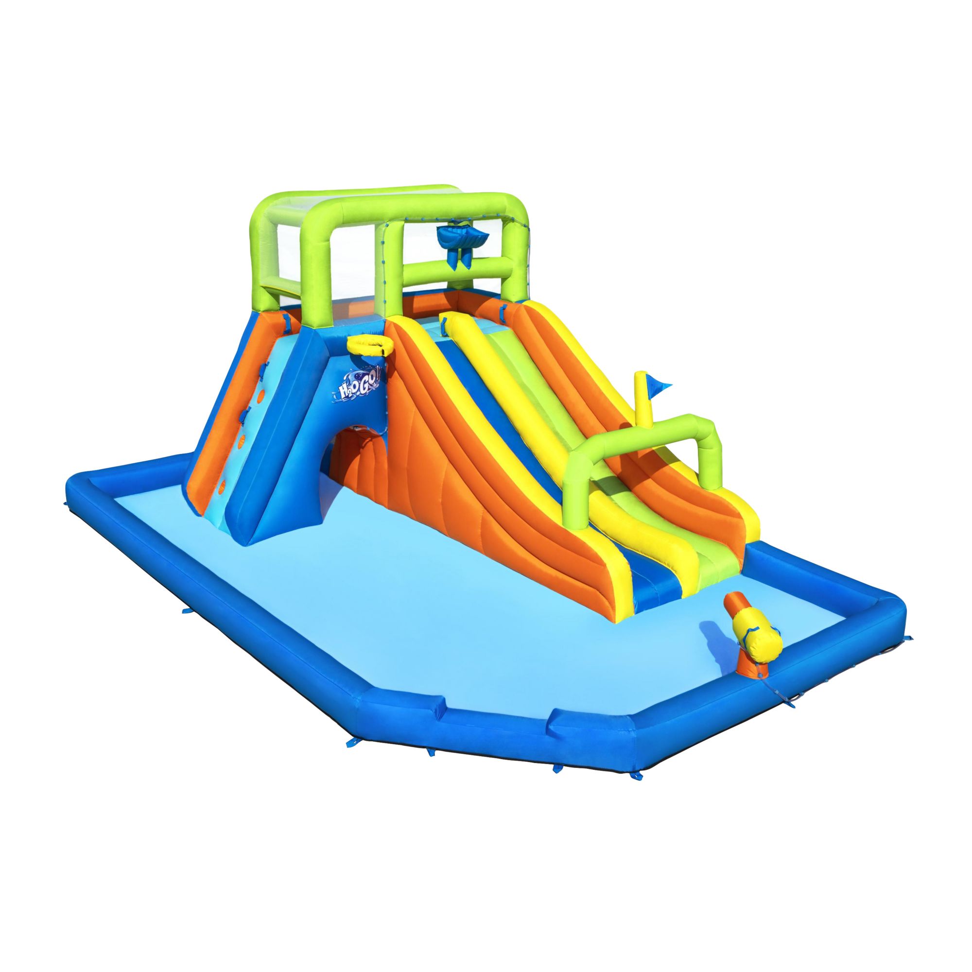 The perfect addition to any barbeque, birthday or block party is here with the H20GO! Wild Tide Kids Inflatable Water Park. The park features two slides with safety bumpers and a surprise dump bucket so kids can race all day long. There's plenty to explore with an extra-large play pool that leads to a secret tunnel under the climbing wall. Kids can also dunk and shoot the included basketball through the hoop for a fun game. The park also features a built-in water blaster for soaking the slides (or friends) -- just point and spray. The wall leads to the tower deck that's secured with mesh walls for stability and safety.