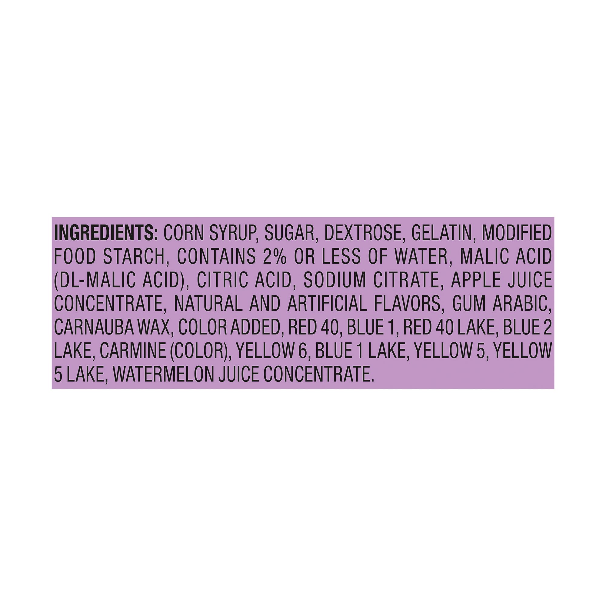 Ingredients: Sugar. Dextrose. Gelatin. Modified Starch, Contains 2% Or Less Water, Malic Acid Malic Acid), Citric Acid, Sodium Citrate, Apple Juice Concentrate, Gum And Artificial Flavors, Wax, Color Added. Red 40, Yellow Lake, Red 40 Lake. Yellow 5. Blue 1. Laffy Taffy Ingredients: Corn Syrup, Sugar, Palm Oil, Contains 2% or Less of Mono-and Diglycerides, Malic Acid, Hydrogenated Cottonseed Oil, Salt, Natural Flavors, Soy Lecithin (Emulsifier), Blue 1, Red 40, Yellow 5.