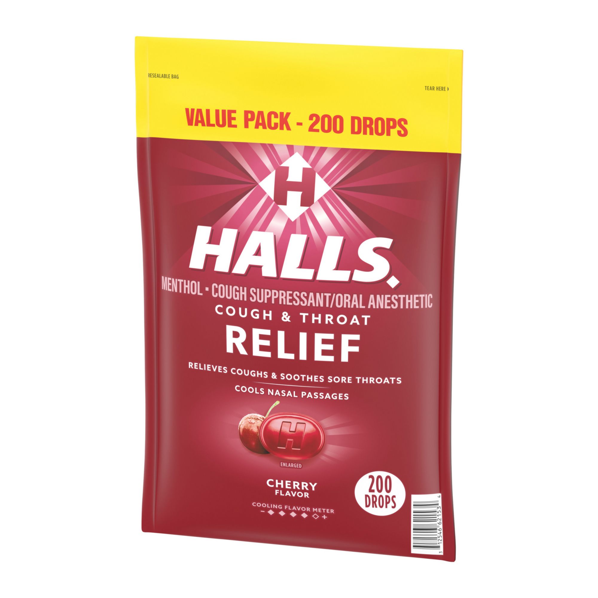 Halls Relief Cherry Cough Drops are ready for whatever life throws, or coughs, your way. With 5.8 mg of menthol per drop, these Halls cough drops relieve coughs, soothe sore throats and cool nasal passages to relieve your worst symptoms. This value pack of cough suppressant drops come in a tasty cherry flavor that is both refreshing and soothing. Whether you're using Halls cough drops for sore throat relief, cough relief or as an oral anesthetic, simply dissolve one drop in your mouth slowly, and repeat every two hours as needed. Once the drop starts to dissolve, it usually starts working quickly. The advanced formula and triple soothing action get you back on your feet so that you can do the things you need to do. Halls Relief menthol cough drops are formulated for adults and children five years and older. Each Halls value pack contains 200 menthol cough drops, giving you enough to stock your home or office during cold and flu season. Bulk Halls cough drop bags are resealable to keep the cough drops fresh and effective. The resealable packaging also makes it easy to toss into your bag, travel pack or desk drawer, giving you convenient access when symptoms strike.
