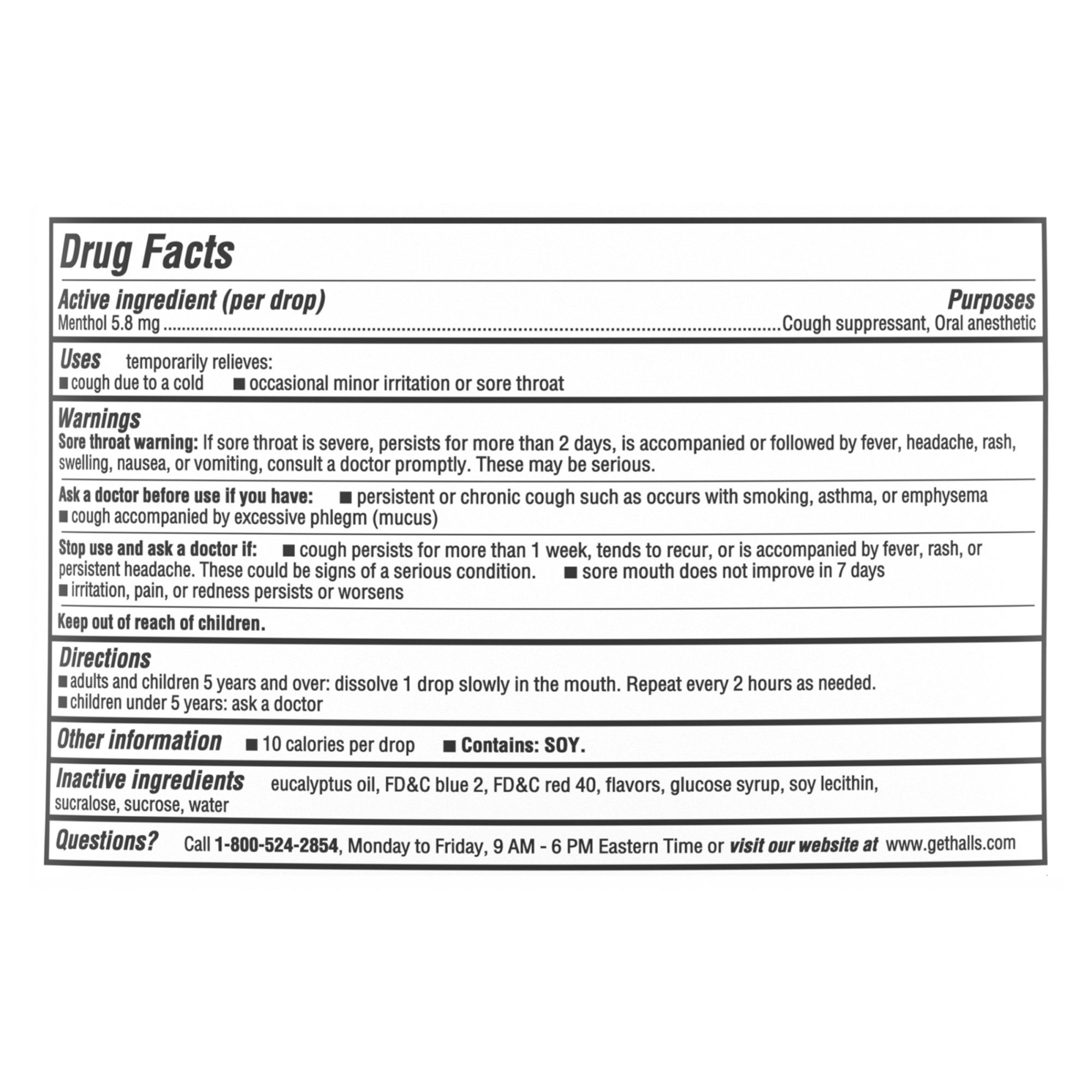 Inactive Ingredients: Eucalyptus Oil, FD&C Blue 2, FD&C Red 40, Flavors, Glucose Syrup, Soy Lecithin, Sucralose, Sucrose, Water Contains: Soy.