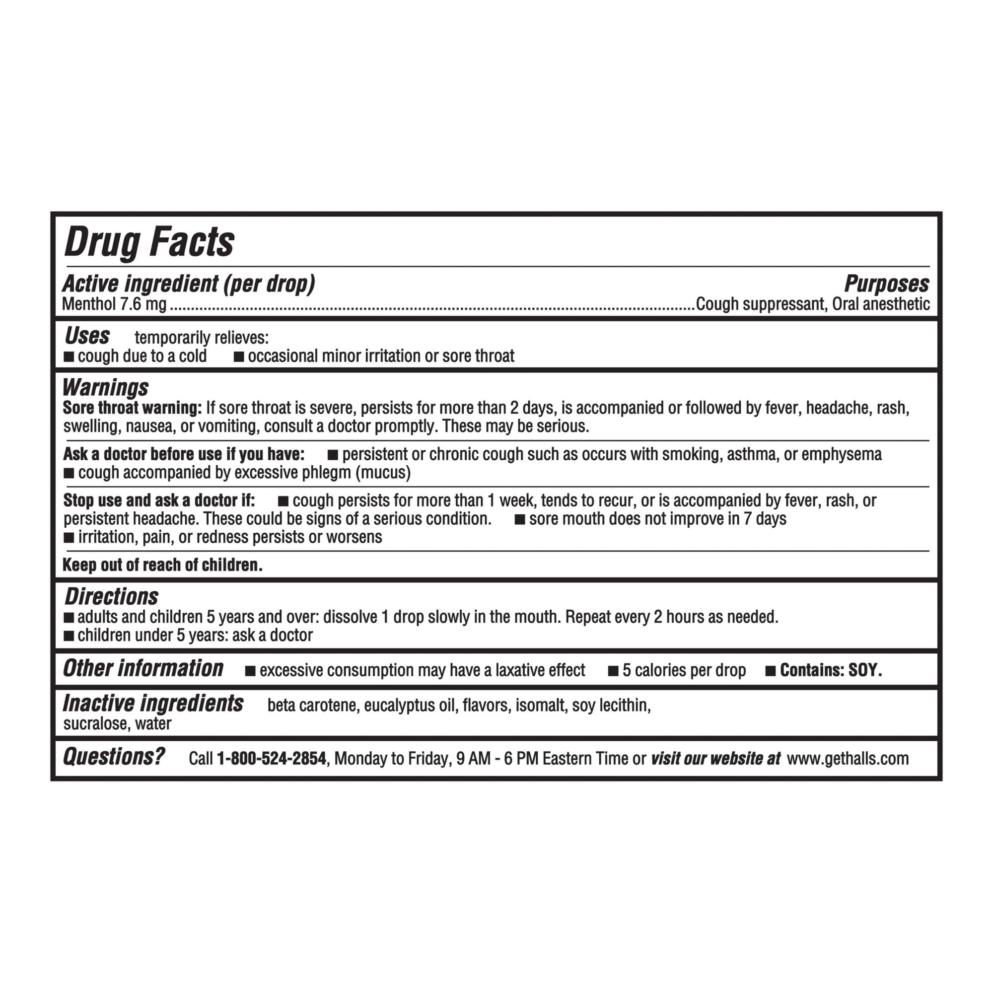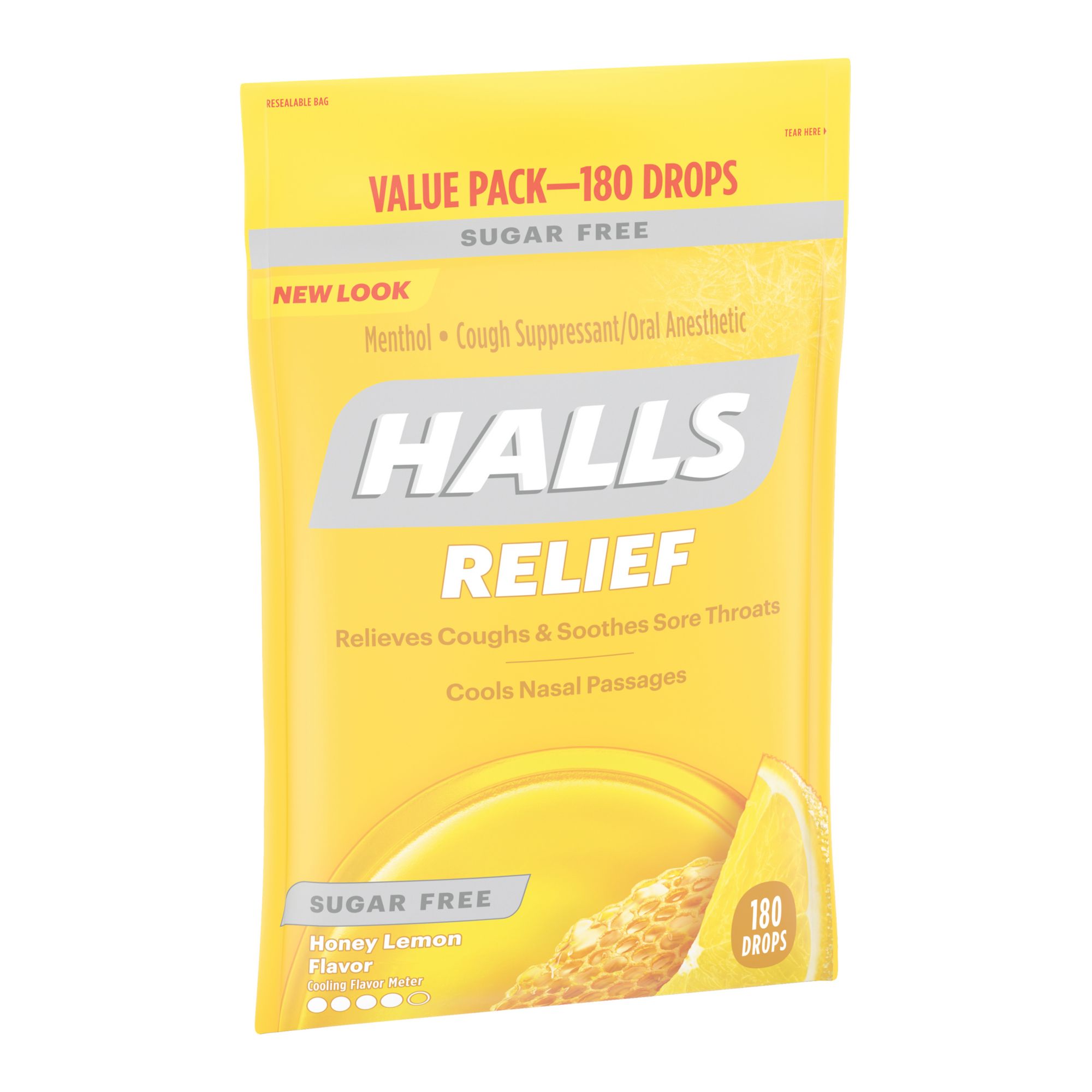 Halls cough suppressant drops fight coughs, soothe sore throats and cool nasal passages with a Triple Soothing Action formula. Each honey lemon drop is only 5 calories and contains 0 grams of sugar.