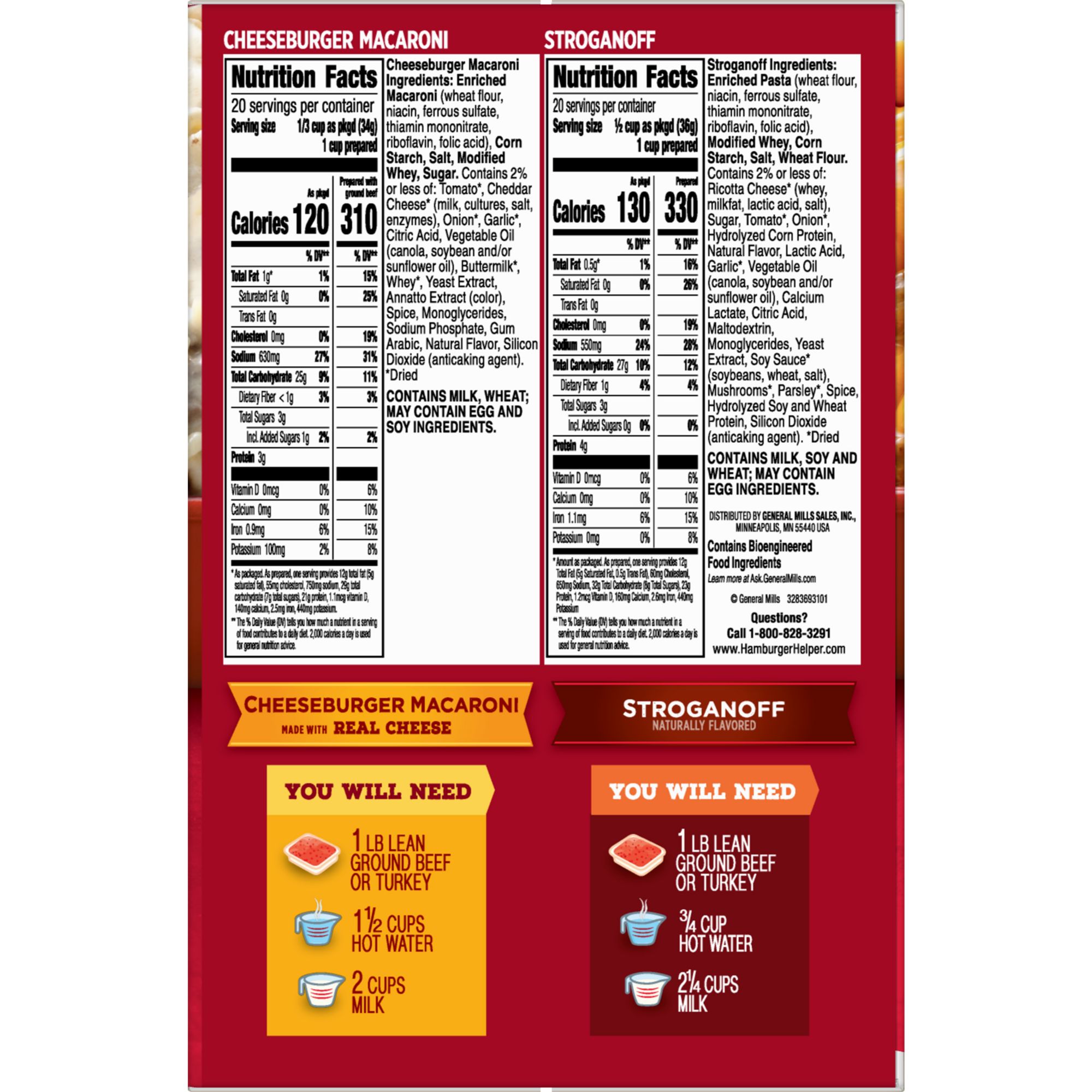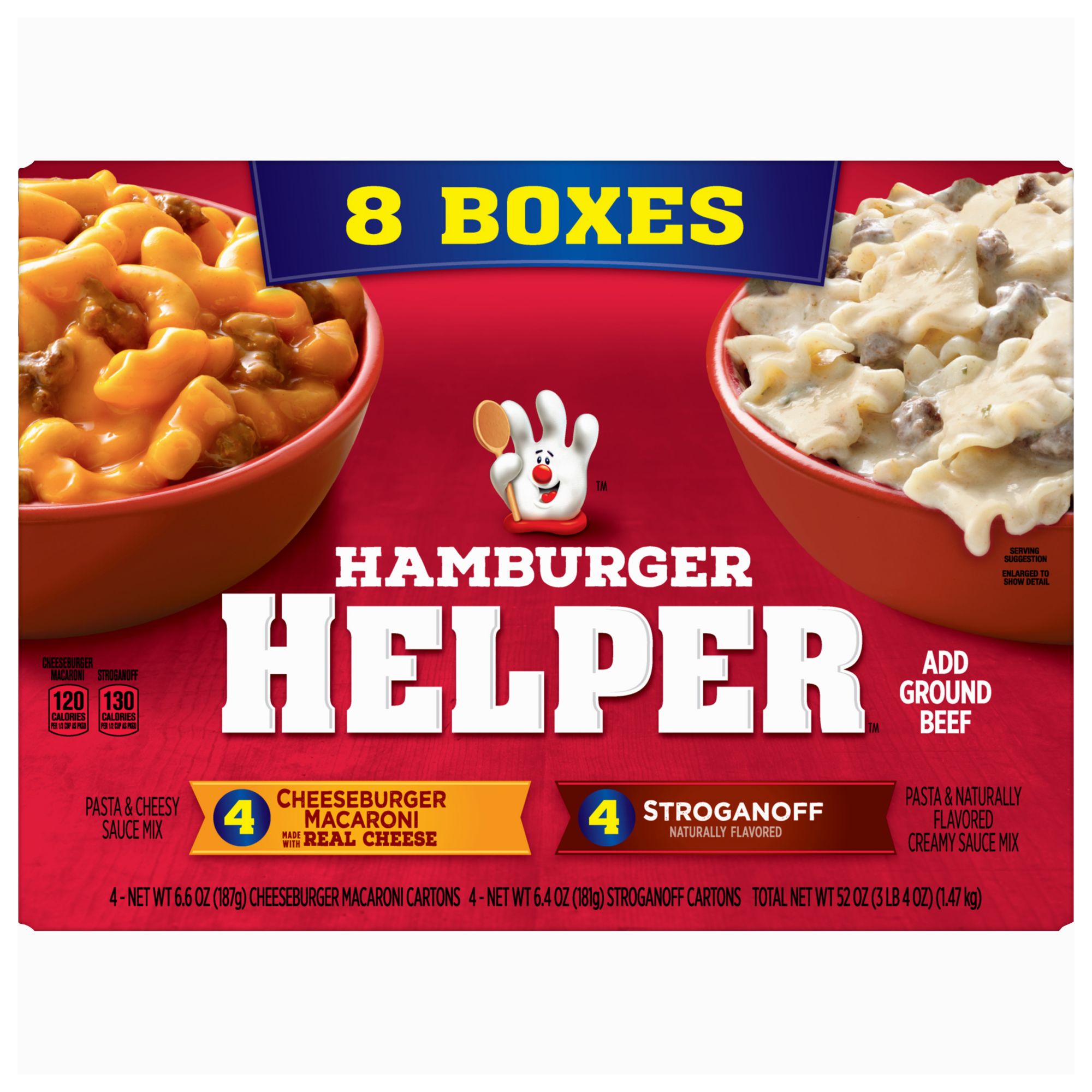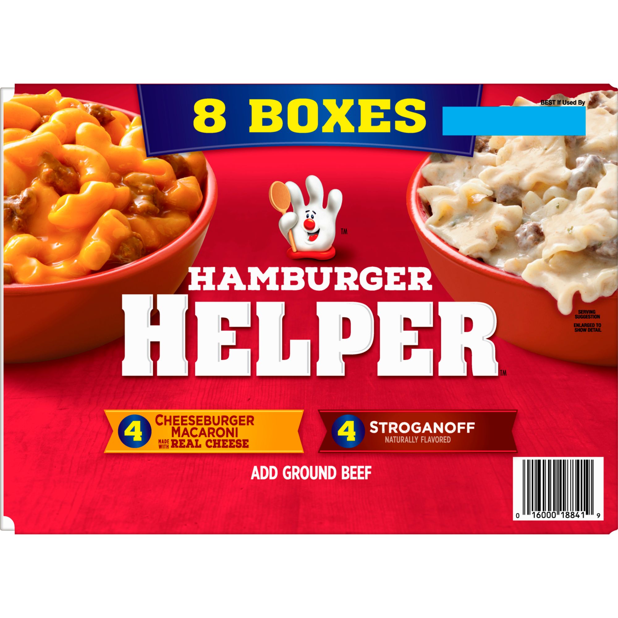 Hamburger helper is a simple prep weeknight meal for the whole family Just add ground beef and make your favorite veggie side for a hearty meal Made with real cheese, this is a family favorite meal Includes eight packets of pasta and cheese or creamy sauce mix