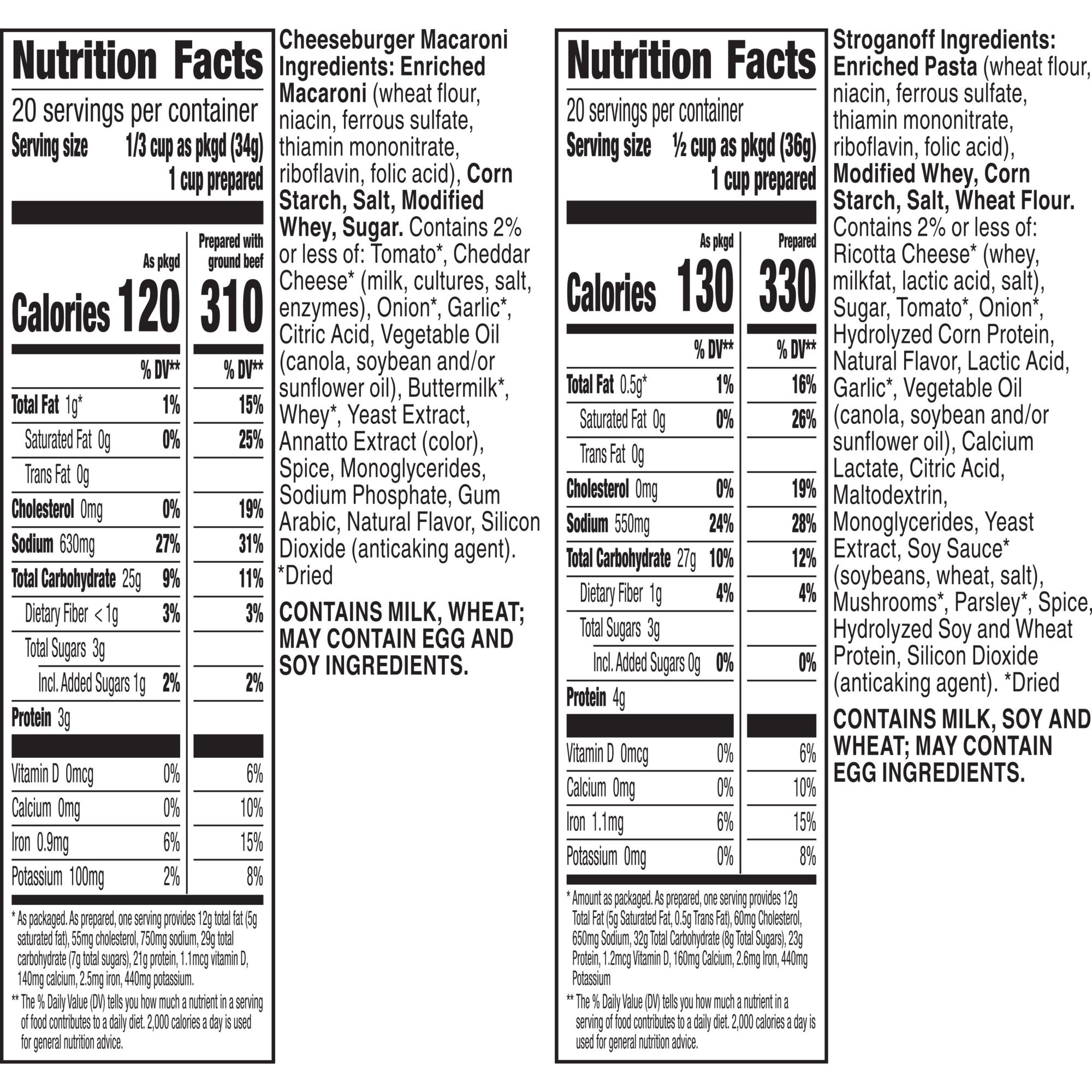 Cheeseburger Mac: Enriched Macaroni, Core Starch, Salt, Modified Whey, Sugar, Cheddar Cheese, Onion, Garlic, Citric Acid, Vegetable Oil, Buttermilk, Whey, Yeast Extract, Annatto Extract, Spice, Monoglycerides, Sodium Phosphate, Gum Arabic, Natural Flavor, Silicon Dioxide Stroganoff: Enriched Pasta (Wheat Flour, Niacin, Ferrous Sulfate, Thiamin Mononitrate, Riboflavin, Folic Acid), Modified Whey, Corn Starch, Salt, Wheat Flour.