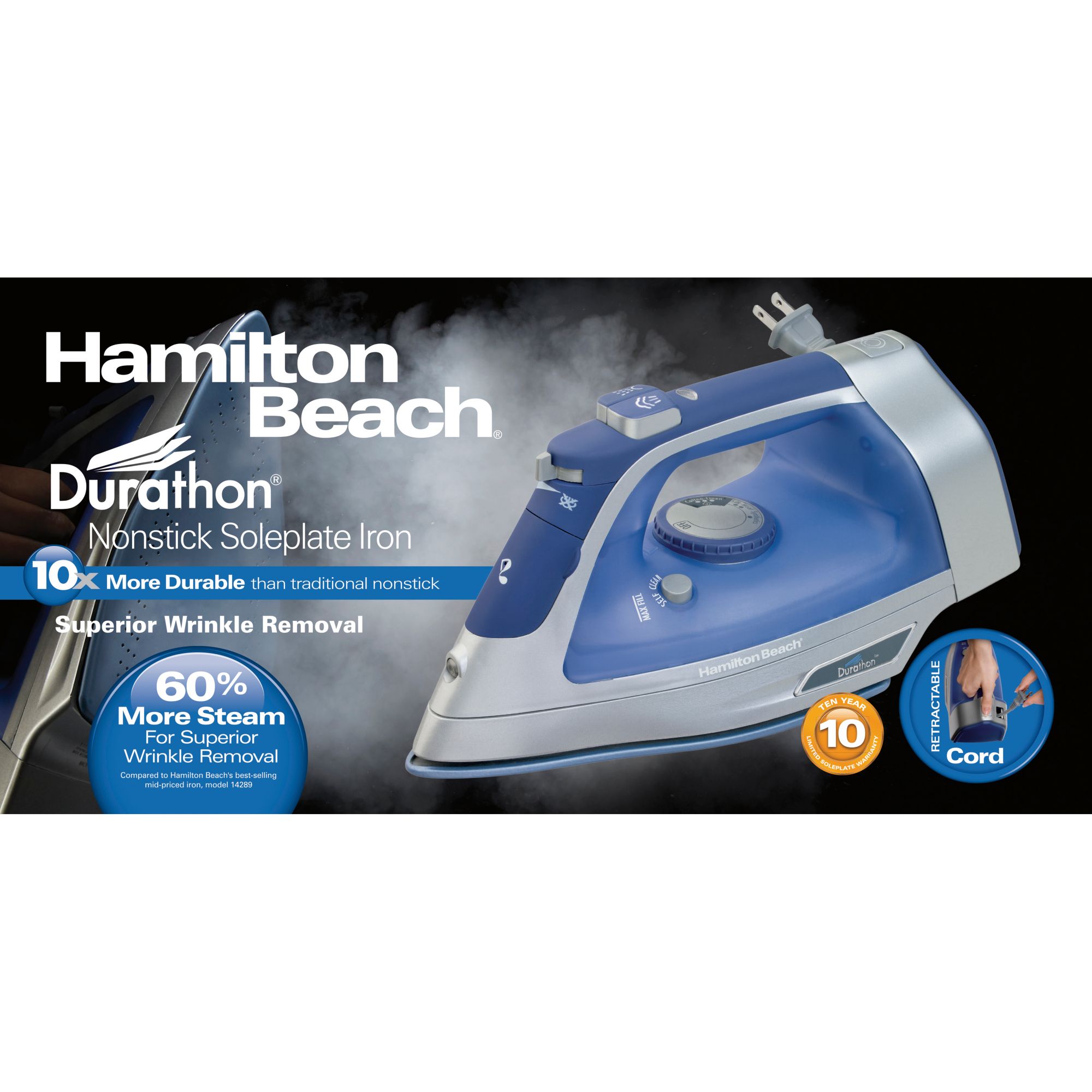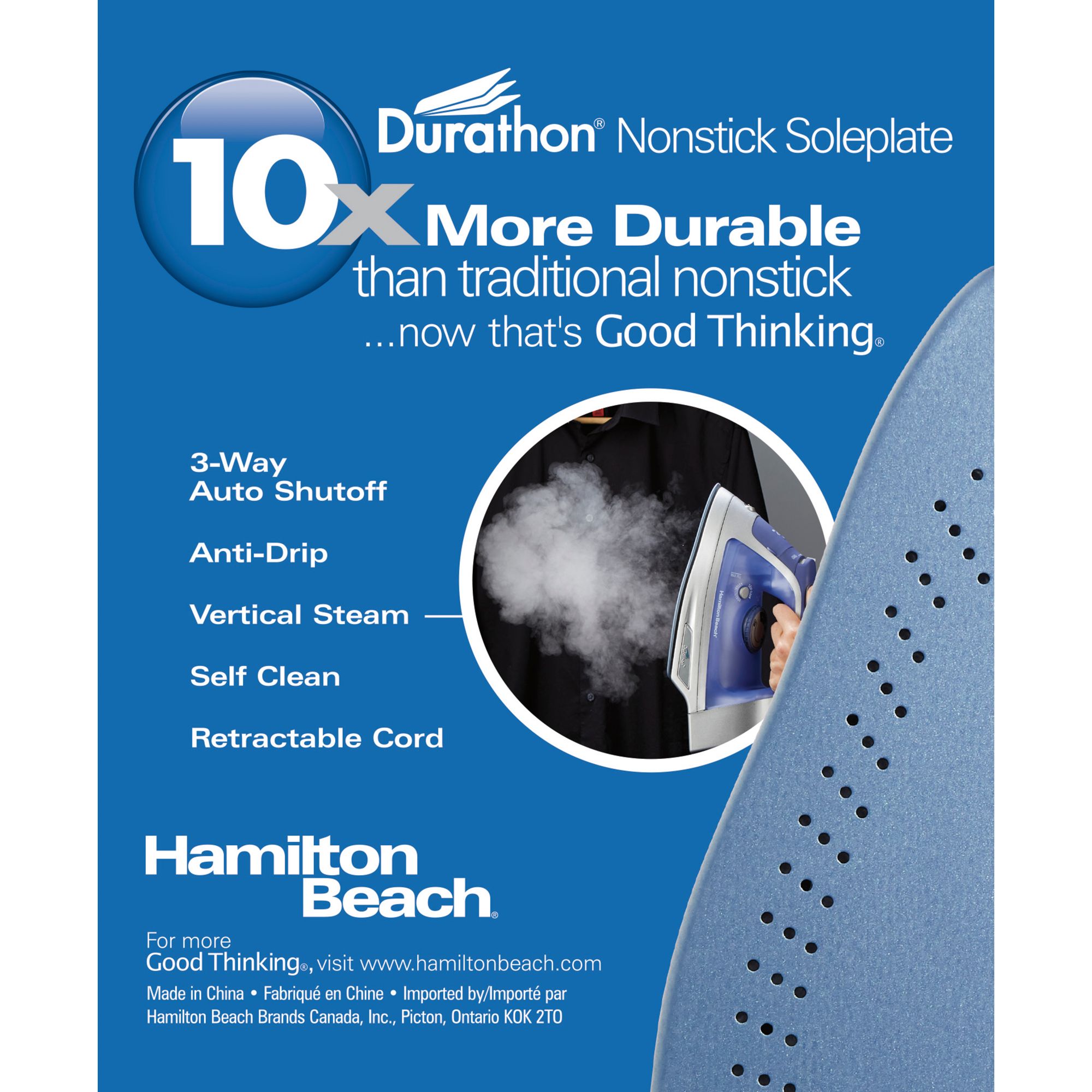 Remove wrinkles fast with the Hamilton Beach Durathon Nonstick Soleplate Iron. The Durathon nonstick soleplate is ten times more durable than traditional nonstick, gliding easily over fabrics while offering 60% more steam compared to Hamilton Beach's best-selling mid-priced iron for superior wrinkle removal. 10 X More Durable than Traditional Nonstick The long-lasting Durathon nonstick soleplate glides smoothly over clothes, is scratch-resistant and heats up quickly and evenly. Adjustable Steam, Spray, and Blast Iron dry or let the Steam, Spray, and Blast options help. The Steam function relaxes stubborn wrinkles by offering 60% more steam compared to Hamilton Beach's best-selling mid-priced iron (model 14289), while Blast offers a quick burst of steam right when you need it. The Spray option is ideal for pressing shirts and making perfectly crisp creases. Doubles As a Vertical Steamer The Hamilton Beach Durathon Nonstick Soleplate Iron makes refreshing clothes while they're still on the hanger easy. Continuous, adjustable steam relaxes wrinkles, which works great for drapes, too. The 8' cord retracts back into this iron for neat, easy storage. 3-Way Auto Shutoff Have peace of mind knowing the iron will automatically power off after 30 seconds when placed on its soleplate or side and after 15 minutes when propped upright on its heel.