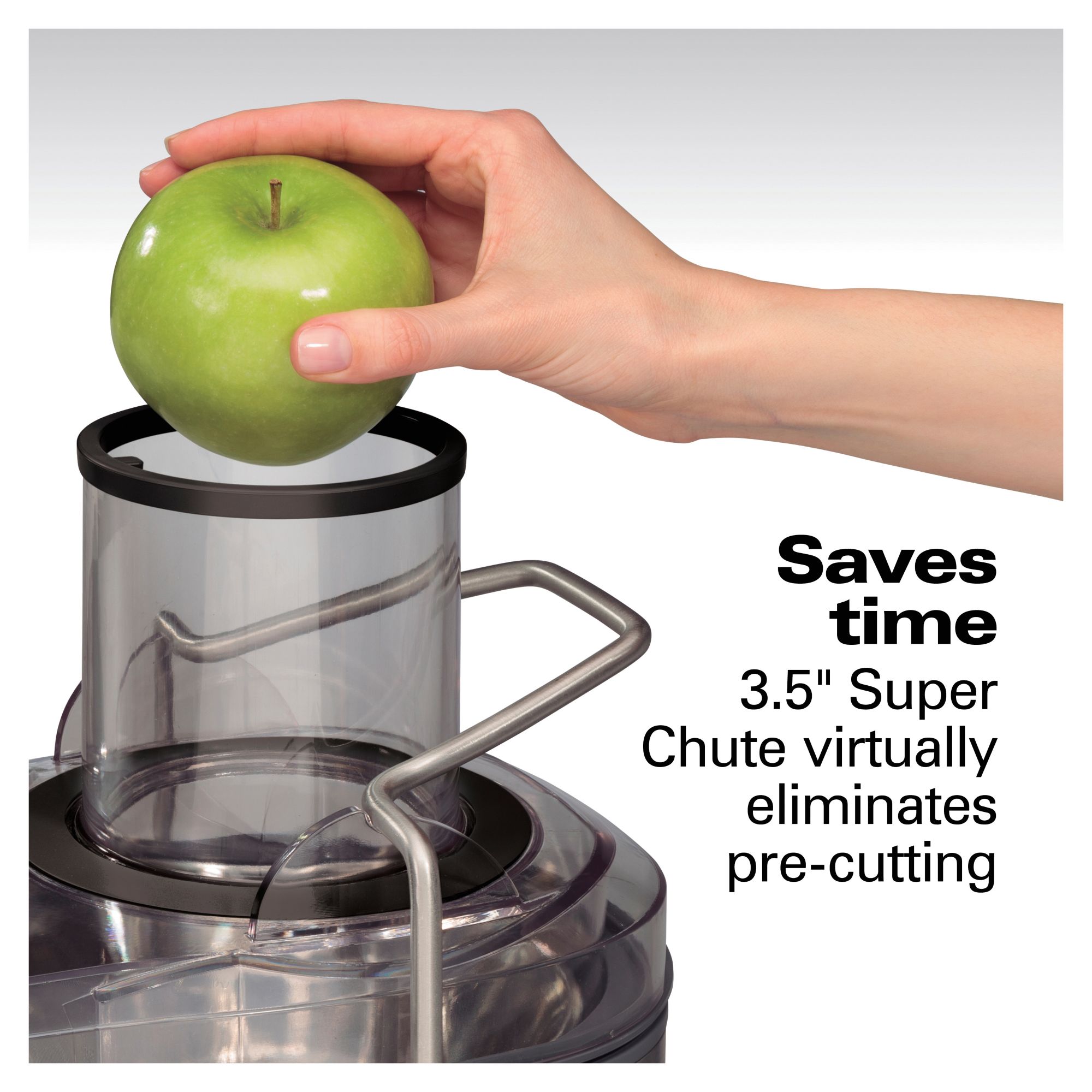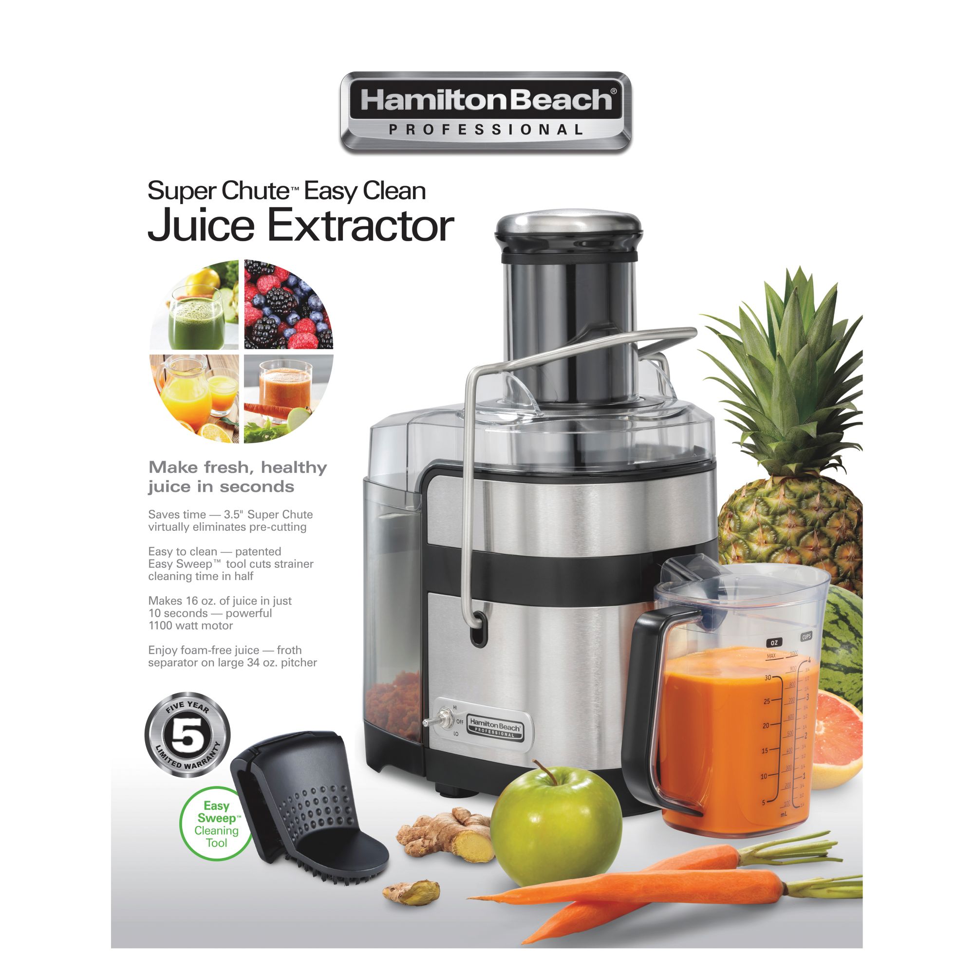 Make fresh, healthy juice in seconds with the Hamilton Beach Professional Super Chute Easy Clean Juice Extractor. The 3.5" Super Chute virtually eliminates pre-cutting to save time and the Easy Sweep tool cuts strainer cleaning time in half.