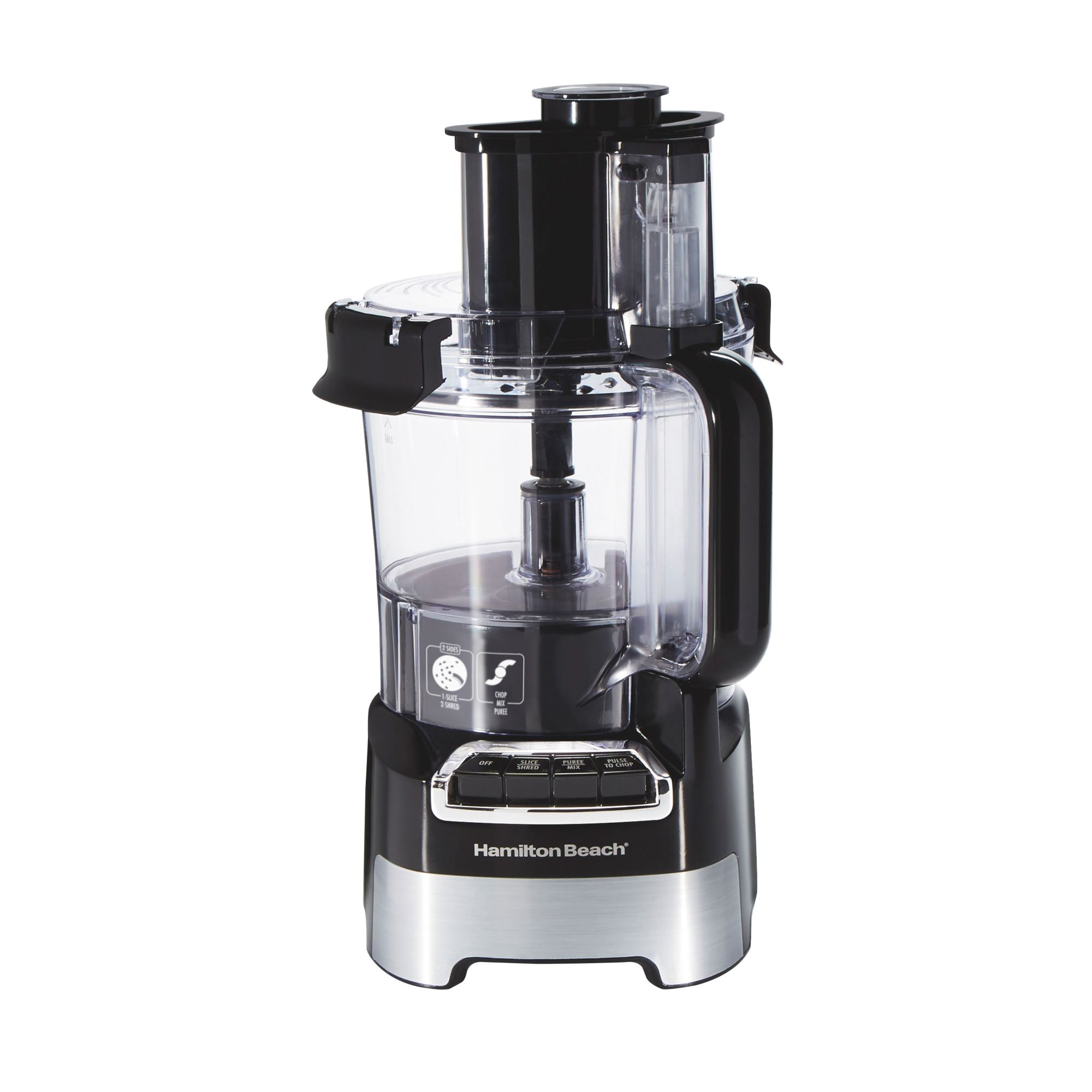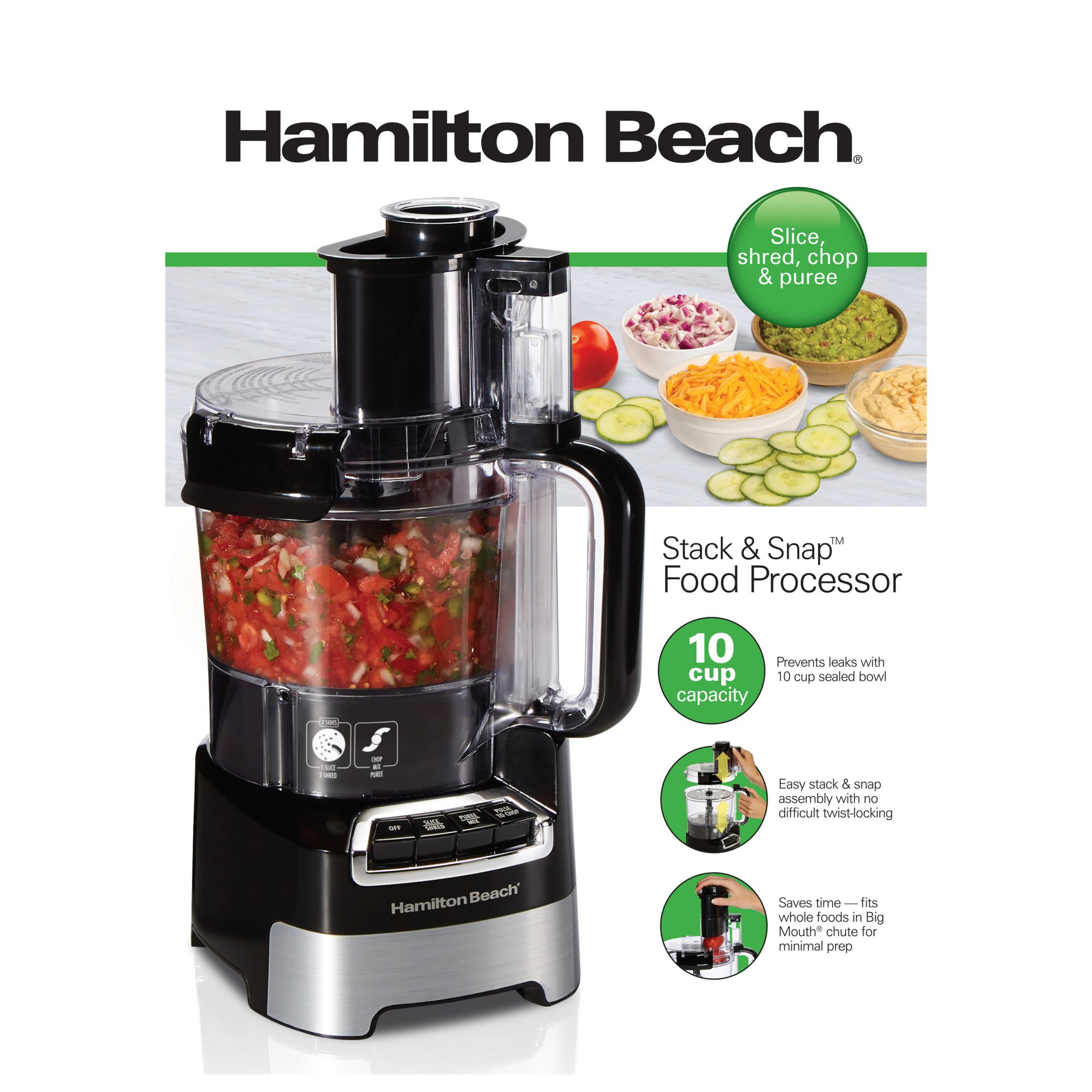 The Hamilton Beach® Stack & Snap™ 10 Cup Food Processor makes it easy to slice, shred, chop and puree vegetables, cheese, dips, sauces and so much more. The stainless-steel reversible disc slices and shreds and the stainless-steel S-blade chops, purees and mixes. The Hamilton Beach Stack & Snap 10-Cup Food Processor comes with a 10-cup sealed bowl to prevent messy leaks and its easy stack and snap assembly requires no difficult twist-locking. To save you prep time and reduce the need for pre-cutting food, the Big Mouth® feed chute fits whole foods such as tomatoes, potatoes and cucumbers. The 450-watt motor provides all the power you need for fast, easy processing and the convenient function guide shows you which blade to use and which button to push. For easy cleanup, the blades, bowl and lid are dishwasher safe. The cord storage area provides neater storage and reduces countertop clutter. All food zones are BPA-free.
