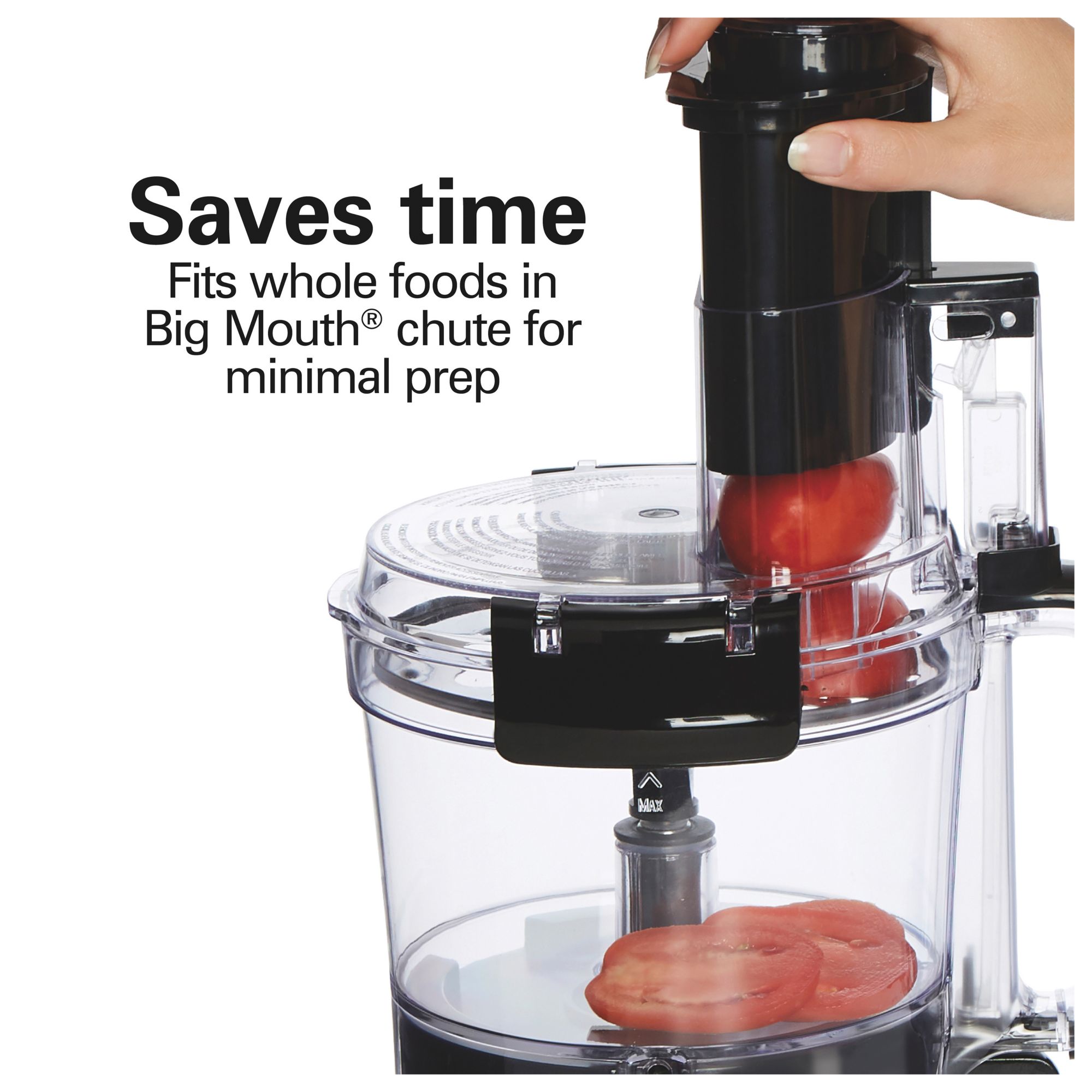 Slice, shred, chop and puree Large 10 cup sealed bowl prevents messy leaks Easy stack & snap assembly Saves time — fits whole foods in Big Mouth® chute Fast, easy processing Easy to clean with dishwasher safe blades, bowl, and lid Convenient cord storage Includes 10-cup food processor
