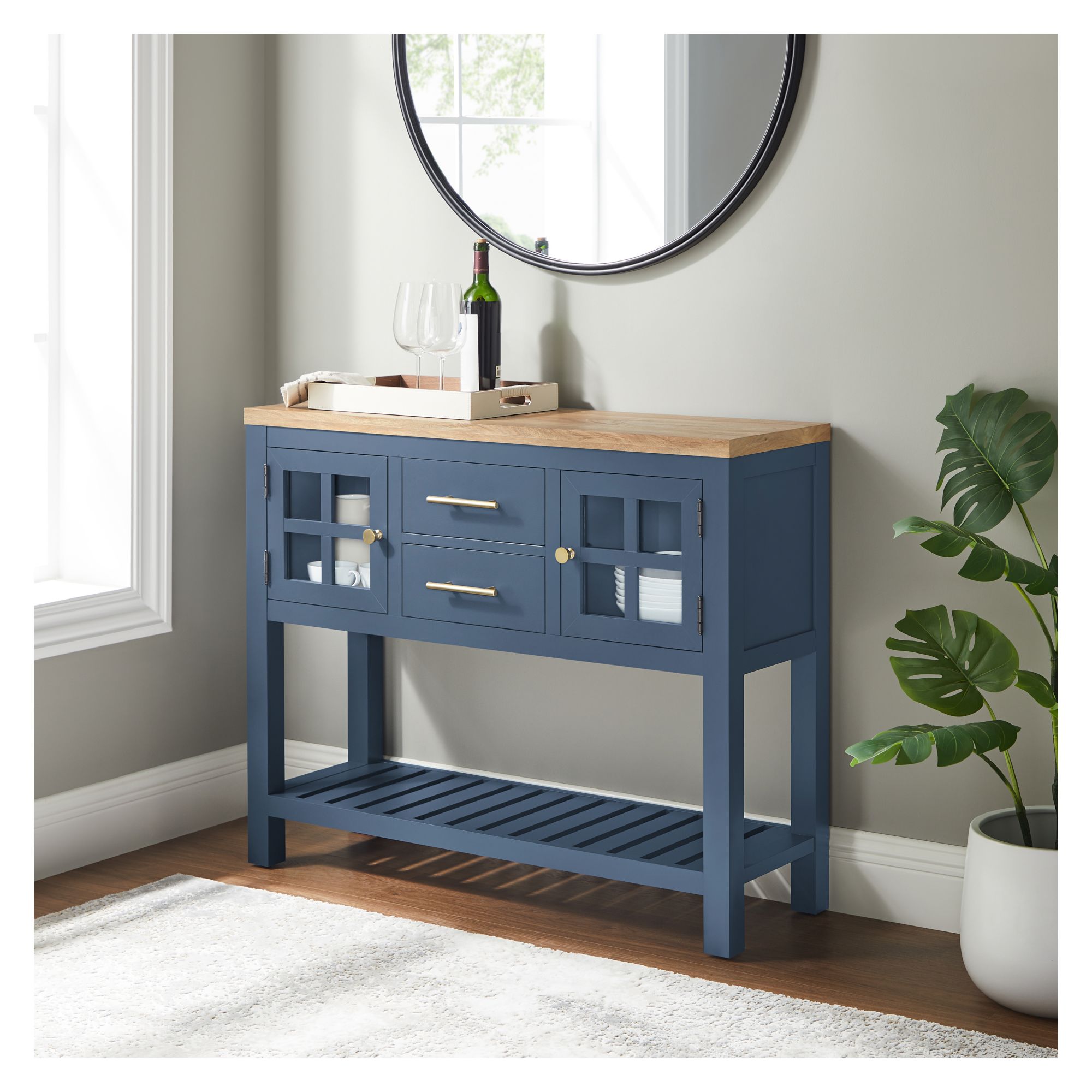 Constructed from high- quality materials with a durable laminate finish Contemporary brushed gold drawer pulls Hidden Euro-style adjustable hinges for ease of operation Twin drawers on smooth operating slides Sturdy leg construction provides maximum stability Dual doors with glass inlays for visible storage Includes (1) Console Table