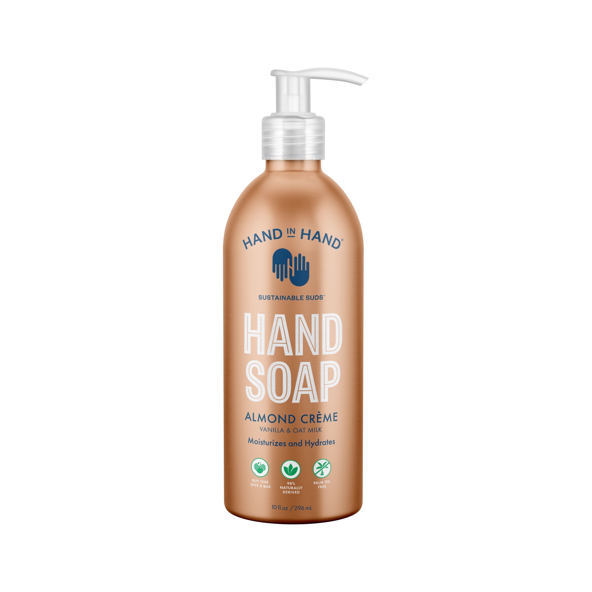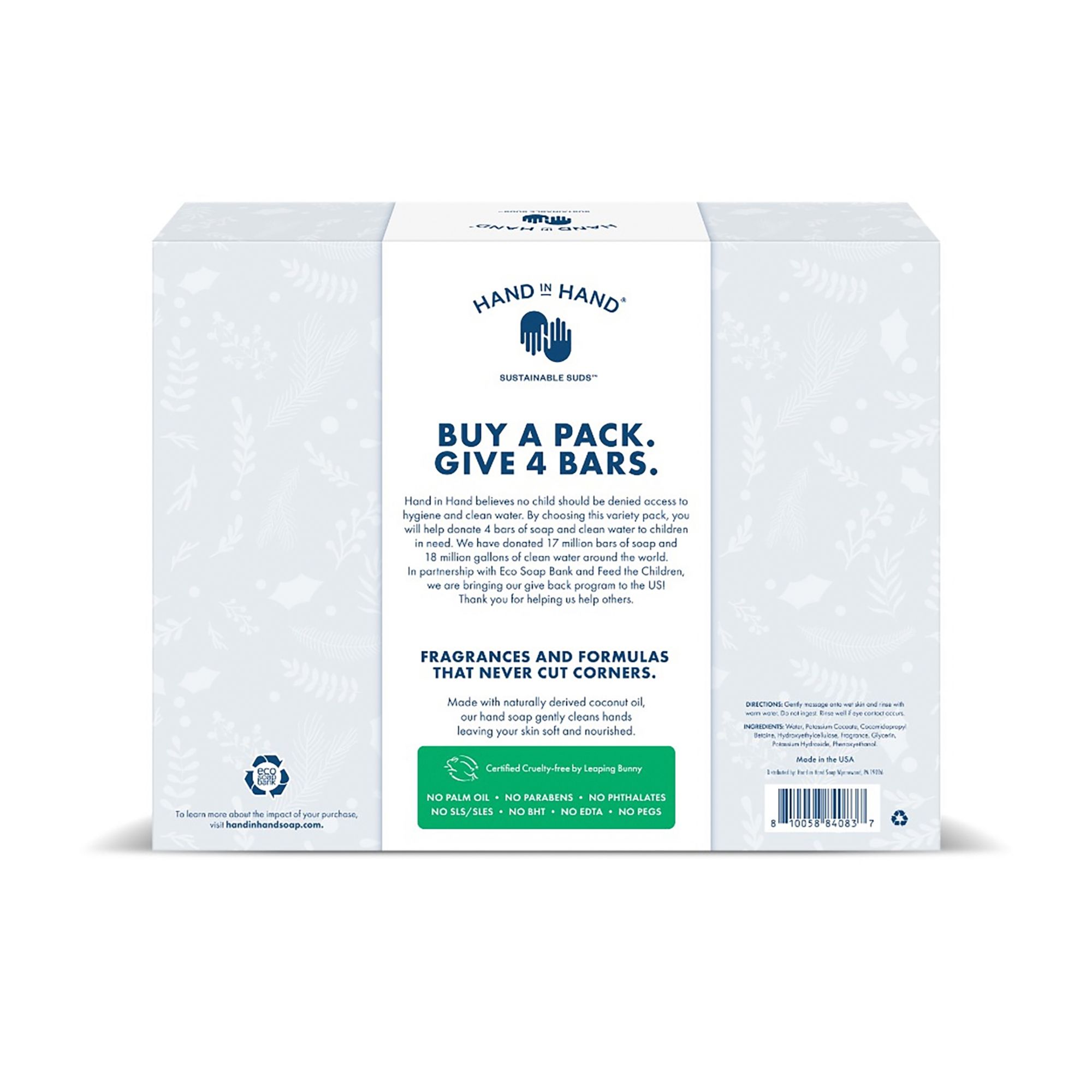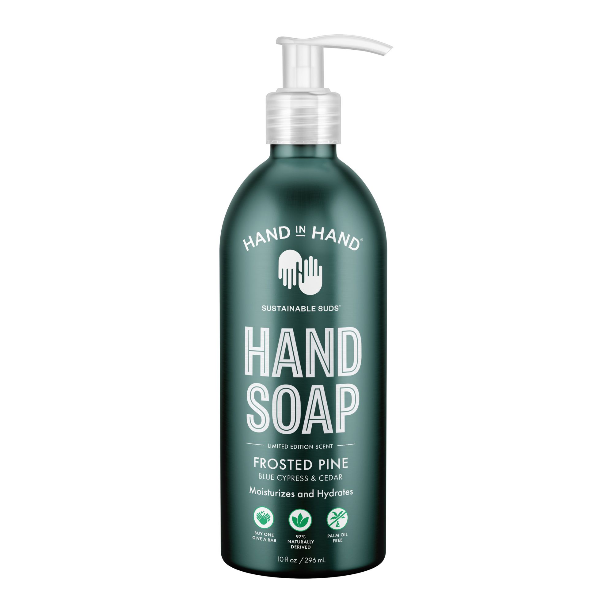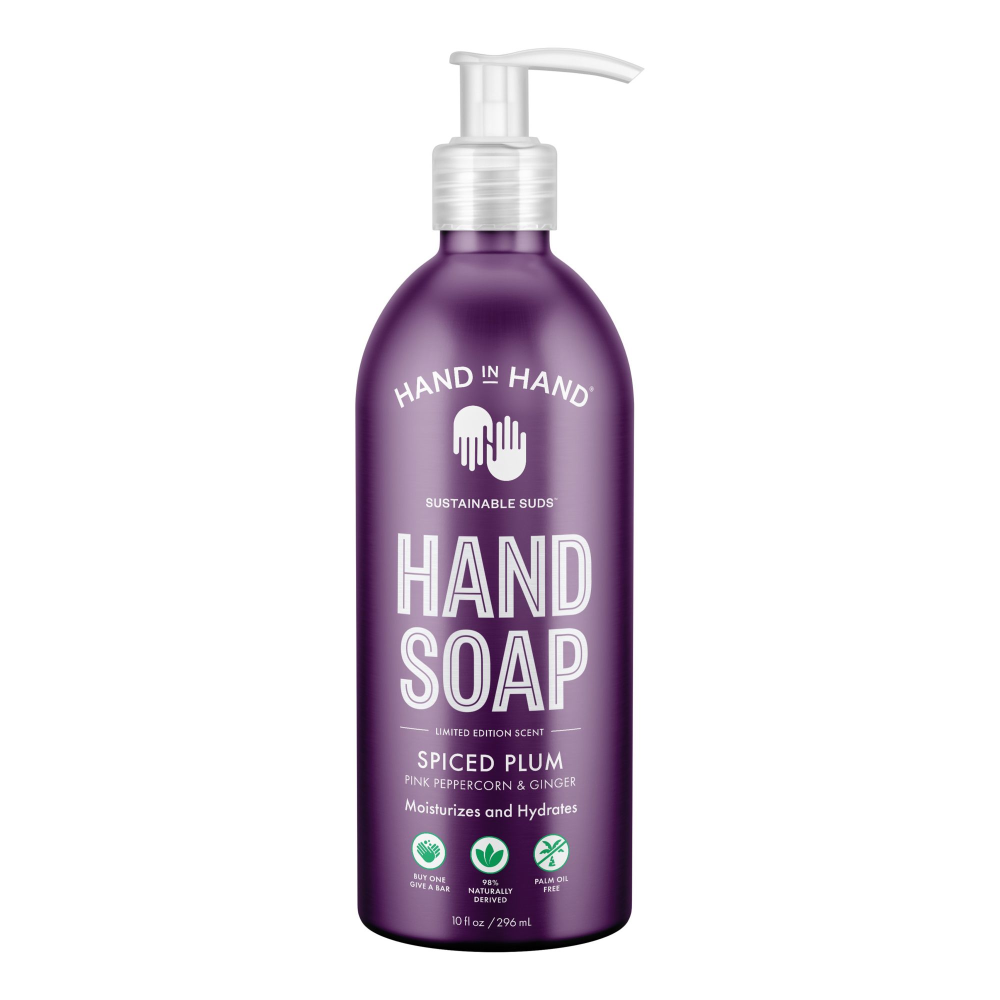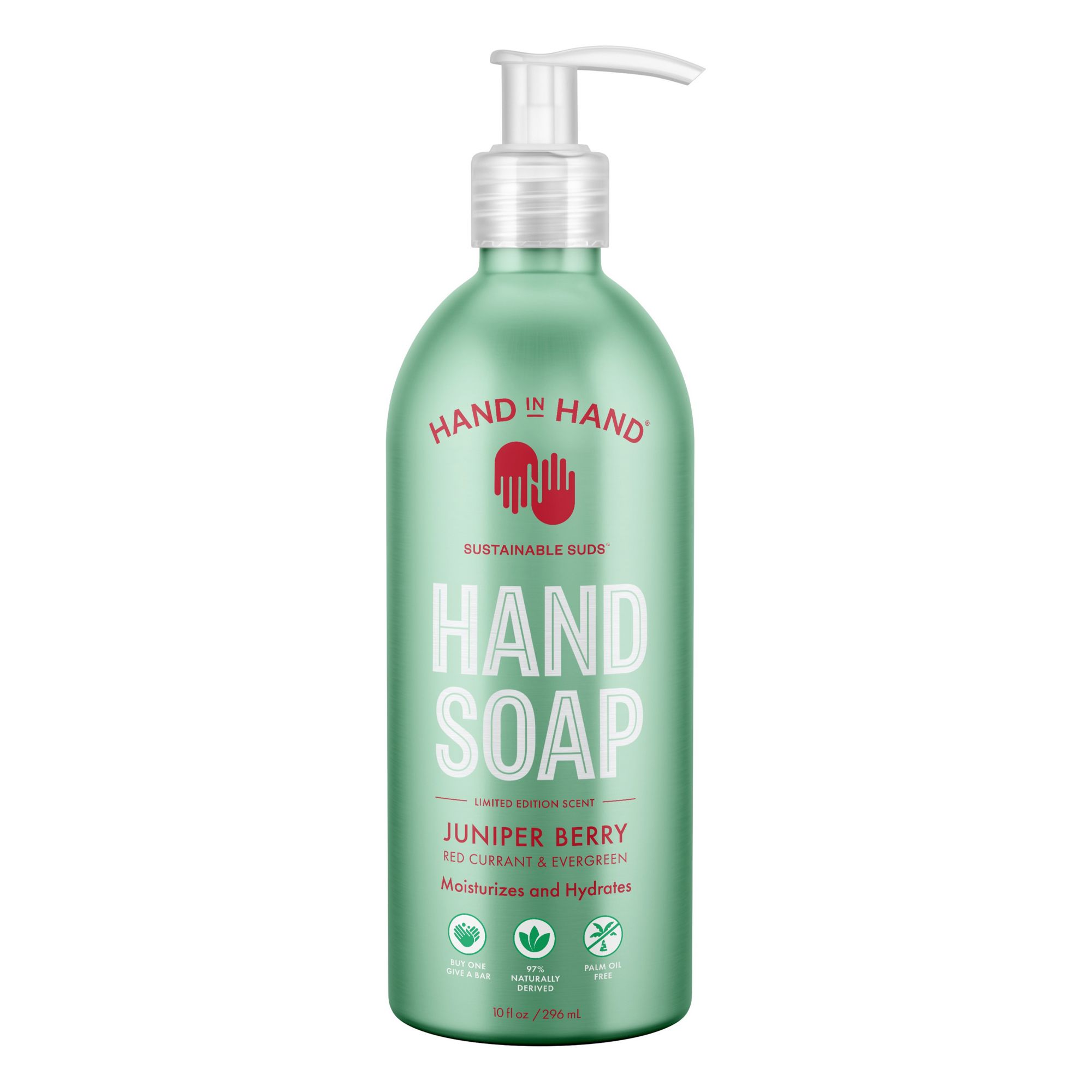 4-pk. Limited Edition 10 oz. Seasonal Hand Soaps, Almond Creme: Vanilla + Oat milk hand soap, spiced plum: pink peppercorn & ginger hand soap, juniper berry: evergreen & red currant hand soap, frosted pine: blue Cyprus & Cedar hand soap Variety Pack: Containing 4, 10 oz. hand soaps in limited edition seasonal scents Moisturizes & Hydrates Bottles are packaged in 100% infinitely recyclable aluminum 97%+ naturally derived For every pack purchased, Hand in Hand donates four bars of soap and clean water to children in need All of Hand in Hand products are palm oil-free, paraben-free, BHT-free, sulfate-free, SLS-free, EDTA-free and pegs-free, cruelty-free, and vegan