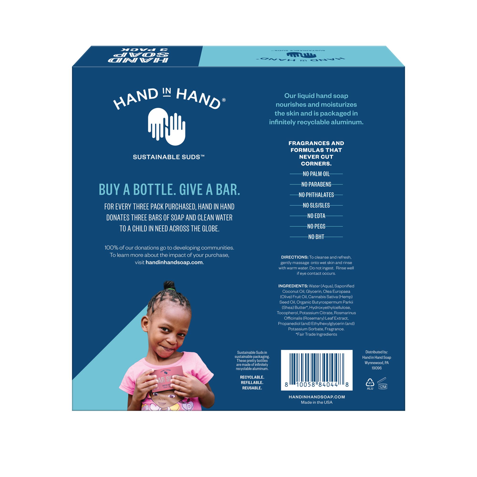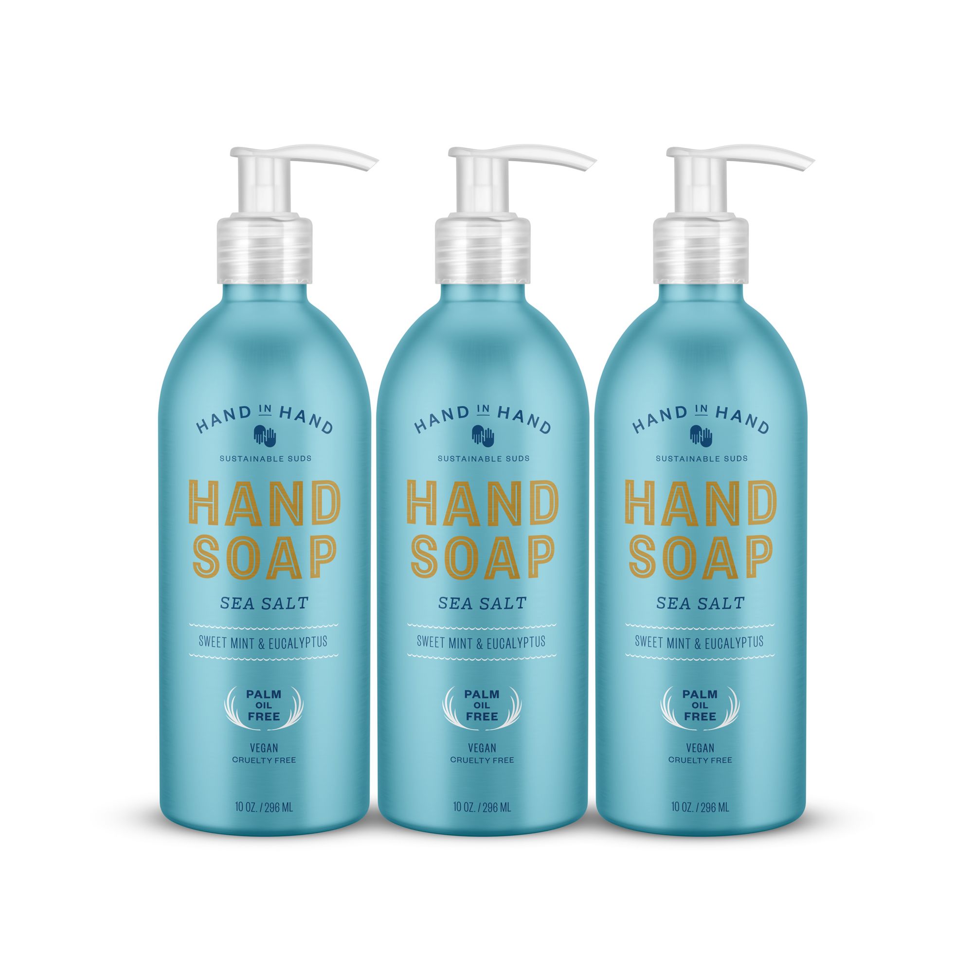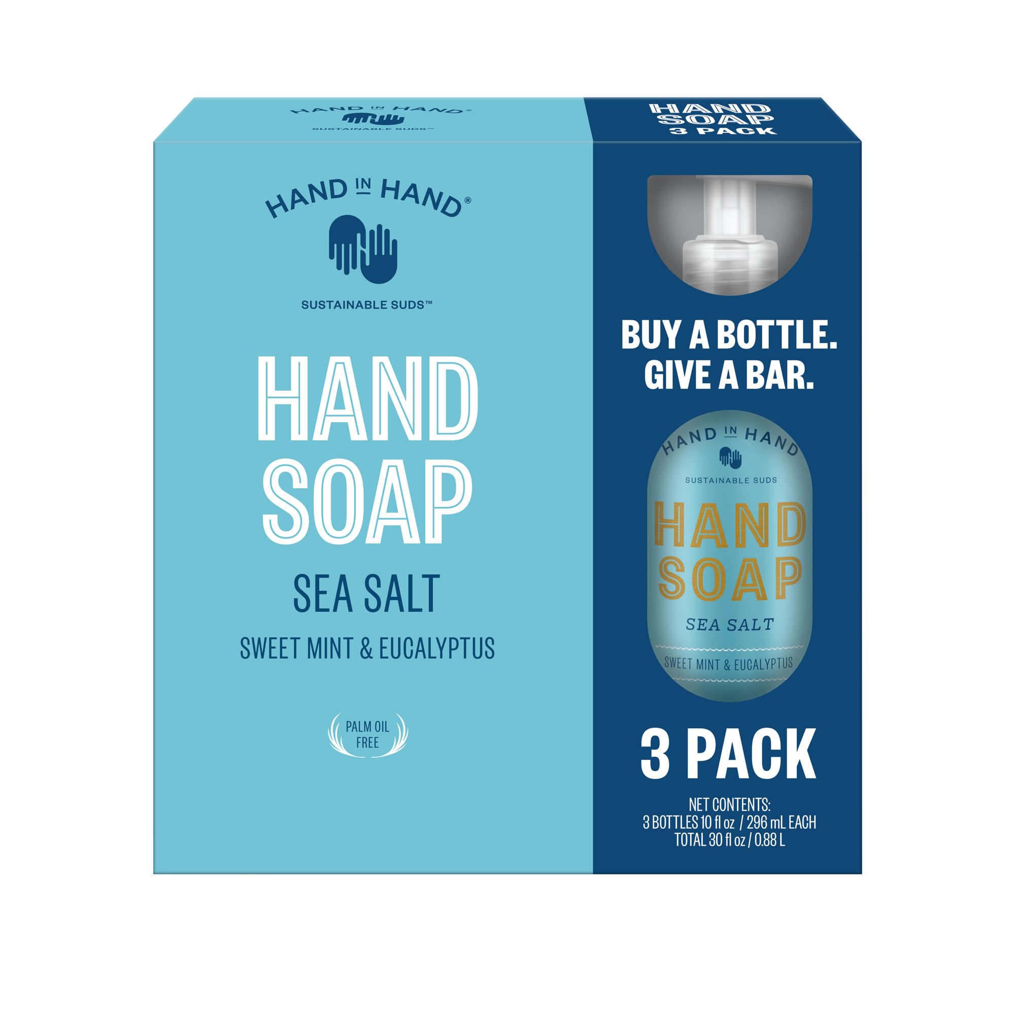 3 x 10 oz bottles of hand soap Sea Salt scent has an energizing and crisp blend of eucalyptus and sweet mint with notes of peppermint and cut spearmint leaves. So refreshing Palm Oil Free, Paraben Free, Cruelty Free Vegan Packaged in 100% infinitely recyclable aluminum For every liquid hand soap purchased, we donate one bar of soap and water to a child in need across the globe