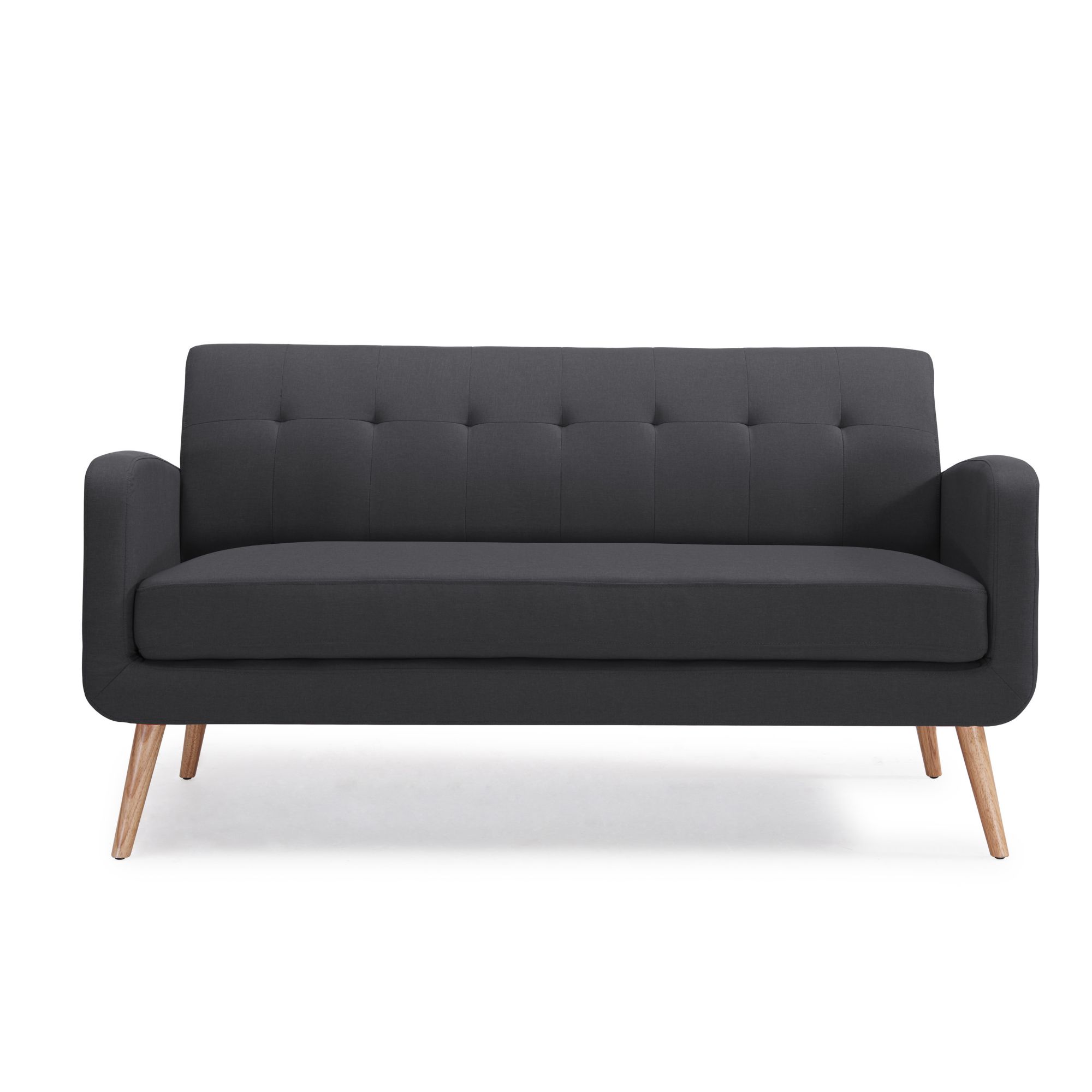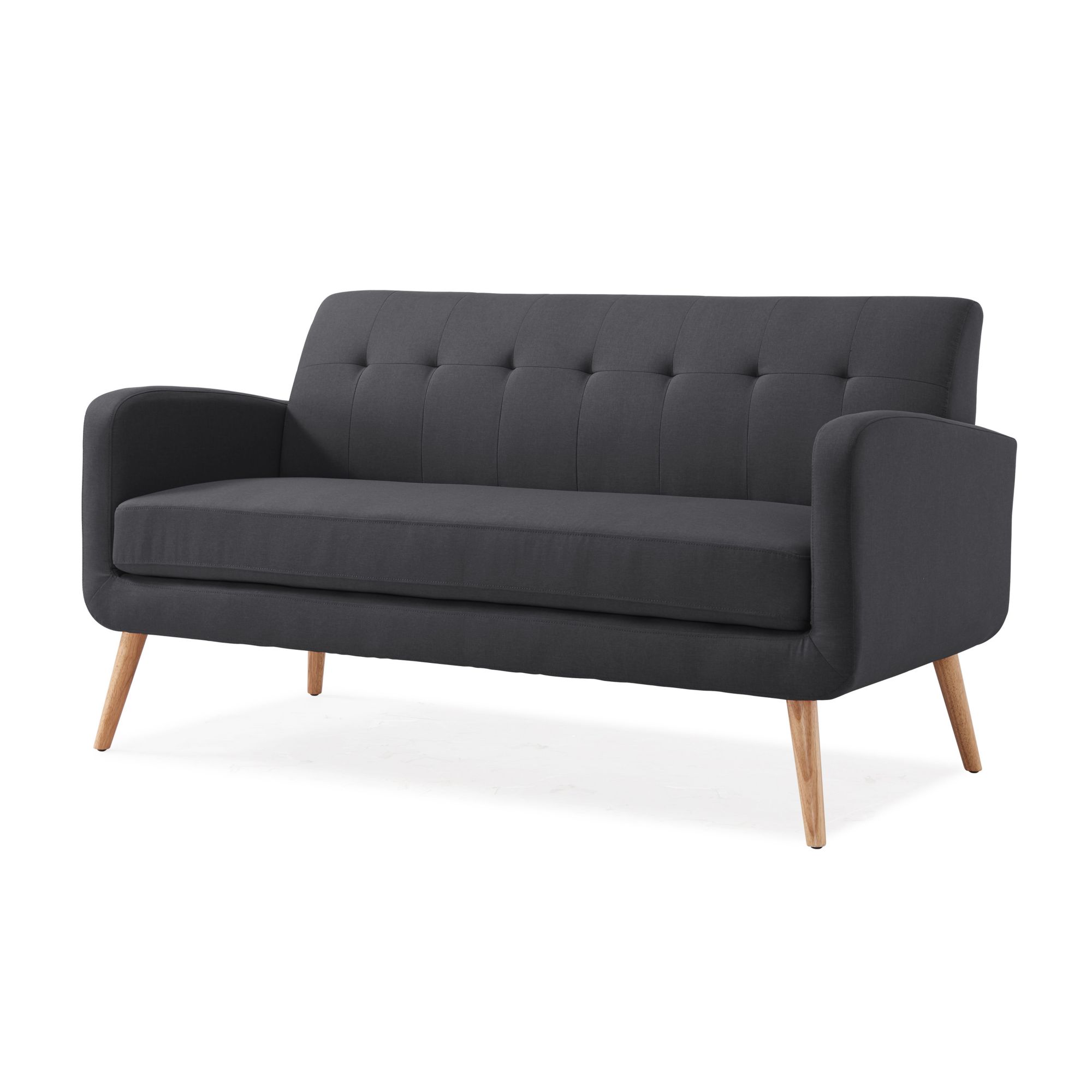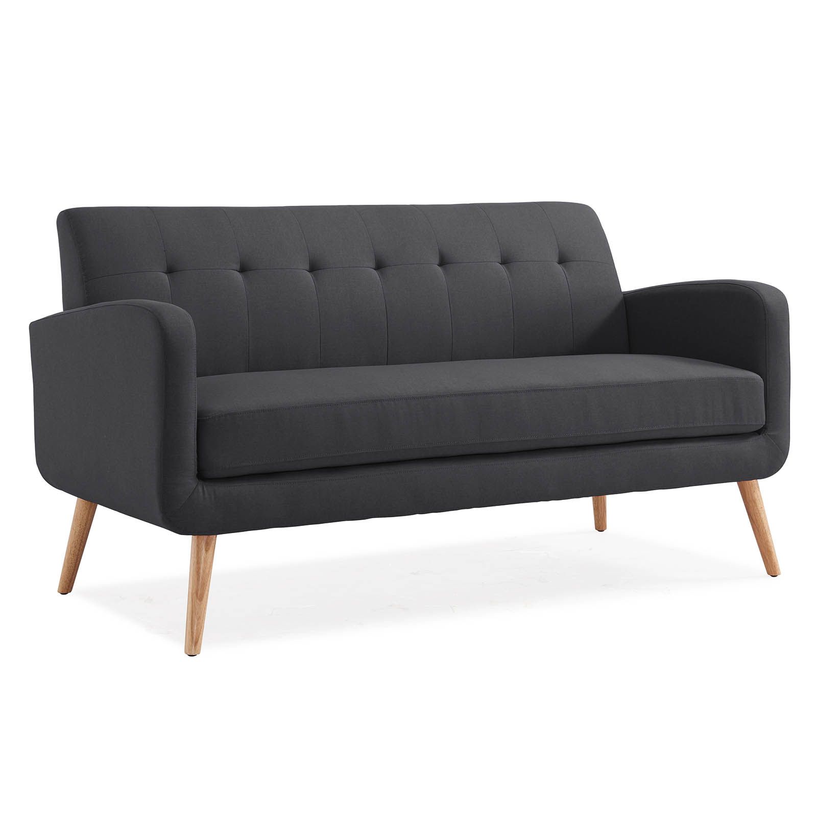 Solid wood legs with a natural finish Frame is made of engineered mixed hardwoods Charcoal black linen upholstery is made of 100% polyester Seat and back cushions are attached Pocketed coils and thick foam cushions help keep you comfortable Supports up to 600 lbs. evenly distributed HANDY LOCK technology allows easy assembly Includes sofa and assembly instructions Warranty: 1 year parts