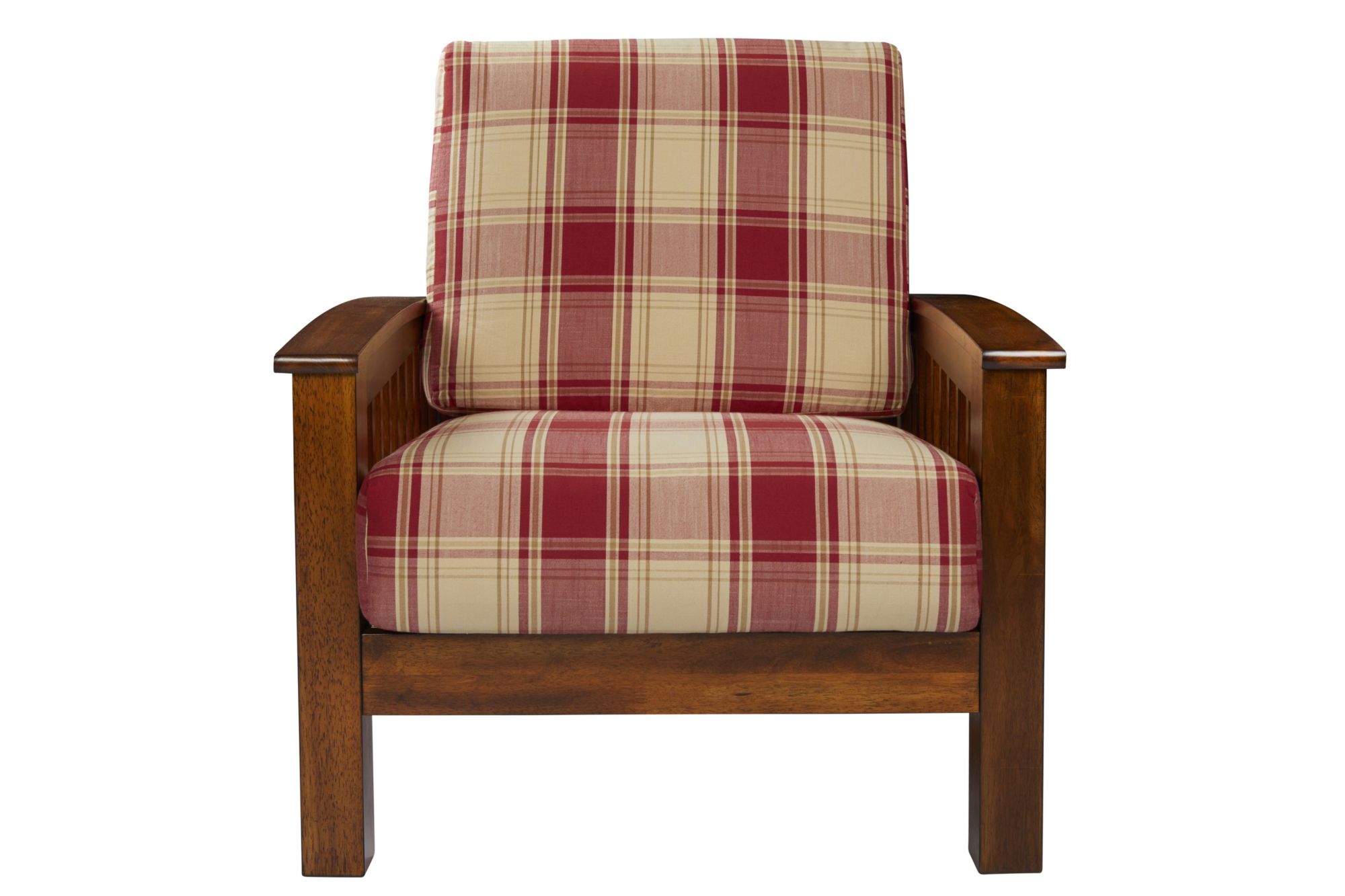 Armchair features comfortable box cushions on a wood exposed frame Sturdy solid wood frame features a slatted back and squared arms with slatted sides in a cherry finish Covered in a 40% cotton, 60% polyester red plaid woven fabric (spot clean only) Upholstered box seat cushions with plush foam and fiber fill Firm seating surface Seats up to 300 lbs. Takes less than 30 minutes to assemble with included instructions (Phillips screwdriver required, not included) Includes arm chair, cushions, instructions for assembly Warranty: 1 year parts only