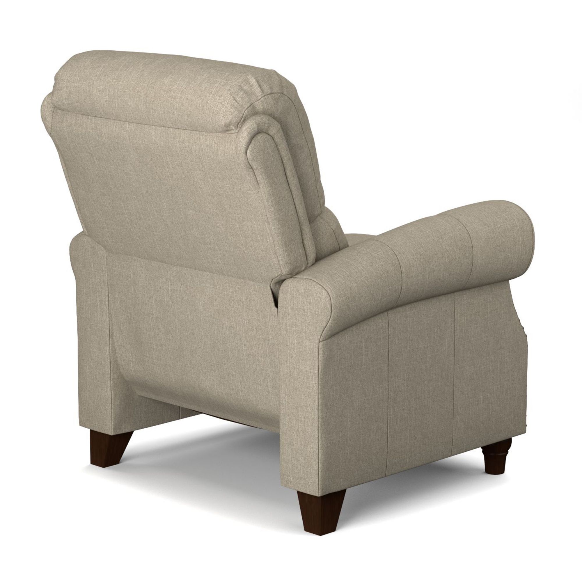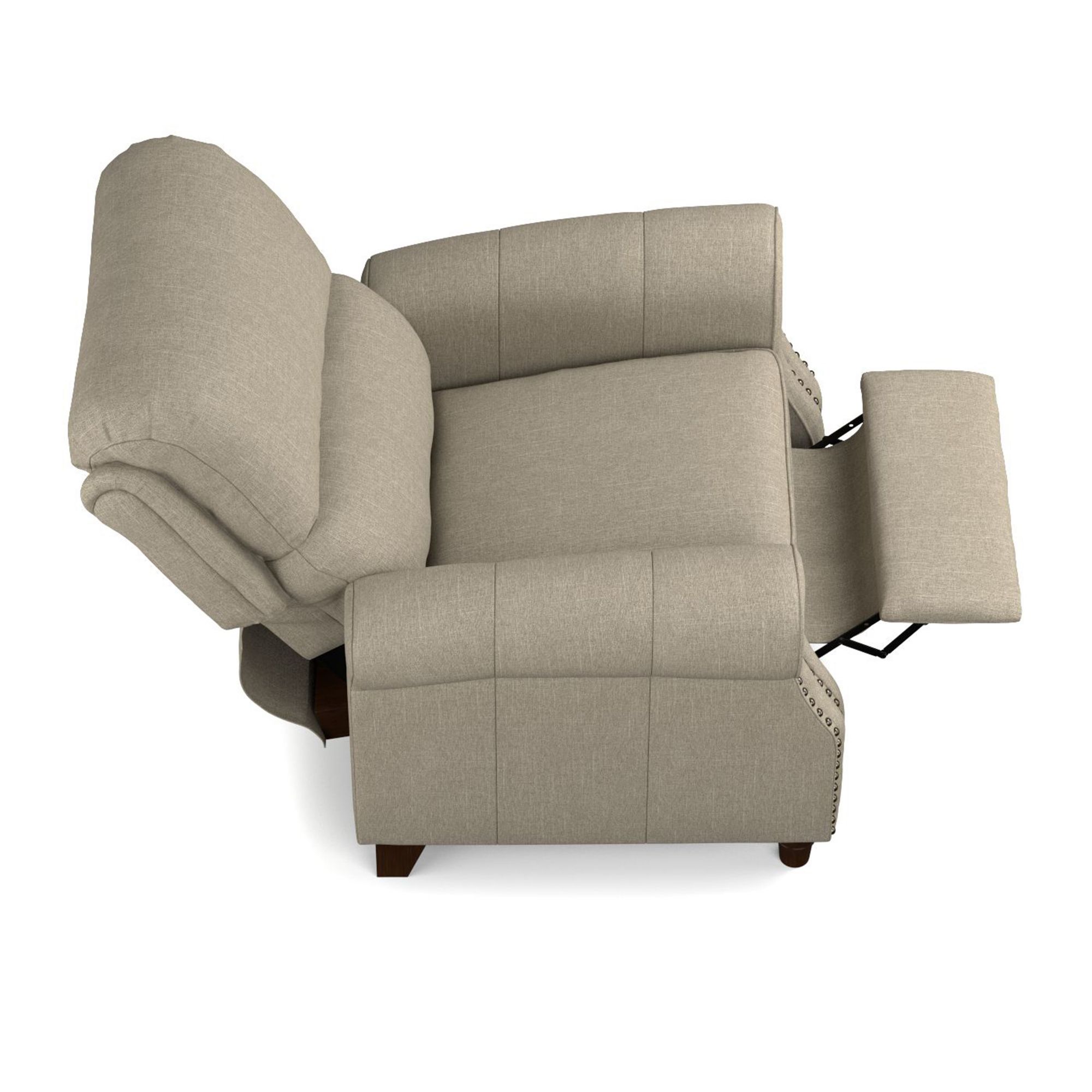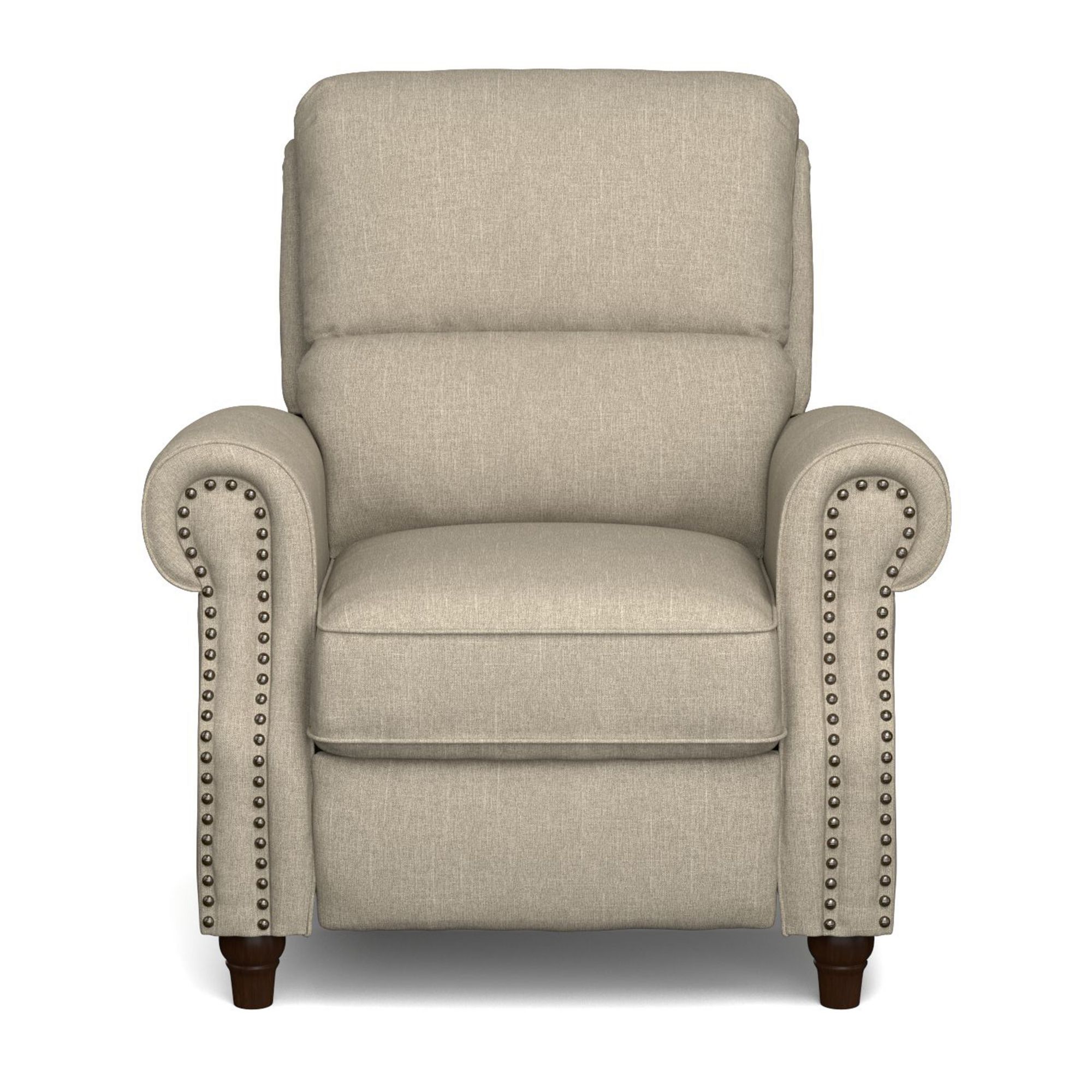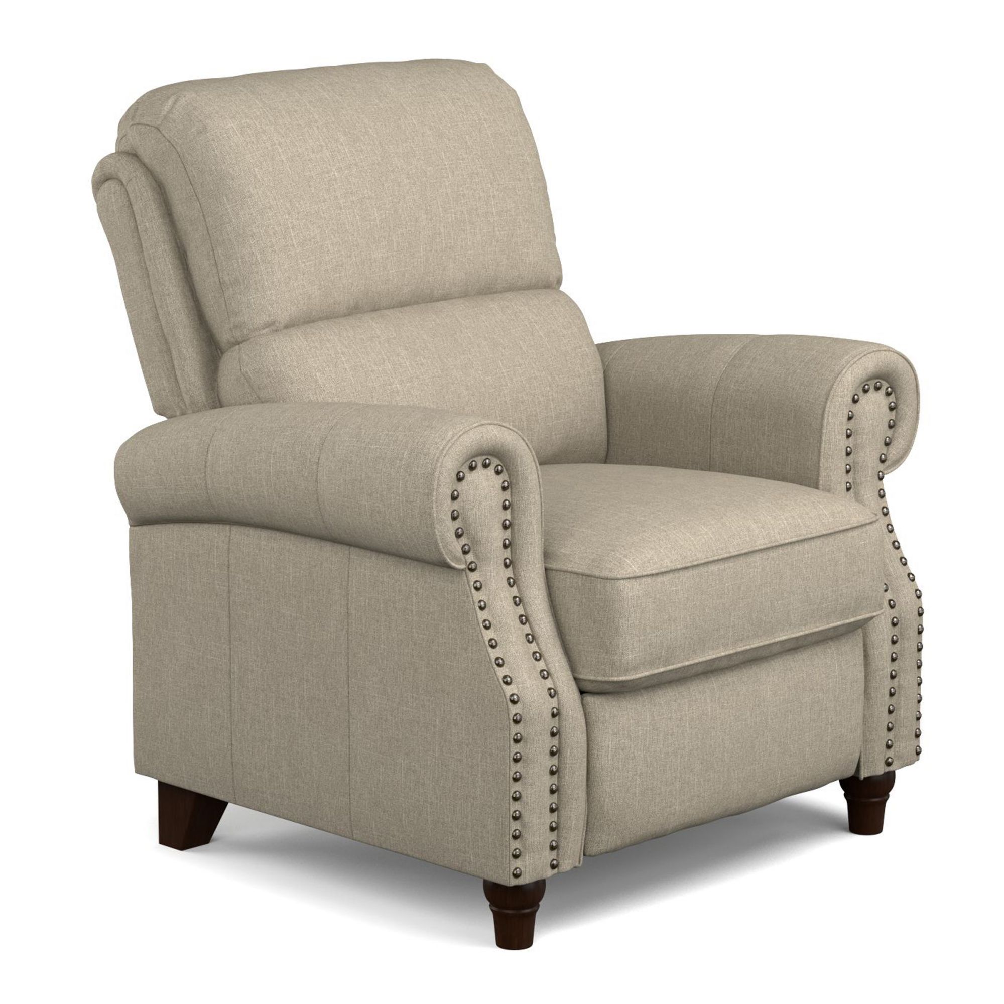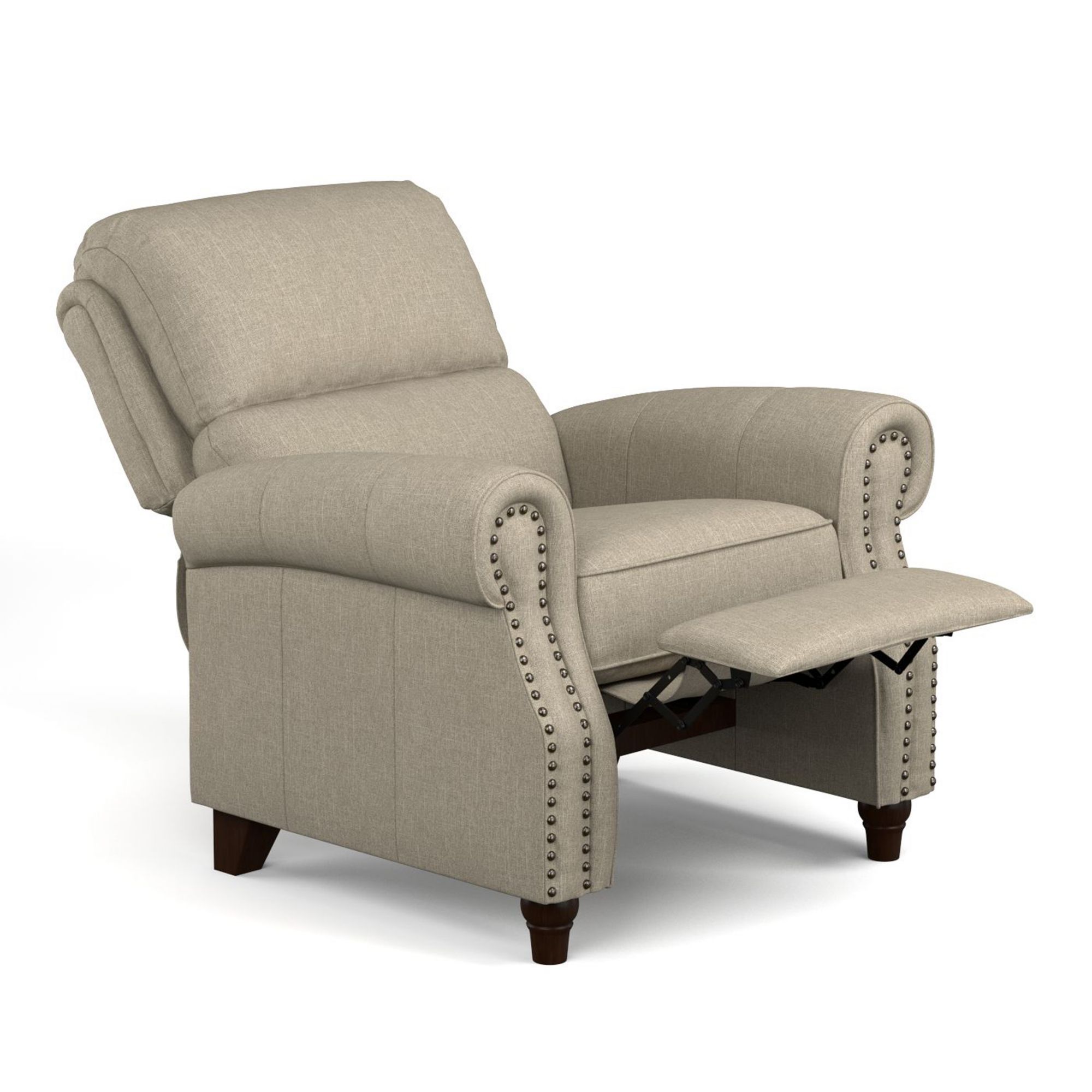 Sit back and relax in this set of two ProLounger rounded arm reclining chairs accented with hand-tacked antique bronze nail heads. Simply push back to recline, no levers or buttons required for comfortable long term sitting, TV viewing or a relaxed recline. The recliner features a comfortable, generously-sized seat, covered in a tan polyester linen-like fabric.