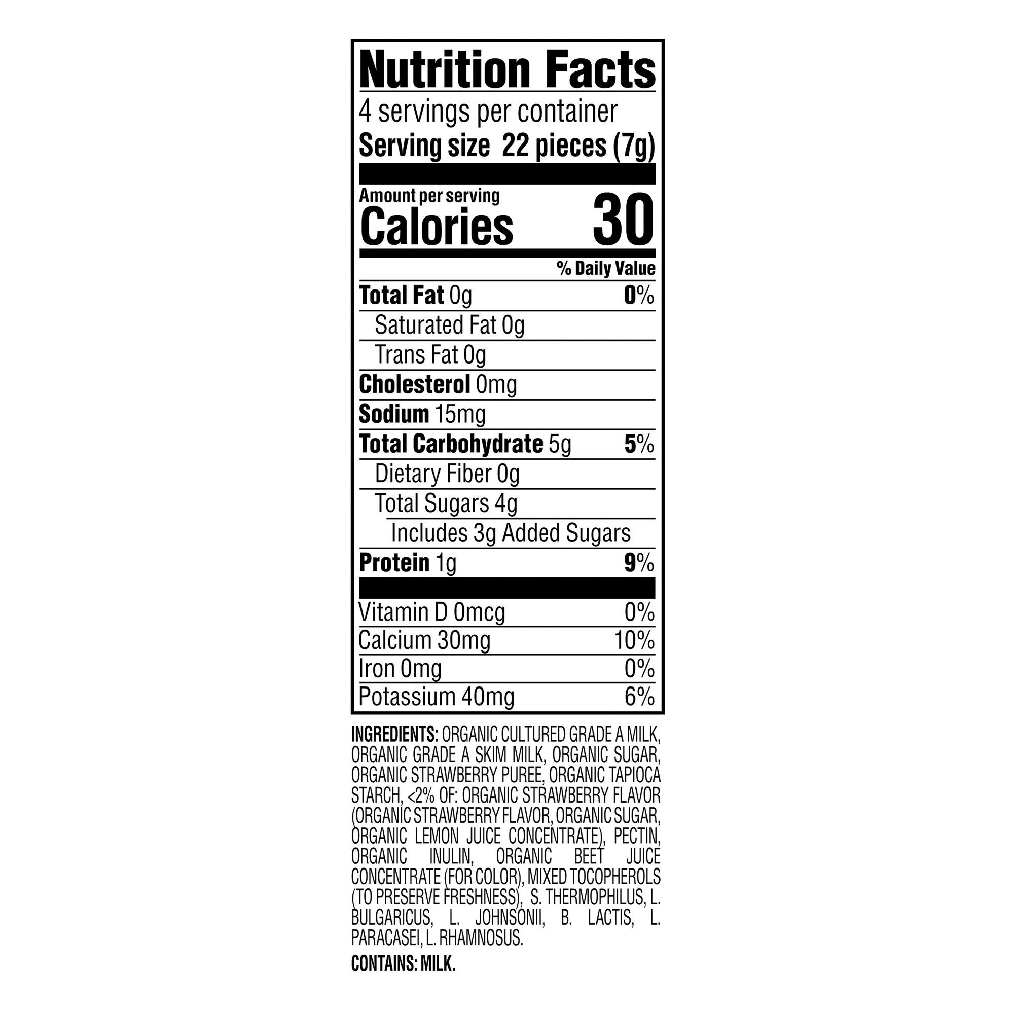 Ingredients: Mixed Berry: Organic Cultured Grade A Milk, Organic Grade A Skim Milk, Organic Sugar, Organic Tapioca Starch. Strawberry: Organic Cultured Grade A Milk, Organic Grade A Skim Milk, Organic Sugar, Organic Strawberry Puree, Organic Tapioca Starch.