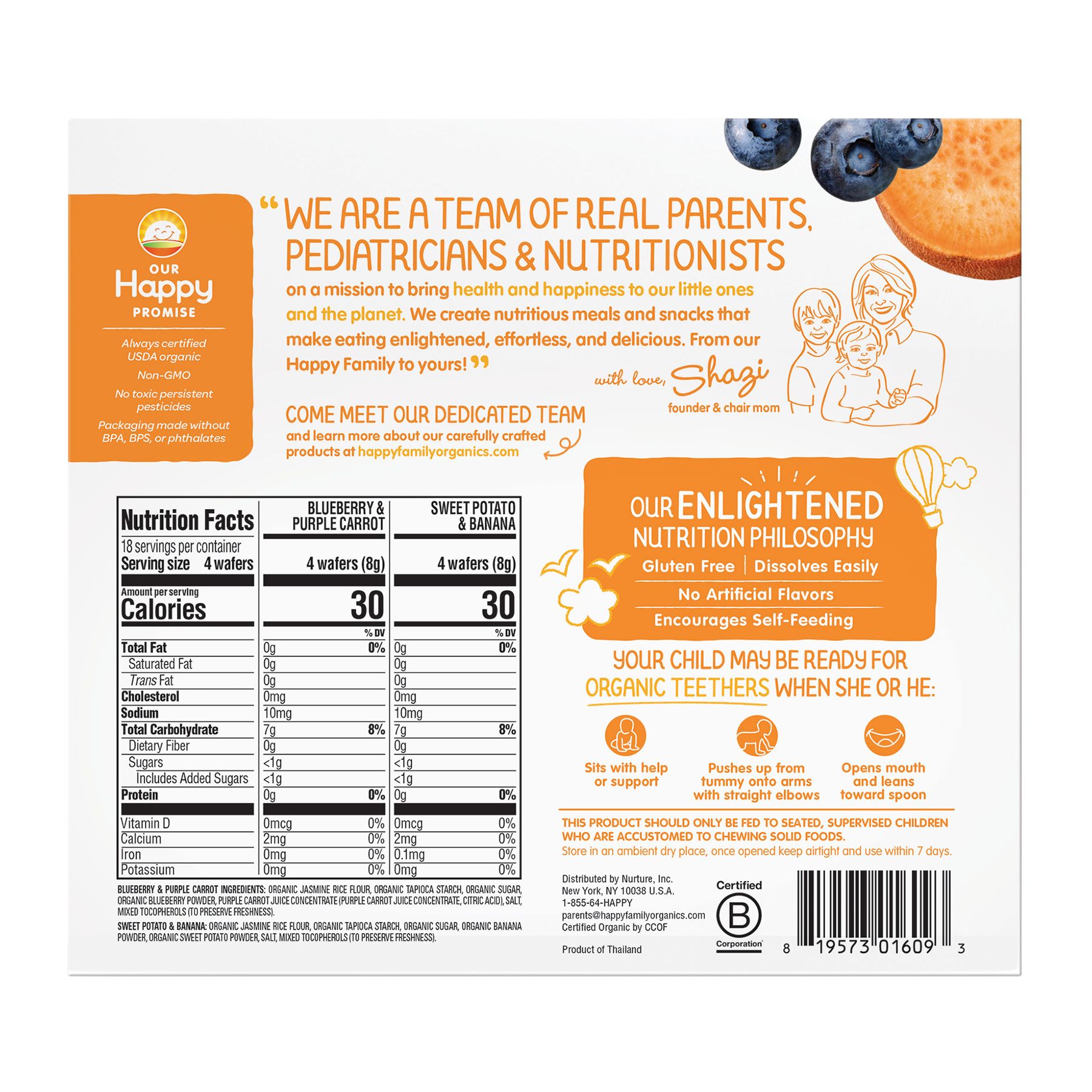 The perfect 1st snack for Baby’s developing gums, easily dissolving, organic teething wafers soothe and delight. They’re made with jasmine rice flour, a touch of organic fruits and vegetables, and contain no artificial flavors for truly happy smiles. Happy Baby's line of Stage 1 baby foods are designed for your baby's sensitive palate.