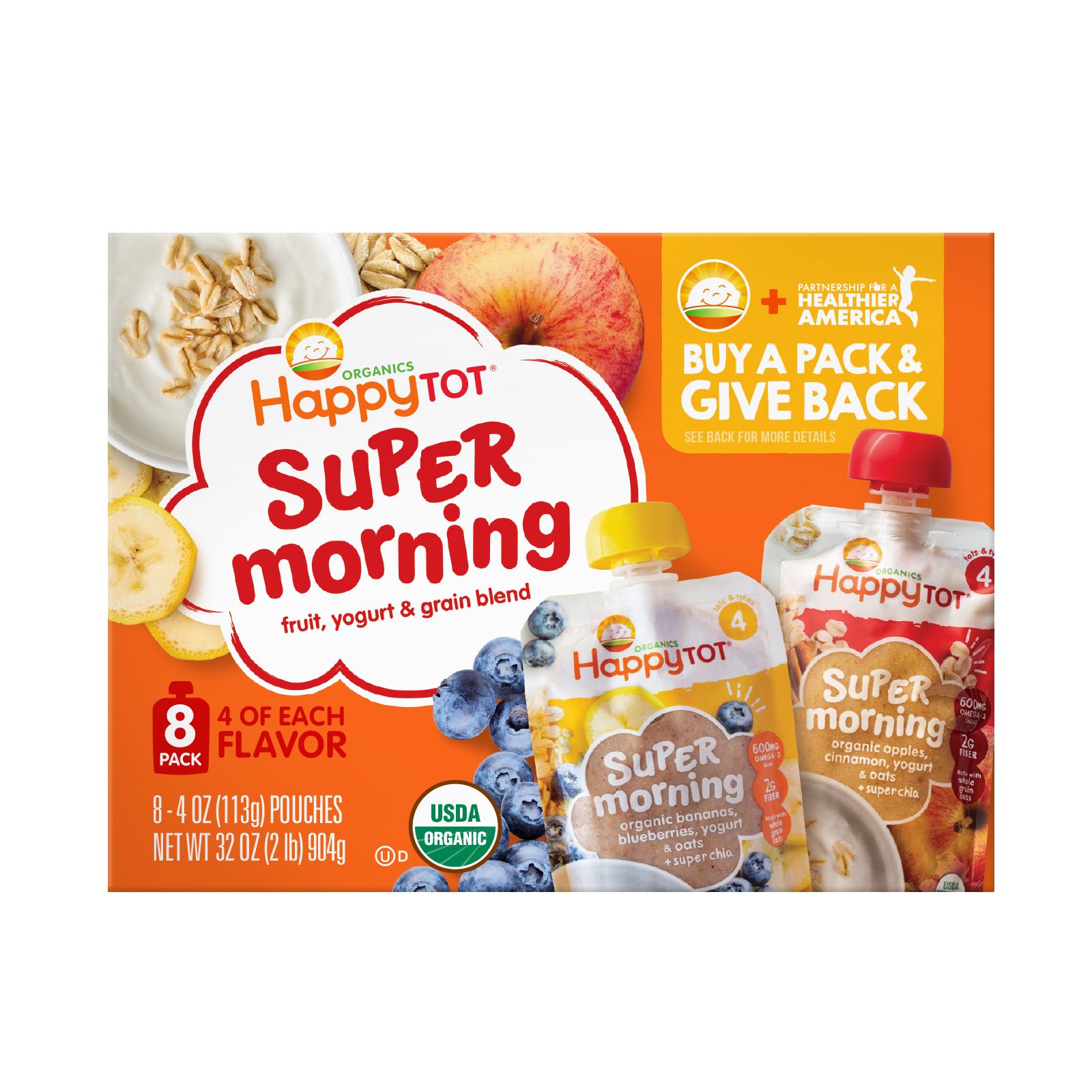 Best-selling organic apples, cinnamon, yogurt, oats & chia, and organic bananas, blueberries, yogurt, oats & chia Super Morning pouches are a yummy way to start your toddler’s day off with whole grain oats and 2g of fiber, plus you get to feel good knowing your purchase does well.