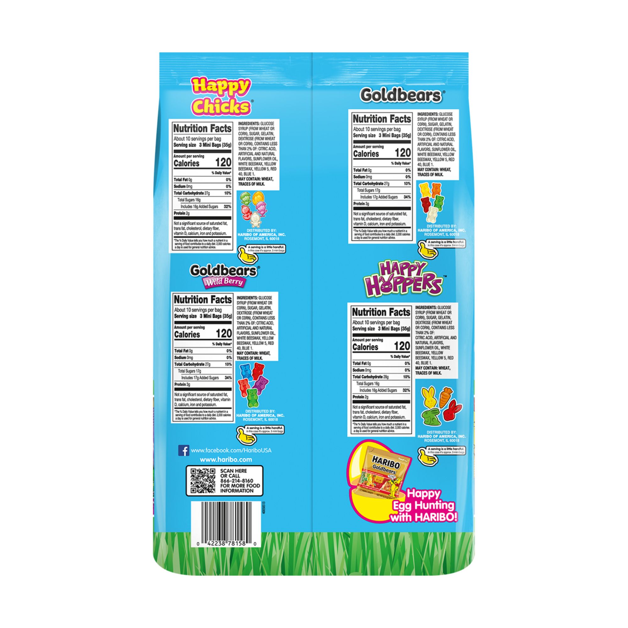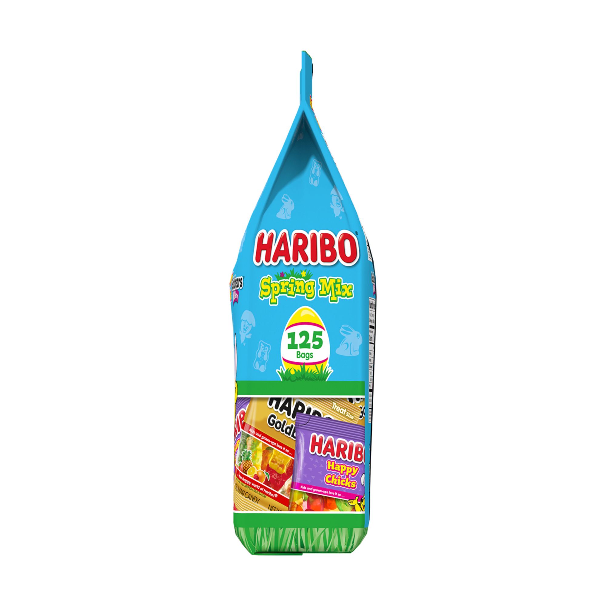 The Haribo Spring Mix 125 count variety bag includes 0.4 oz. bags of: Goldbears, Wildberry Goldbears, Happy Hoppers, Happy Chicks. Spring/Easter-ready: Ideal for egg hunts, baskets, or spring-themed goody bags. Convenient portions: Individually wrapped for grab-and-go enjoyment. Variety of tastes: A colorful mix of fruity and berry gummy shapes appealing to a broad audience.