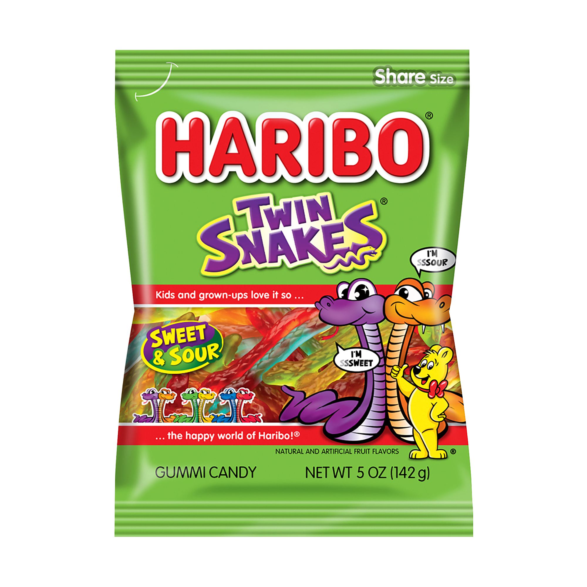 Haribo Twin Snakes are a delicious and fun treat that won't make your skin crawl! Haribo Twin Snakes Gummi Candy is not to be missed, with sweet and sour gummy flavors. Each bag contains about 18 pieces in the following flavor combinations: Sweet Cherry and Sour Orange, Sweet Apple and Sour Lemon, and Sweet Blueberry and Sour Blackcurrant.