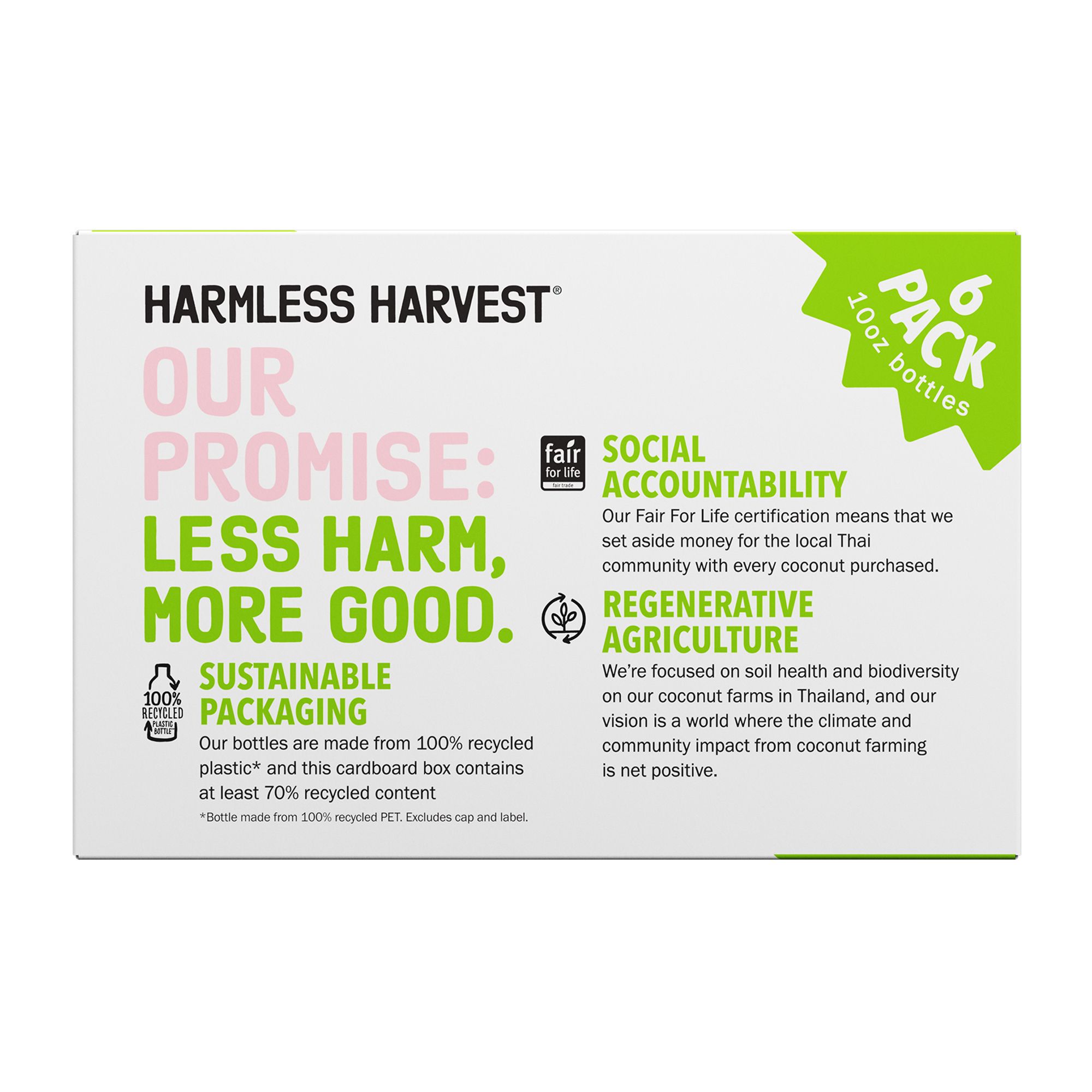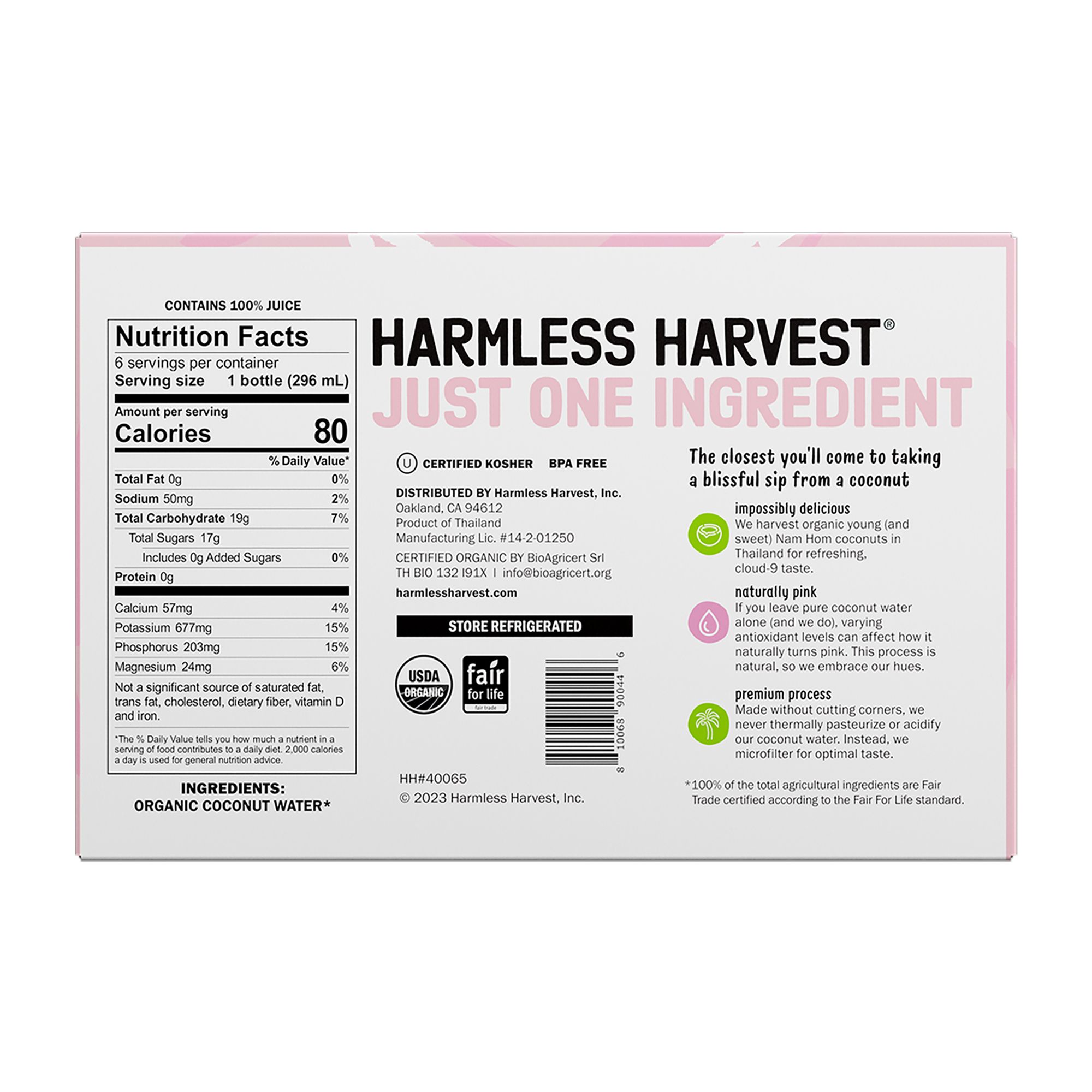 After many years of refining (their process - never the product) Harmless Harvest perfected their method to bottle this organic coconutty goodness. And now, as part of Harmless Harvest's commitment to doing less harm, more good, they are thrilled to say their bottles are made from 100% rPET (excluding the cap and label). To achieve peak deliciousness, Harmless Harvest starts with uniquely fragrant and tasty, organic, young Nam Hom coconuts grown in Thailand. With no extra ingredients, this 100% coconut water is the closest you can come to drinking straight from a coconut! (No mallet necessary.) Harmless Harvest keeps their bottling process as simple as possible to provide you with maximum benefits and exceptional taste. In addition to a clean, crisp taste, another signature of their organic coconut water is the color! Harmless Harvest's coconut water is totally clear when they bottle it, and afterward some bottles turn pink due to varying levels of antioxidants and interaction with elements such as light. Because they don’t use thermal pasteurization to process or acidify their coconut water (by adding ingredients like ascorbic acid), it tends to turn a pink hue over time. Instead of hiding this element by adding Vitamin C (ascorbic acid), Harmless Harvest chooses to embrace it! It’s totally natural, and they think - adorable. And if your bottles arrive clear, don’t worry - they'll still have that same great taste you’re familiar with. With so many benefits and unmatched taste, Harmless Harvest is positive that no matter how or where you choose to enjoy their Original Organic Coconut Water, you’ll crave it just as much as they do.