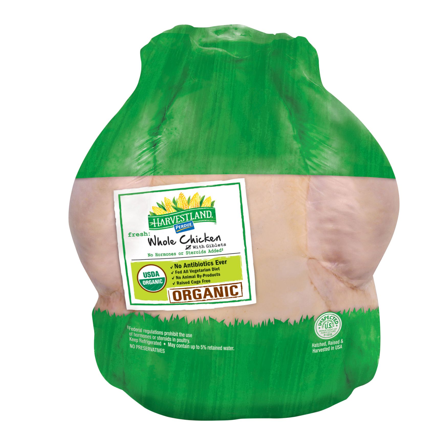 USDA organic Non-GMO project verified No antibiotics Fed an all-vegetarian diet No animal byproducts Raised cage-free No hormones or steroids added Includes 1 organic whole chicken, approx. 5 lbs. If not satisfied, Harvestland will offer a full refund