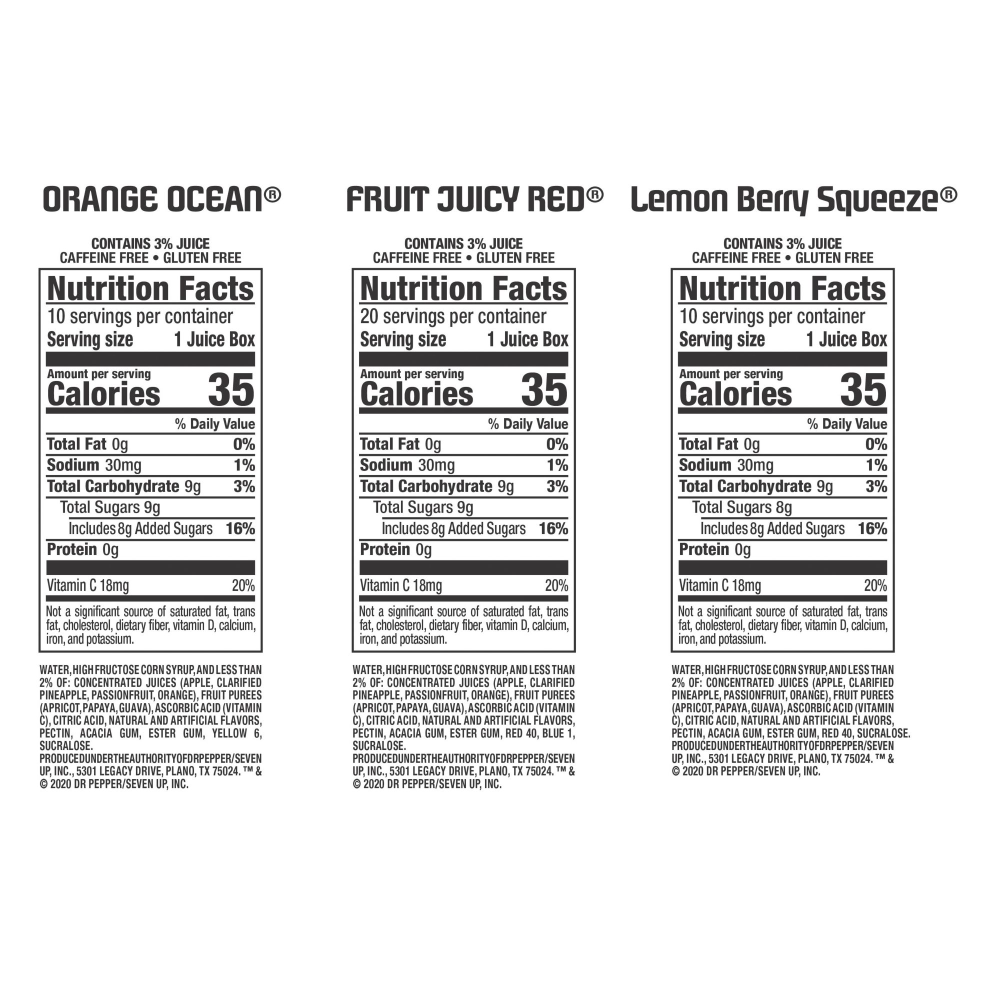 Ingredients: Orange Ocean: Water, High Fructose Corn Syrup, And Less Than 2% Of: Concentrated Juices (Apple, Clarified Pineapple, Passionfruit, Orange), Fruit Purees (Apricot, Papaya, Guava), Ascorbic Acid (Vitamin C), Citric Acid, Natural And Artificial Flavors, Pectin, Acacia Gum, Ester Gum, Yellow 6, Sucralose Fruit Juicy Red: Water, High Fructose Corn Syrup, And Less Than 2% Of: Concentrate Juices (Apple, Clarified Pineapple, Passionfruit, Orange), Fruit Purees (Apricot, Papaya, Guava), Ascorbic Acid (Vitamin C), Citric Acid, Natural And Artificial Flavors, Pectin, Acacia Gum, Ester Gum, Red 40, Blue 1, Sucralose Lemon Berry Squeeze: Water, High Fructose Corn Syrup, And Less Than 2% Of Concentrated Juices (Apple, Clarified Pineapple, Passionfruit, Orange), Fruit Purees (Apricot, Papaya, Guava), Ascorbic Acid (Vitamin C), Citric Acid, Natural And Artificial Flavors, Pectin, Acacia Gum, Ester Gum, Red 40, Sucralose.