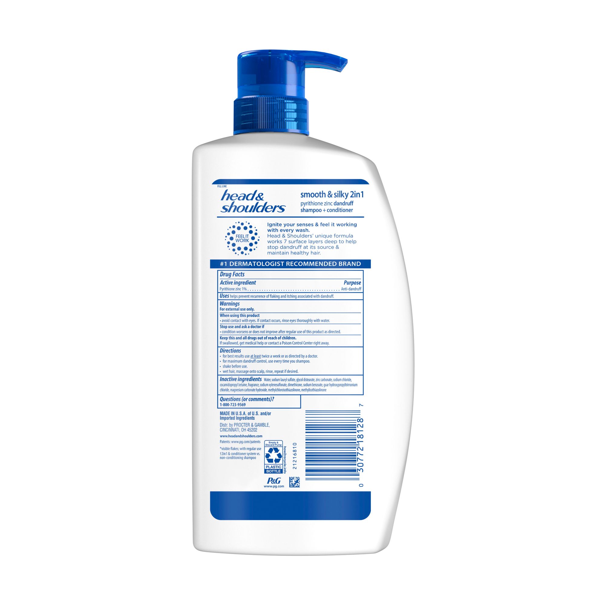 Looking for a 2-in-1 shampoo that leaves your hair smooth, moisturized and up to 100% flake-free?* Look no further than Head and Shoulders Smooth and Silky 2-in-1 Shampoo. Head and Shoulders Smooth and Silky 2-in-1 Shampoo nourishes hair with intense moisture and leaves hair sleek, shining and free of frizz for 24 hours. Plus, Head and Shoulders is the number one anti-dandruff shampoo recommended by dermatologists, so you know your hair will be up to 100% flake-free.* Ignite your senses and feel it working with every wash with the rich lather and floral scent of Head and Shoulders Smooth and Silky. Head and Shoulders' unique formula works 7 surface layers deep in your scalp to help stop dandruff at its source and maintain healthy hair. Head and Shoulders Smooth and Silky works to prevent dryness, flakes and itch, associated with dandruff. With a pH-balanced formula brought to you by America's #1 dermatologist-recommended brand, you can count on Head and Shoulders to combat seborrheic dermatitis and other irritable and itchy scalp conditions associated with dandruff. The unique formula, with zinc pyrithione, delivers multiple benefits: Fights dryness, calms itching and relieves irritation+, Reduces redness†, controls oiliness††, removes flakes† ††.