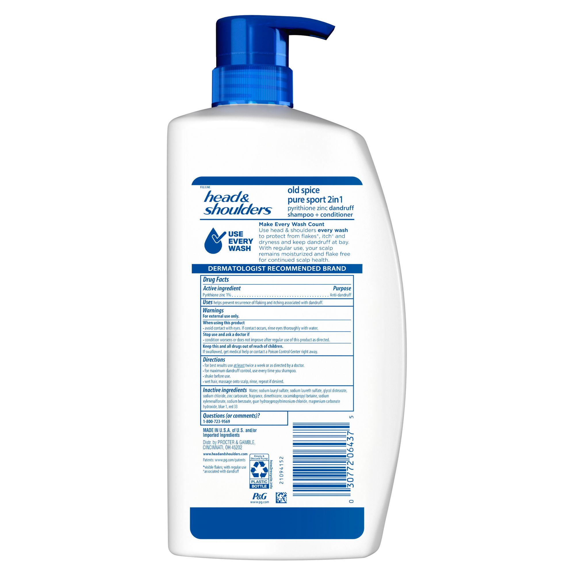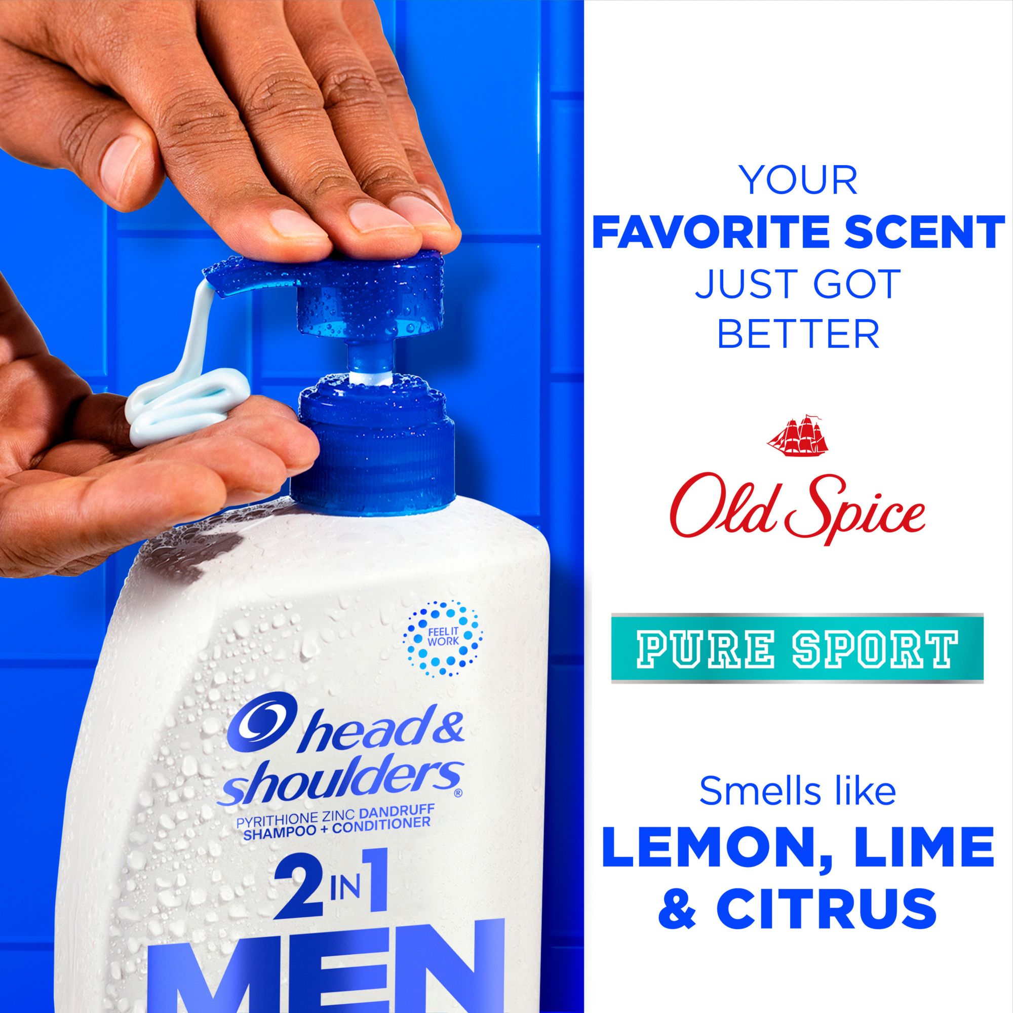 Ever find yourself wanting to fight dandruff and smell better at the same time, but finding it to be an impossible task? Get the best of both worlds with Head and Shoulders Old Spice Pure Sport Men’s Anti-Dandruff 2-in-1 Shampoo and Conditioner. This dandruff shampoo doesn't just help protect your scalp - it smells incredible, too. With Head & Shoulders Old Spice Pure Sport's Men's Anti-Dandruff Shampoo and Conditioner, your shower experience just got more enjoyable. Ignite your senses and feel it working with every wash. Head and Shoulders’ unique formula works seven surface layers deep in your scalp to help stop dandruff at its source and maintain healthy hair. Brought to you by America’s #1 dermatologist-recommended anti-dandruff brand, this formula is gentle enough on hair for everyday use, but powerful enough to stop the toughest flakes.* With regular use, your scalp remains moisturized and flake free for continued scalp health. Plus, it leaves your hair with the clean, lemon-lime scent of Old Spice Pure Sport, for a double dose of heavenly smelling, dandruff-fighting confidence. Use Head & Shoulders every wash to protect from flakes*, itch+ and dryness and keep dandruff at bay. The unique formula, with zinc pyrithione, delivers multiple benefits: fights dryness*, calms itching*, relieves irritation*, reduces redness*, controls oiliness†, removes flakes**.