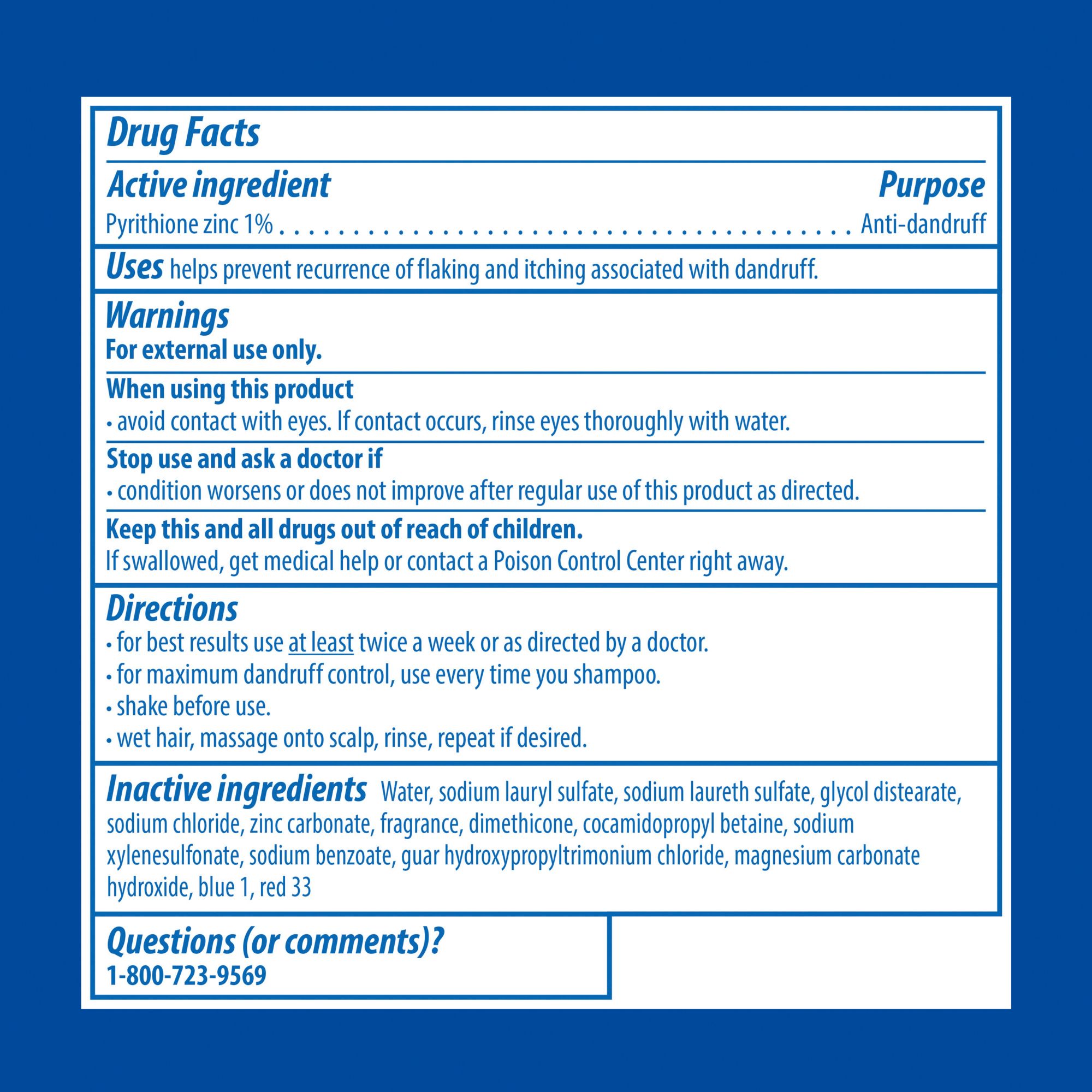 Ingredients: Active ingredient: Pyrithione Zinc 1%Inactive ingredients: Water, Sodium Lauryl Sulfate, Sodium Laureth Sulfate, Glycol Distearate, Sodium Chloride, Zinc Carbonate, Fragrance, Dimethicone, Cocamidopropyl Betaine, Sodium Xylenesulfonate, Sodium Benzoate, Guar Hydroxypropyltrimonium Chloride, Magnesium Carbonate Hydroxide, Blue 1, Red 33.