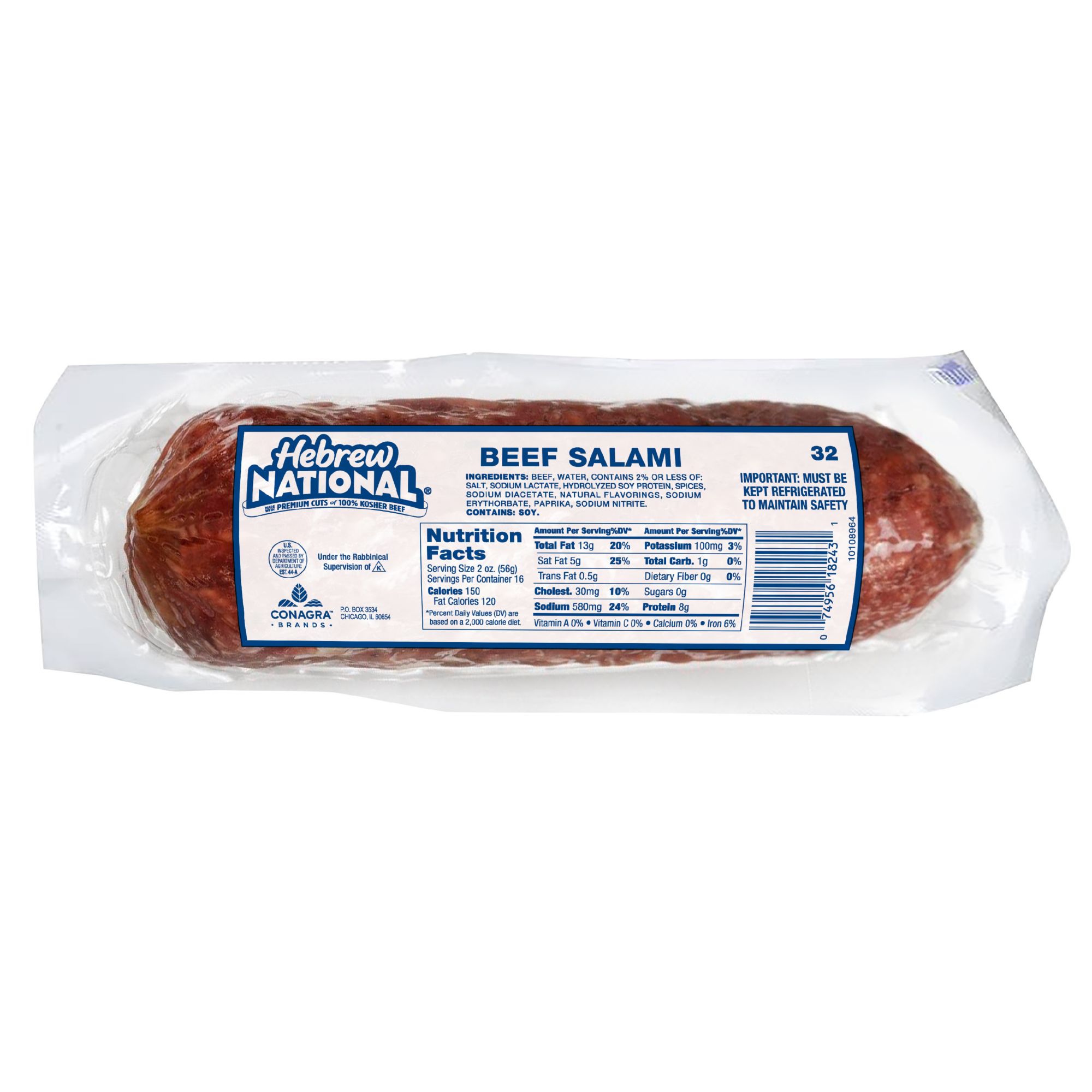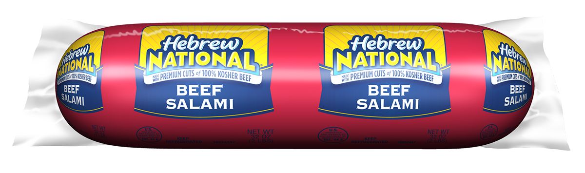 Made out of 100% kosher beef, Hebrew National 32 Oz. Beef Salami can be enjoyed on sandwiches, salads and plenty more. The dry texture and spicy, boldly seasoned flavor offer a satisfying taste with any meal. The premium cuts contain no byproducts and no artificial flavors or colors