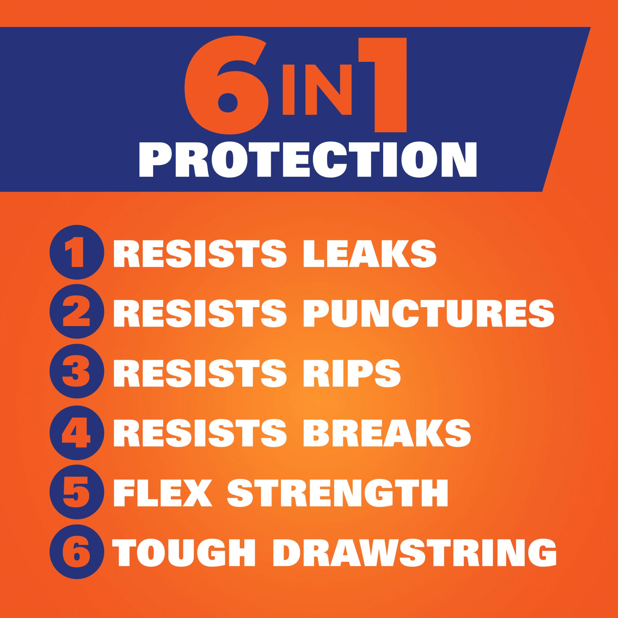 As versatile as they are reliable, Hefty Ultra Strong Extra Large Trash Bags let you do more with less effort. Equipped with 6-in-1 protection, these tough Hefty 33-gallon trash can liners offer flex strength, a tough drawstring, odor control, and resistance to punctures, leaks, and tears. Made with Hefty! Hefty! Hefty! strength & extra-large capacity, these extra strong trash can liners are ideal for keeping curbside carts & oversized kitchen cans clean, or for big cleanup jobs. When it comes time to take your trash to the curb, you can rely on the durable, break-resistant drawstring & thick, puncture-resistant plastic to carry it all. Don’t forget: Hefty trash bags are backed by a 100% satisfaction guarantee.