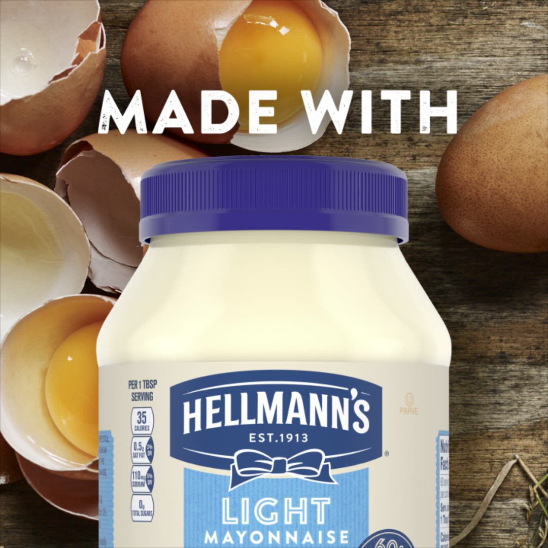 Enjoy the delicious, light and creamy taste of America’s #1 Light mayonnaise! With 100% cage-free eggs, 35 calories per tablespoon and 3.5g of fat per serving, Hellmann’s Light Mayonnaise Sandwich Spread has less than half the fat and calories but all the rich, creamy flavor of Hellmann’s Real. And people really love its taste: Hellmann’s Light Mayonnaise Condiment won a national blind taste test of leading brands among people with a preference. It’s so good most people can’t tell the difference versus regular mayonnaise. However, we know that to really "Bring Out The Best," we need to do more than just taste great. That’s why our delicious Blue Ribbon Quality Mayonnaise Dressing is made with 100% cage-free eggs, oil and vinegar sourced from trusted American farms. Even after 100 years, we’re still committed to using premium ingredients to craft the highest quality mayonnaise, sandwich spreads and condiments. In fact, we use 100% cage-free eggs and are committed to 100% responsibly sourced soybean oil. Our deliciously creamy light mayo is a good Source of Omega 3-ALA (contains 230mg ALA per serving, which is 14% of the 1.6g Daily Value for ALA) and is also gluten-free and certified kosher. It is the ideal condiment for spreading on sandwiches and wraps, grilling juicy burgers, mixing creamy dips, and preparing fresh salads and simple meals. Use it to make outrageously delicious (and nutritious!) dishes like our Spinach & Almond Crusted Chicken, Black Bean & Corn Salsa and Spinach and Lemon Crusted Dill Cod. Hellmann’s is known as Best Foods West of the Rockies. Discover our recipes, products, information about our sourcing, and more on our website, Hellmanns.com.