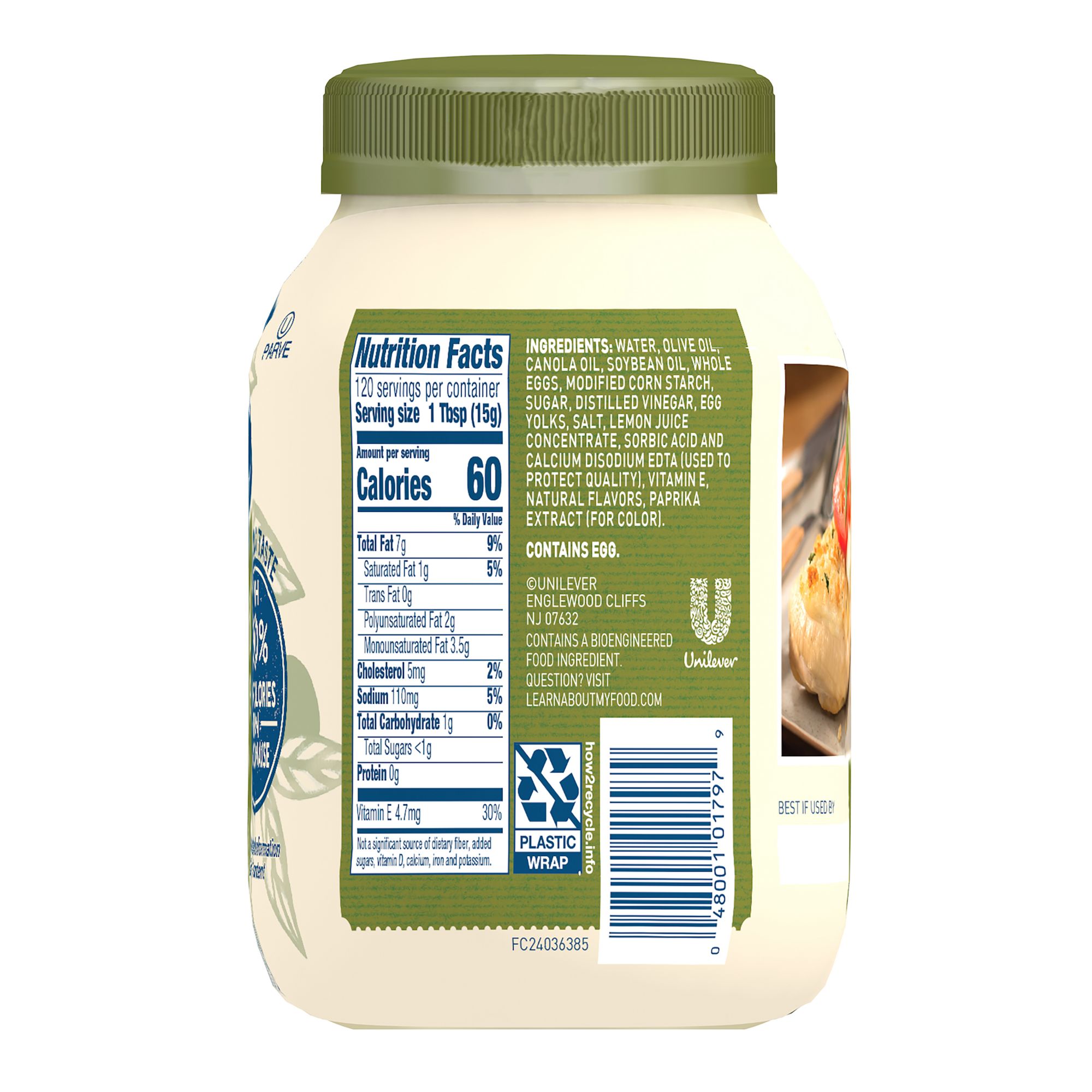 Hellmann's Mayonnaise Dressing with Olive Oil combines the creamy, rich taste you love from Hellmann's with the delicious goodness of olive oil. It's simple. Only the finest quality ingredients – like cage free eggs, responsibly sourced oils and vinegar – make it into Hellmann's Mayonnaise Dressing with Olive Oil. Hellmann’s Mayonnaise Dressing with Olive Oil is an excellent source of Omega 3 ALA (contains 310mg ALA per serving, which is 19% of the 1.6g daily value for ALA), with 0g of trans fat per serving, and is also gluten-free and certified kosher. This olive oil mayo is the perfect condiment for spreading on sandwiches and wraps, grilling juicy burgers, baking flavorful fish, mixing creamy dips, and preparing simple meals. Hellmann’s is known as Best Foods West of the Rockies. Discover Hellmann's recipes, products, information about their souring, and more on their website, Hellmanns.com.