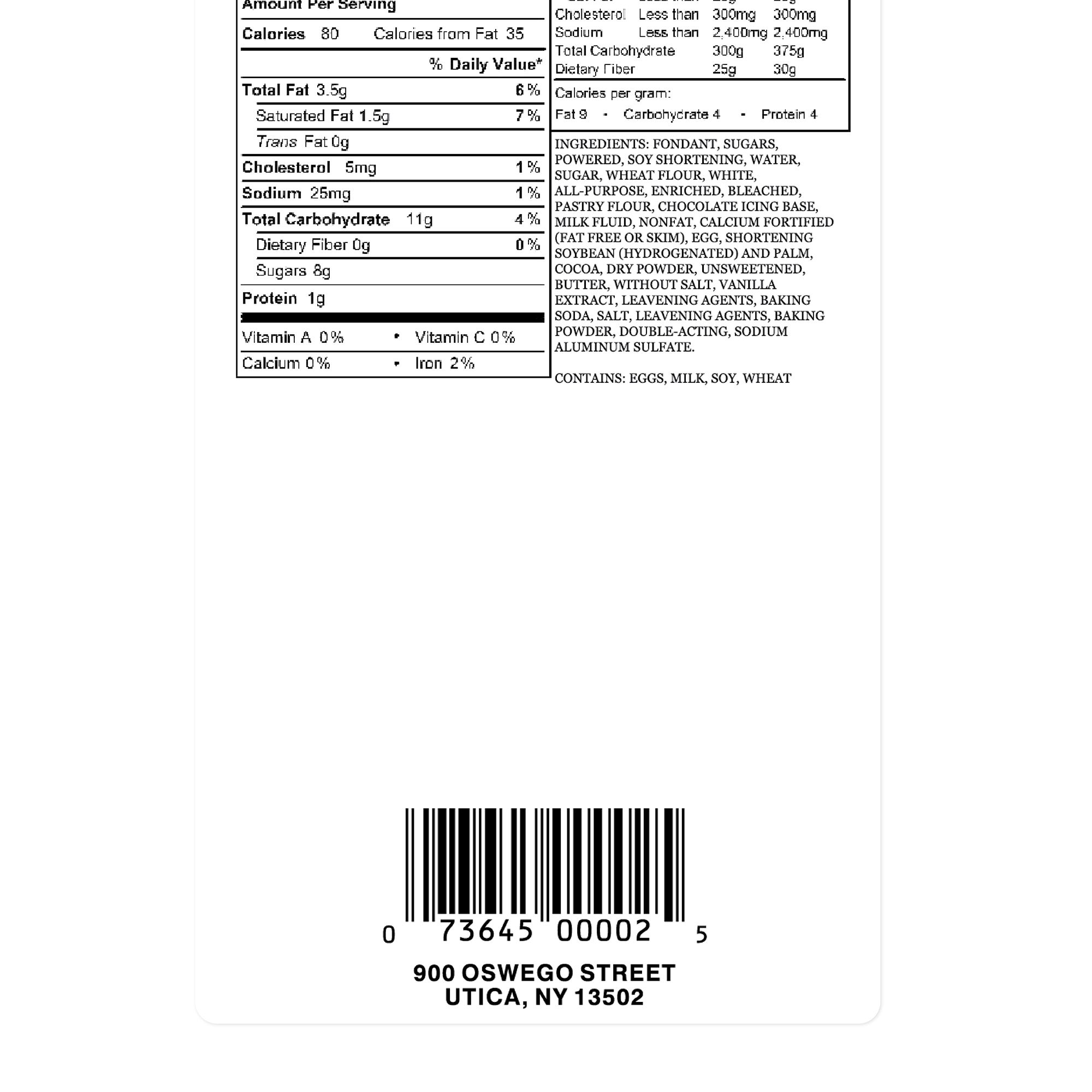 Ingredients: Fondant, Sugars, Powered, Soy Shortening, Water, Sugar, Wheat Flour, White, All-Purpose, Enriched, Bleached, Pastry Flour, Chocolate Icing Base, Milk Fluid, Nonfat, Calcium Fortified (Fat-free or Skim), Egg, Shortening Soybean (hydrogenated) and Palm, Cocoa, Dry Powder, Unsweetened, Butter, Without Salt, Vanilla Extract, Leavening Agents, Baking Soda, Salt, Leavening Agents, Baking Powder, Double-Acting, Sodium Aluminum Sulfate. contains: eggs, milk, soy, wheat