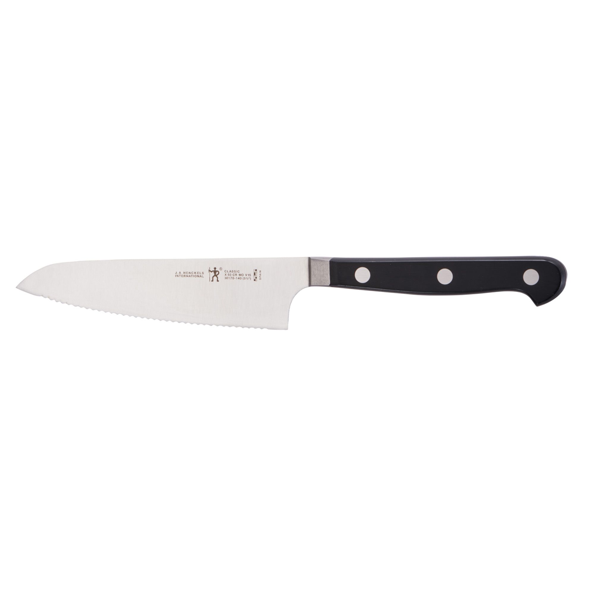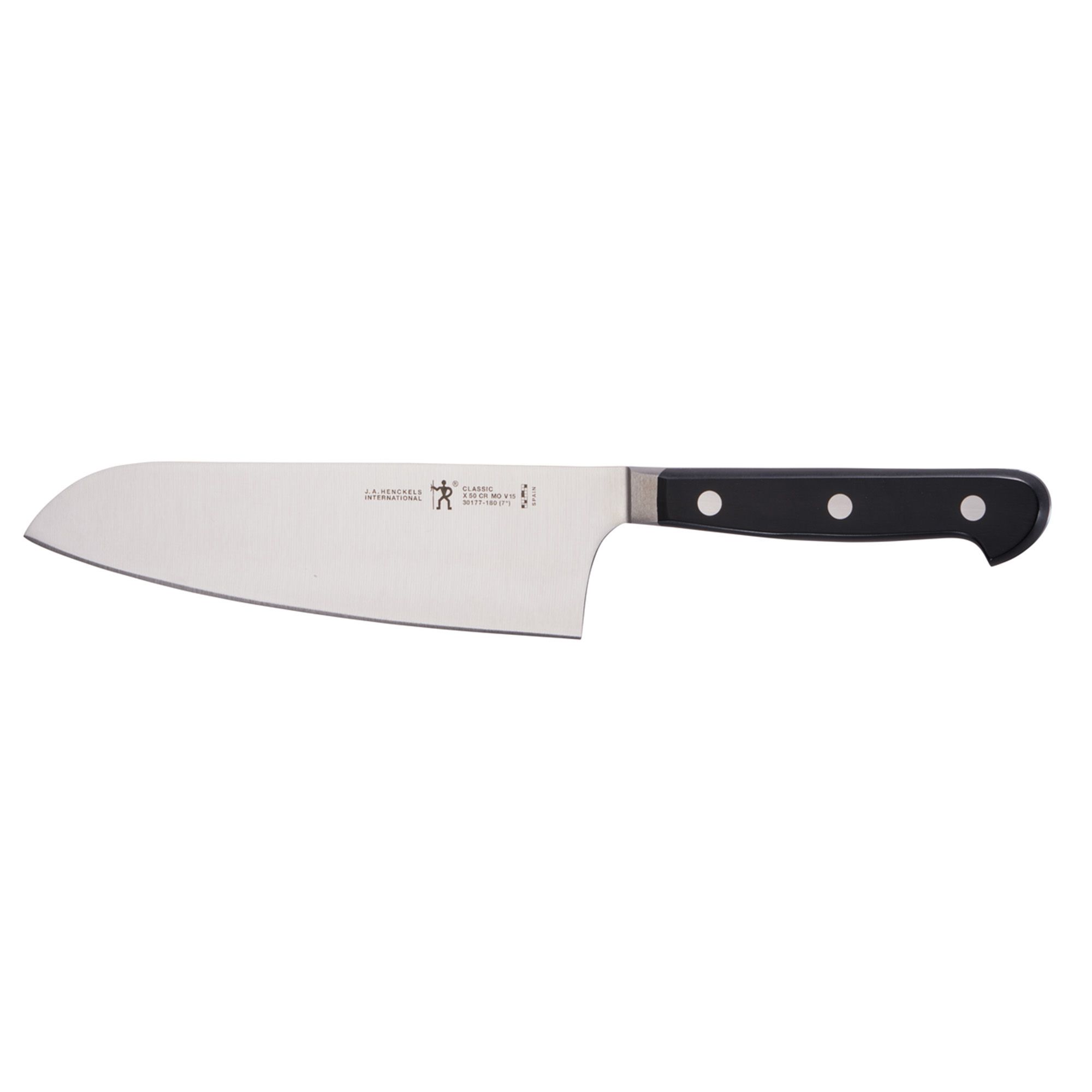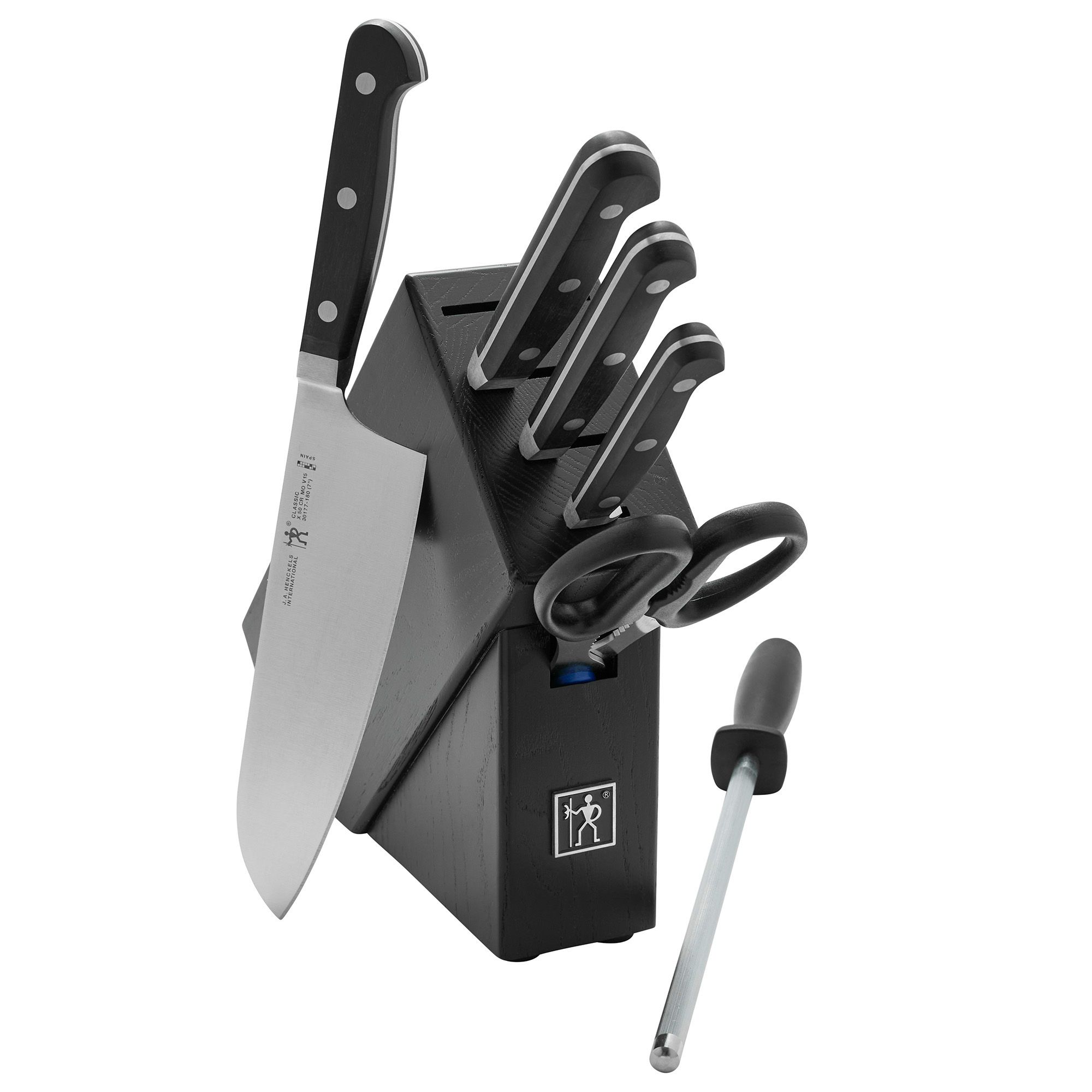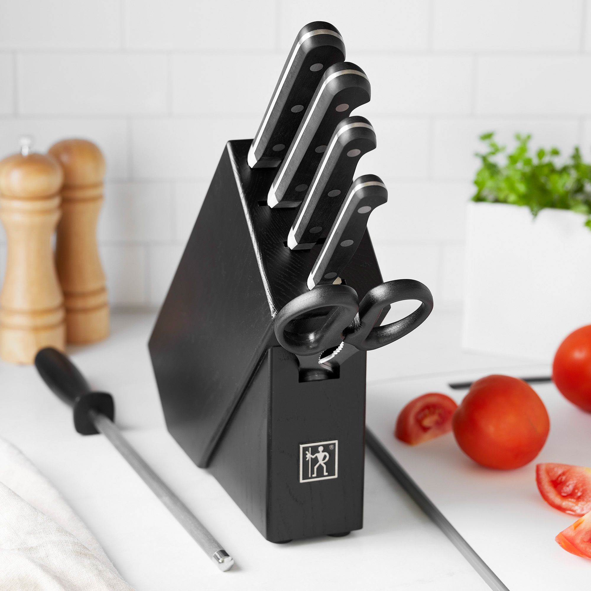 The Henckels Classics 7-Piece Block Set boasts a slimline profile, ideal for smaller kitchens and apartment living. The 7" chef’s knife is perfect for everyday kitchen tasks like chopping leafy greens and dicing onions. The 4" paring knife is ideal for detailed, in-hand work, while the 5.5" prep knife is great for both prepping in-hand or on a cutting board. High-quality German stainless steel strengthens these durable, Spanish-made knives. With a seamless transition from blade to handle, Classic knives' fully forged construction provides balance as the traditional triple-rivet handles encourage tireless cutting. These satin-finished blades are conveniently dishwasher safe. This set includes a 4" paring knife, 5.5" serrated prep knife, 6" nakiri, 7" chef’s knife, honing steel, and 6-slot black knife block.