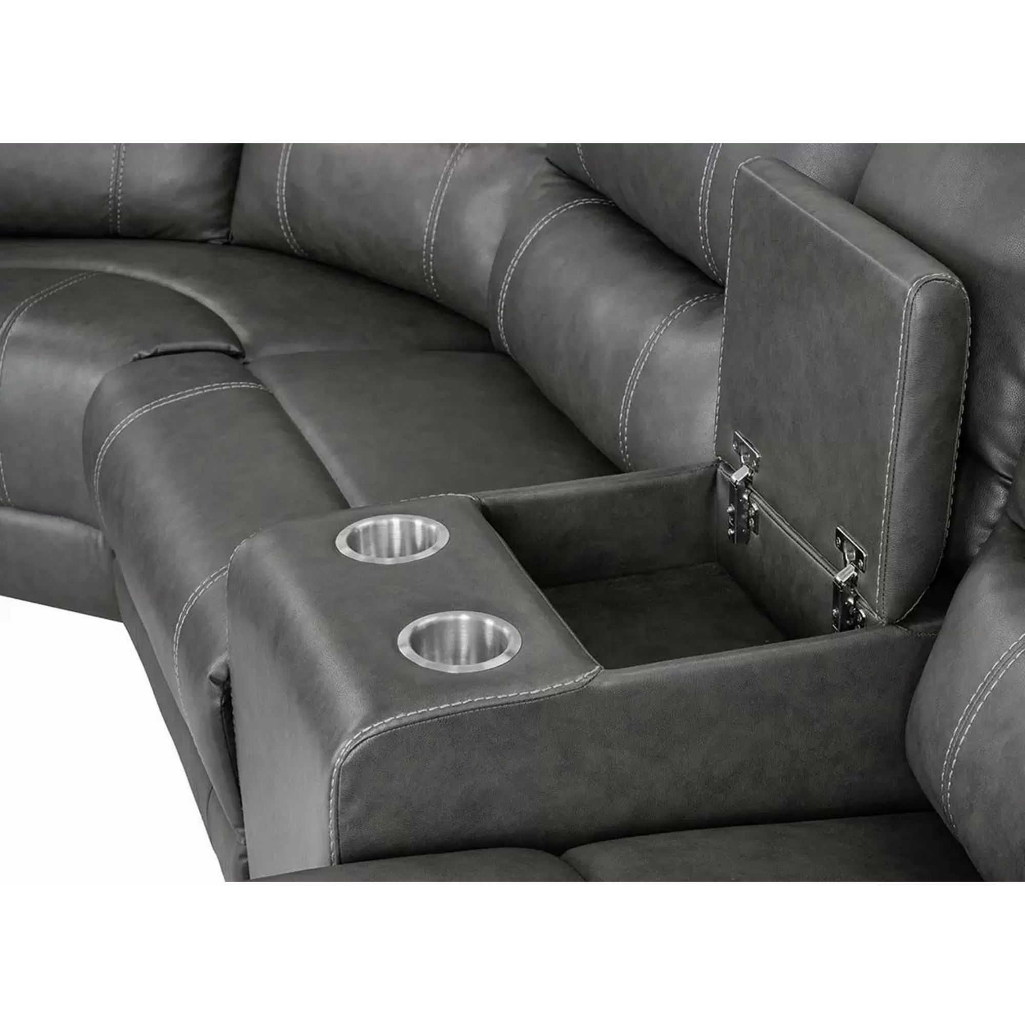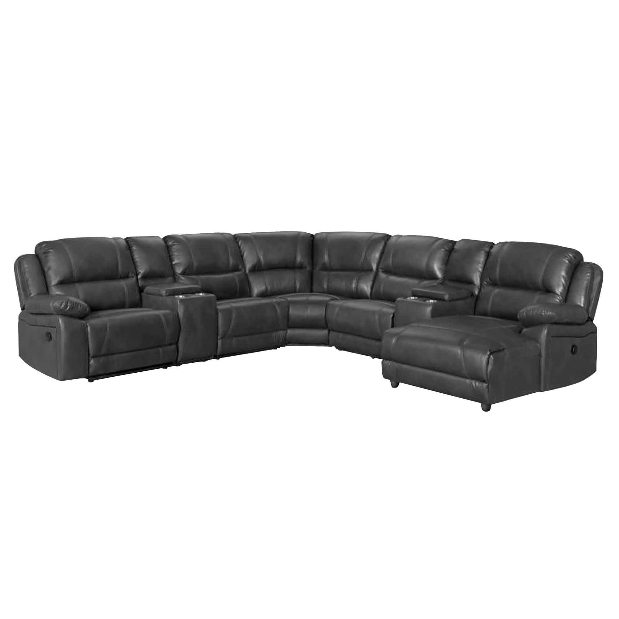 This stylish sectional sofa set has ample seating for up to five people and is ideal for creating a comfortable living space. The two manual recliners and push-back chaise lounge allow you to stretch out and relax. Consoles on each end of the sectional provide storage for remotes, and dual cupholders to hold drinks.