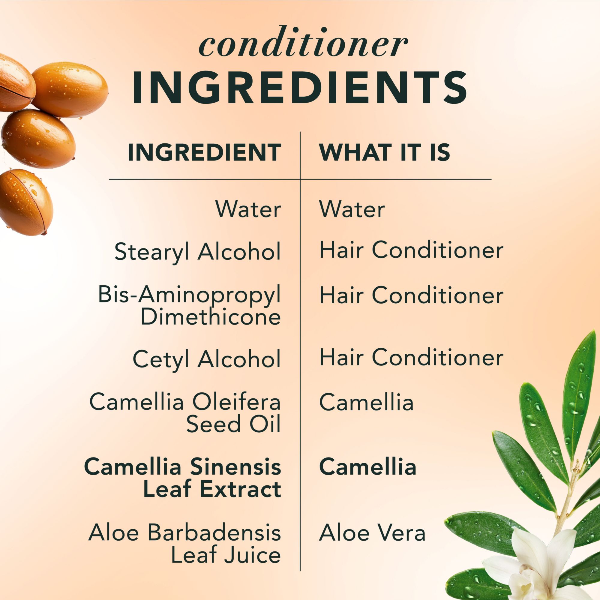 Shampoo: Water, Sodium Cocoyl Isethionate, Lauramidopropyl Betaine, Cocamidopropyl Betaine, Sodium Lauroyl Sarcosinate, Fragrance, Camellia Sinensis Leaf Extract, Camellia Oleifera Seed Oil, Aloe Barbadensis Leaf Juice, Argania Spinosa Kernel Oil, Citrus Aurantium Dulcis (Orange) Flower Extract, Zea Mays (Corn) Silk Extract, Histidine, Sodium Citrate, Sodium Benzoate, Dimethiconol, Tea-Dodecylbenzenesulfonate, Laureth-23, Sodium Salicylate, Polyquaternium-10, Citric Acid, Tetrasodium EDTA. Conditioner: Water, Stearyl Alcohol, Bis-Aminopropyl Dimethicone, Cetyl Alcohol, Camellia Oleifera Seed Oil, Camellia Sinensis Leaf Extract, Aloe Barbadensis Leaf Juice, Citrus Aurantium Dulcis (Orange) Flower Extract, Argania Spinosa Kernel Oil, Zea Mays (Corn) Silk Extract, Histidine, Stearamidopropyl Dimethylamine, Fragrance, Benzyl Alcohol, Dicetyldimonium Chloride, Glutamic Acid, Sodium Benzoate, Citric Acid, Disodium EDTA, Polysorbate 20