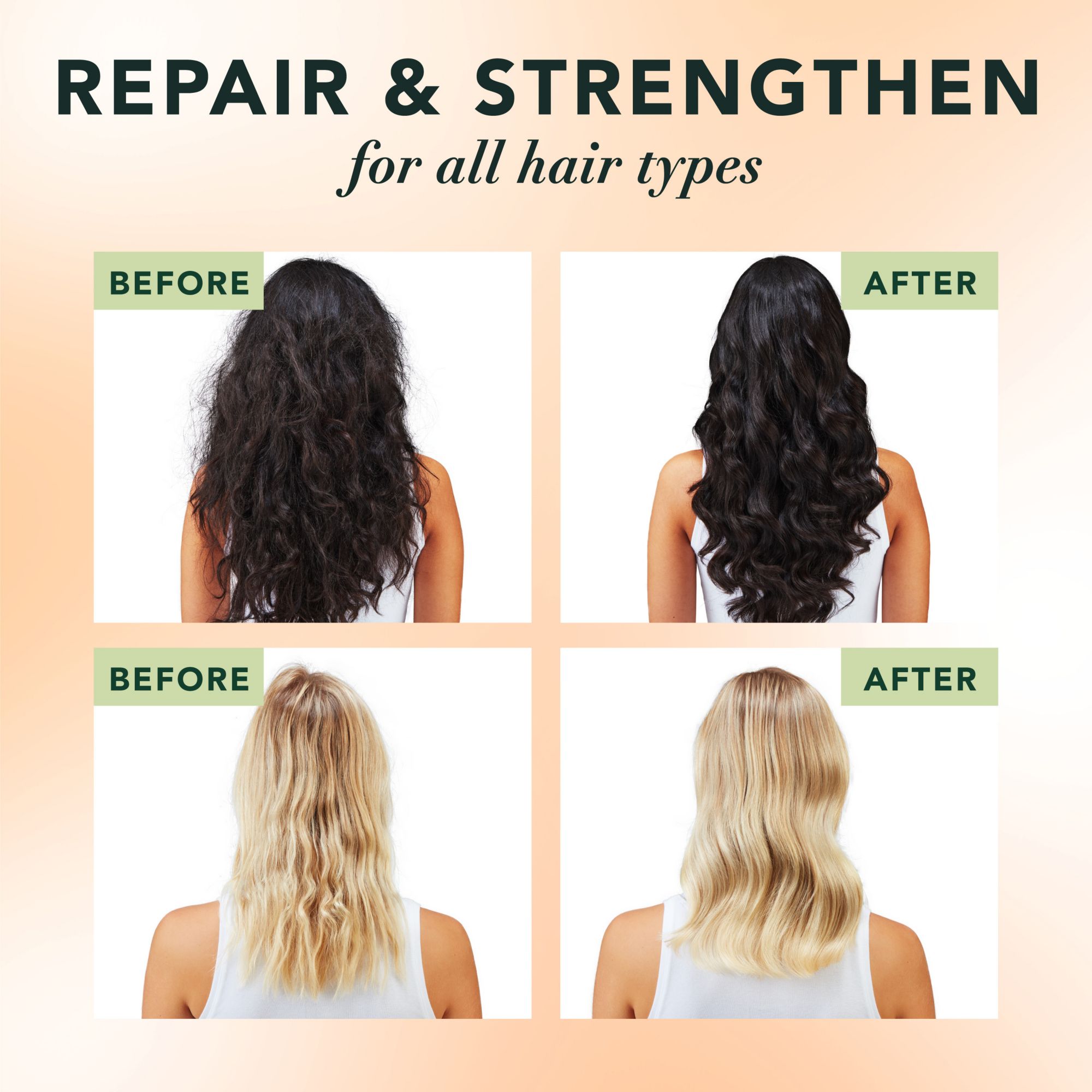 Repair + Strength + Hydrate: Visibly repairs signs of damage and hydrates for more resilient hair after first use