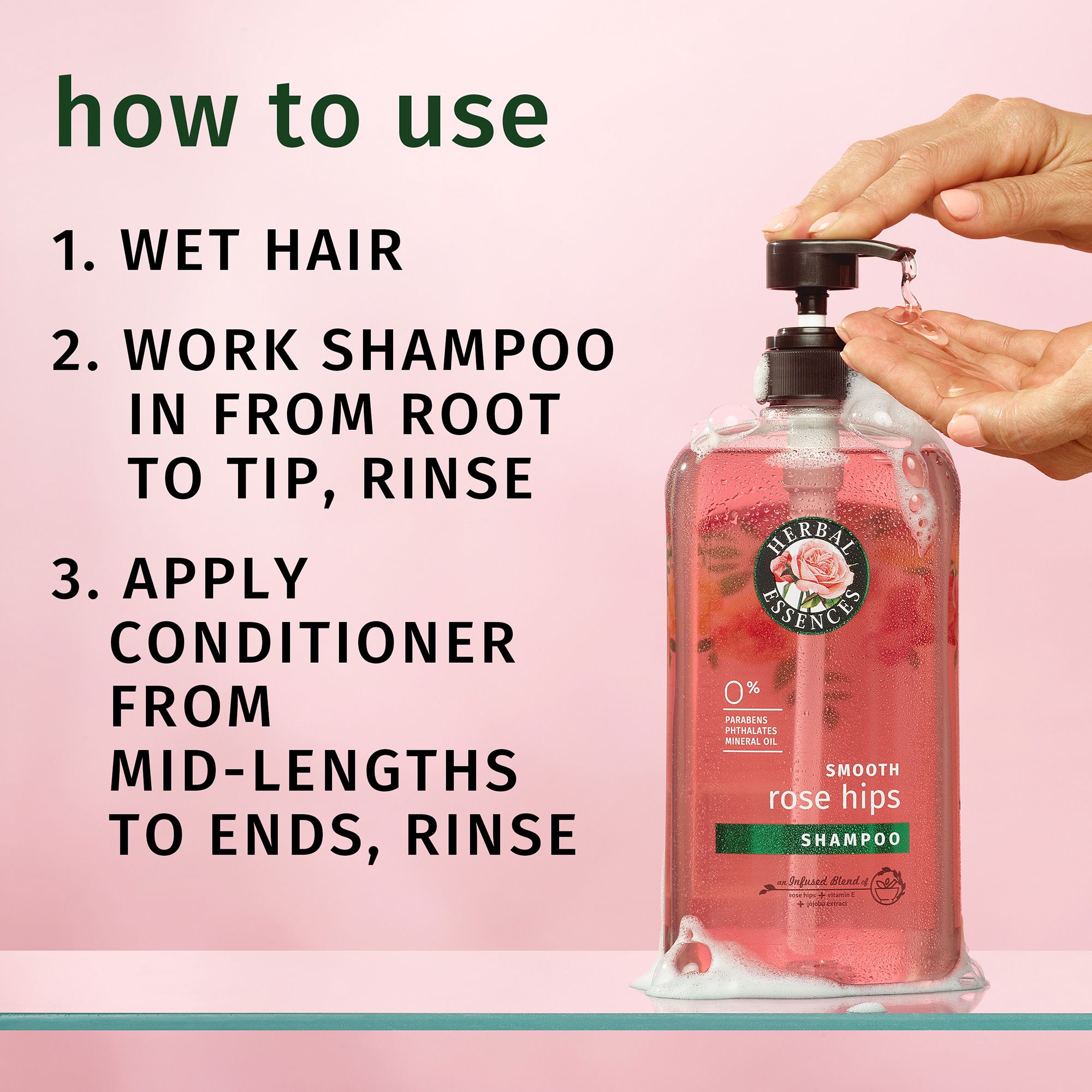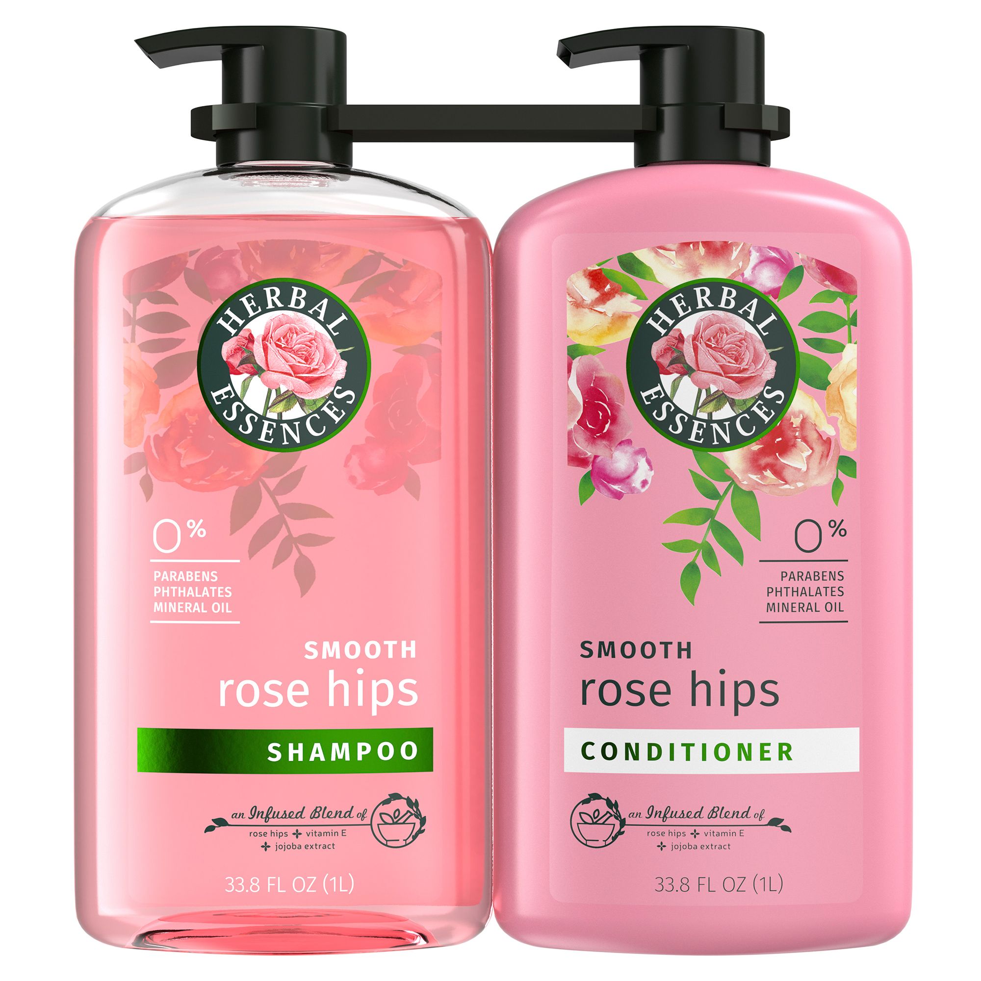 Need help smoothing things out? Herbal Essences is here to help. Try the Herbal Essence Rose Hips Smooth Shampoo and Conditioner set. It's specially crafted with an infused blend of rose hips, vitamin E, and jojoba extracts. That's right-it's made with real rose hip extracts. This formula works by cleansing and conditioning your hair with a rich lather and adding a healthy dose of much-needed moisture and hydration for a soft, smooth look and feel. It also helps restore your hair's natural shine. All that in a handy pump bottle? The answer is yes. Plus, you'll feel as good as your hair when you discover this smoothing shampoo and conditioner are also certified PETA cruelty-free, mineral-oil-free, color-safe, and pH-balanced. It's perfect for all hair types. Which means your hair will love the way it feels. Make it part of your routine. Complete the smoothing effects with the Herbal Essences Rose Hips collection. First work the rich lather of the Rose Hips Shampoo into your hair, then rinse. Repeat the process with the Rose Hips Conditioner. Then dry your hair and style it as you normally would. Make sure you take a moment to enjoy the light, floral scent of rose. And, of course, don't forget to recommend it to your friends.