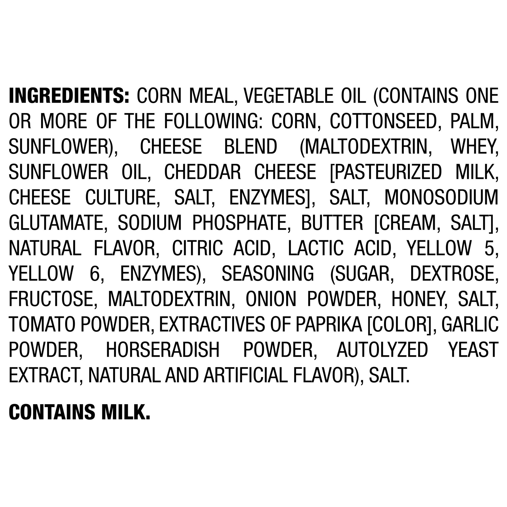 Ingredients: Corn Meal, Vegetable Oil (Contains One Or More Of The Following: Corn, Cottonseed, Palm, Sunflower), Cheese Blend (Maltodextrin, Whey, Sunflower Oil, Cheddar Cheese [Pasteurized Milk, Cheese Culture, Salt, Enzymes], Salt, Monosodium Glutamate, Sodium Phosphate, Butter [Cream, Salt], Natural Flavor, Citric Acid, Lactic Acid, Yellow 5, Yellow 6, Enzymes), Salt. Seasoning: Sugar, Dextrose, Fructose Maltodextrin, Onion Powdre, Honey, Salt, Tomato Powder, Extractives Of Paprika(color) Garlic Powder, Horseradish Powder, Autolyzed Yeast Extract, Natural And Artificial Flavor.