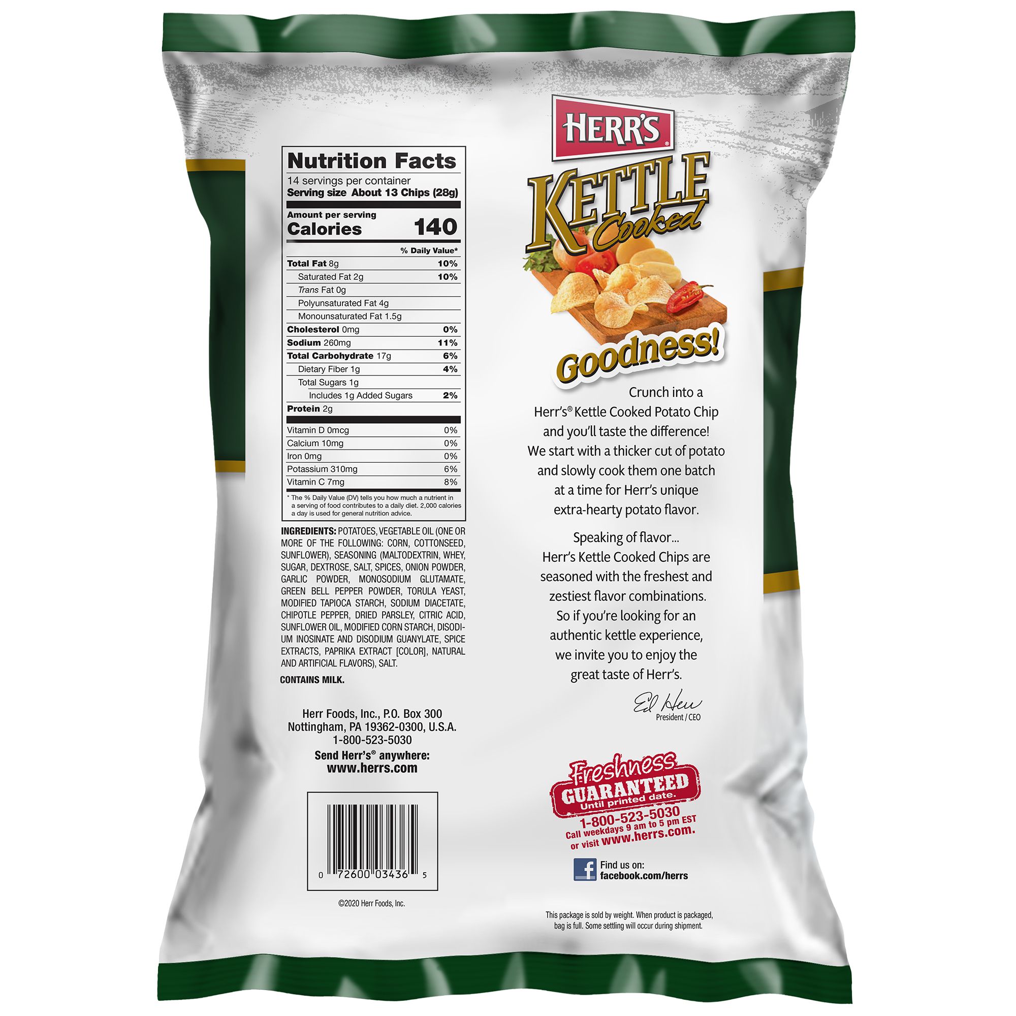 The perfect and tasty addition to lunchboxes, tailgate parties, movie night, picnics and so much more. This HERR'S 14 oz. bag of All Natural Kettle Cooked Potato Chips tastes great. You won't be able to eat just one! Crunch into a Herr's Kettle Cooked Potato Chip and you'll taste the difference! We start with a thicker cut of potato and slowly cook them one batch at a time for Herr's unique extra-hearty potato flavor. Speaking of flavor…Herr's Kettle Cooked Chips are seasoned with the freshest and zestiest flavor combinations. So, if you are looking for an authentic kettle potato chip experience, we invite you to enjoy the great taste of Herr's Kettle Cooked Potato Chips.