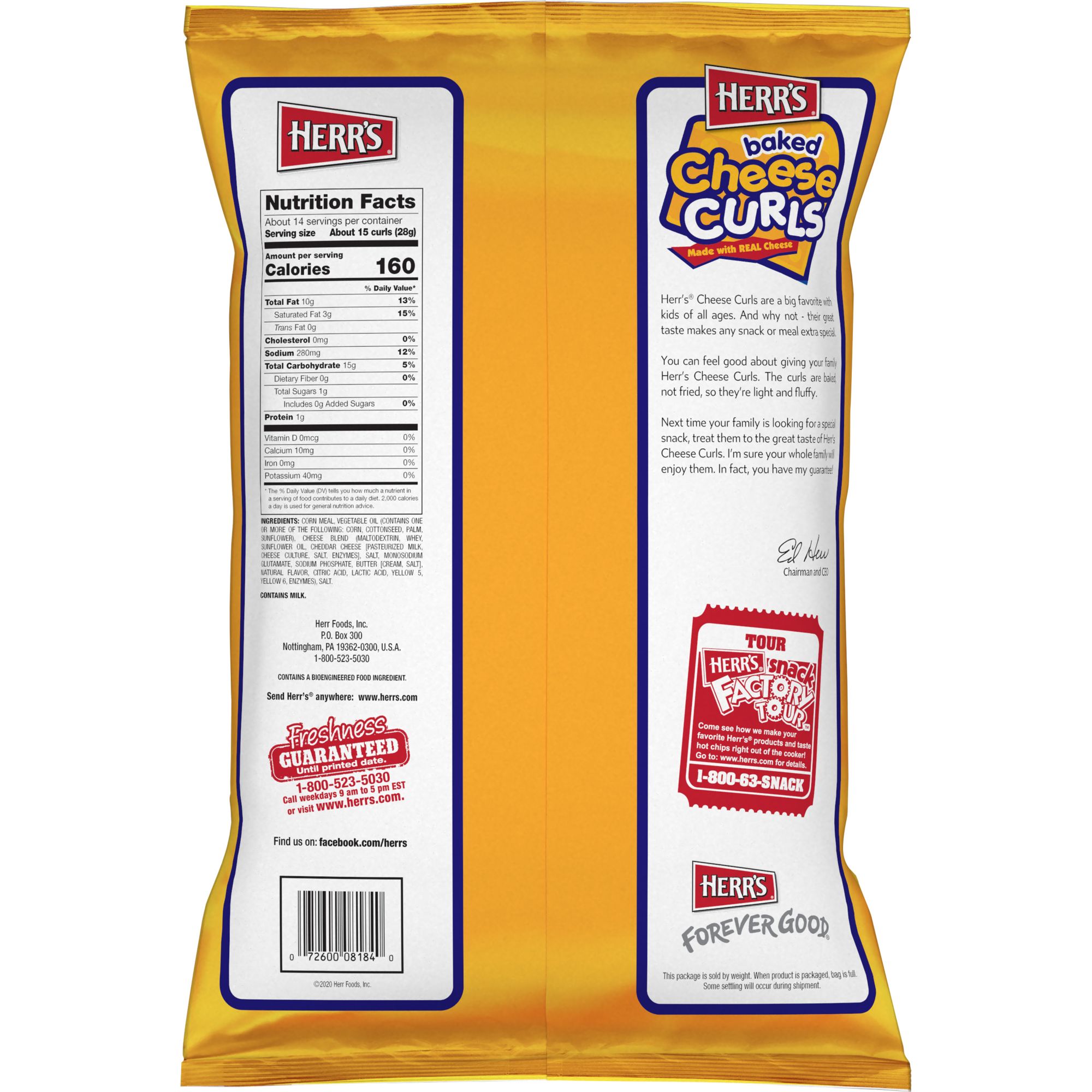 Herr's Cheese Curls are a big favorite with kids of all ages. And why not - their great taste makes any snack or meal extra special. You can feel good about giving your family Herr's Cheese Curls. These curls are baked, not fried, so they're light and fluffy. Next time your family is looking a special snack, treat them to the great taste of Herr's Cheese Curls. This package is sold by weight. When product is packaged, bag is full. Some settling will occur during shipment.