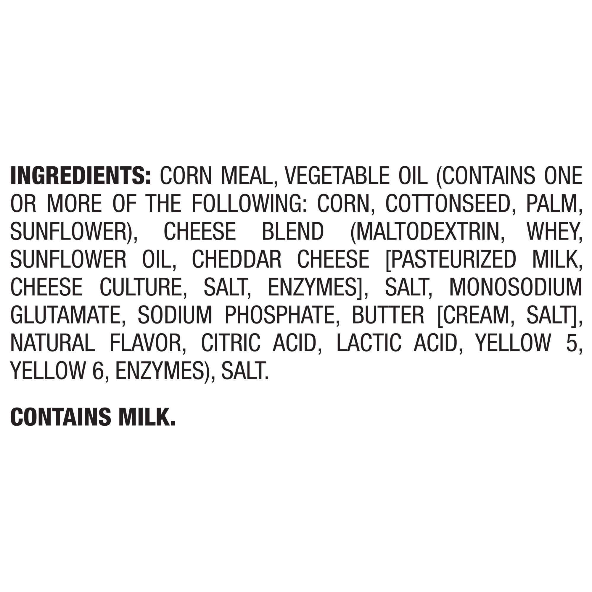Ingredients: Corn Meal, Vegetable Oil (Contains One Or More Of The Following: Corn, Cottonseed, Palm, Sunflower), Cheese Blend (Maltodextrin, Whey, Sunflower Oil, Cheddar Cheese [Pasteurized Milk, Cheese Culture, Salt, Enzymes], Salt, Monosodium Glutamate, Sodium Phosphate, Butter [Cream, Salt], Natural Flavor, Citric Acid, Lactic Acid, Yellow 5, Yellow 6, Enzymes), Salt.