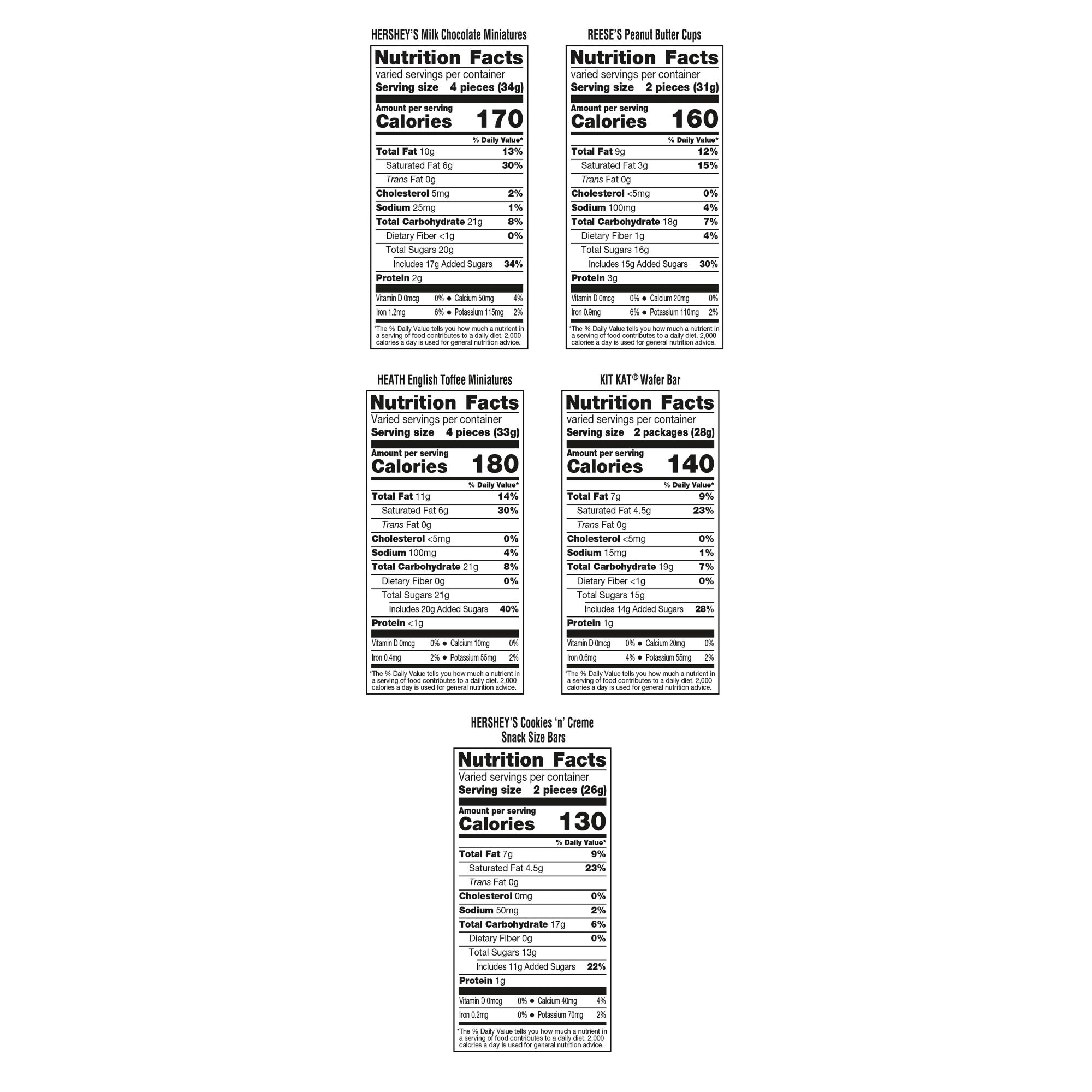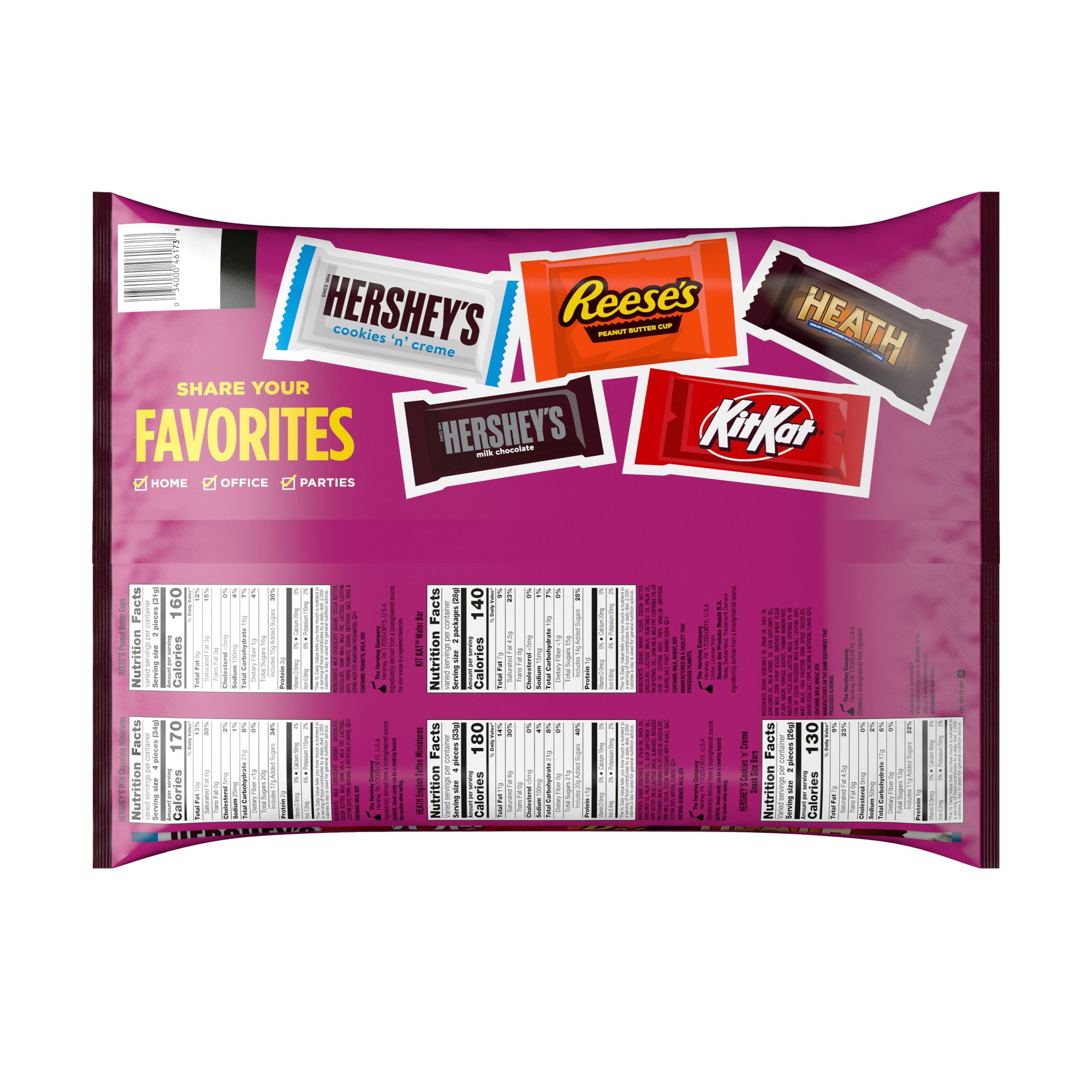 Includes Hershey's milk chocolate bars, Hershey's Cookies 'n' Creme candy bars, Kit Kat milk chocolate wafer bars, Reese's milk chocolate peanut butter cups candy and Heath chocolatey English toffee candy bars