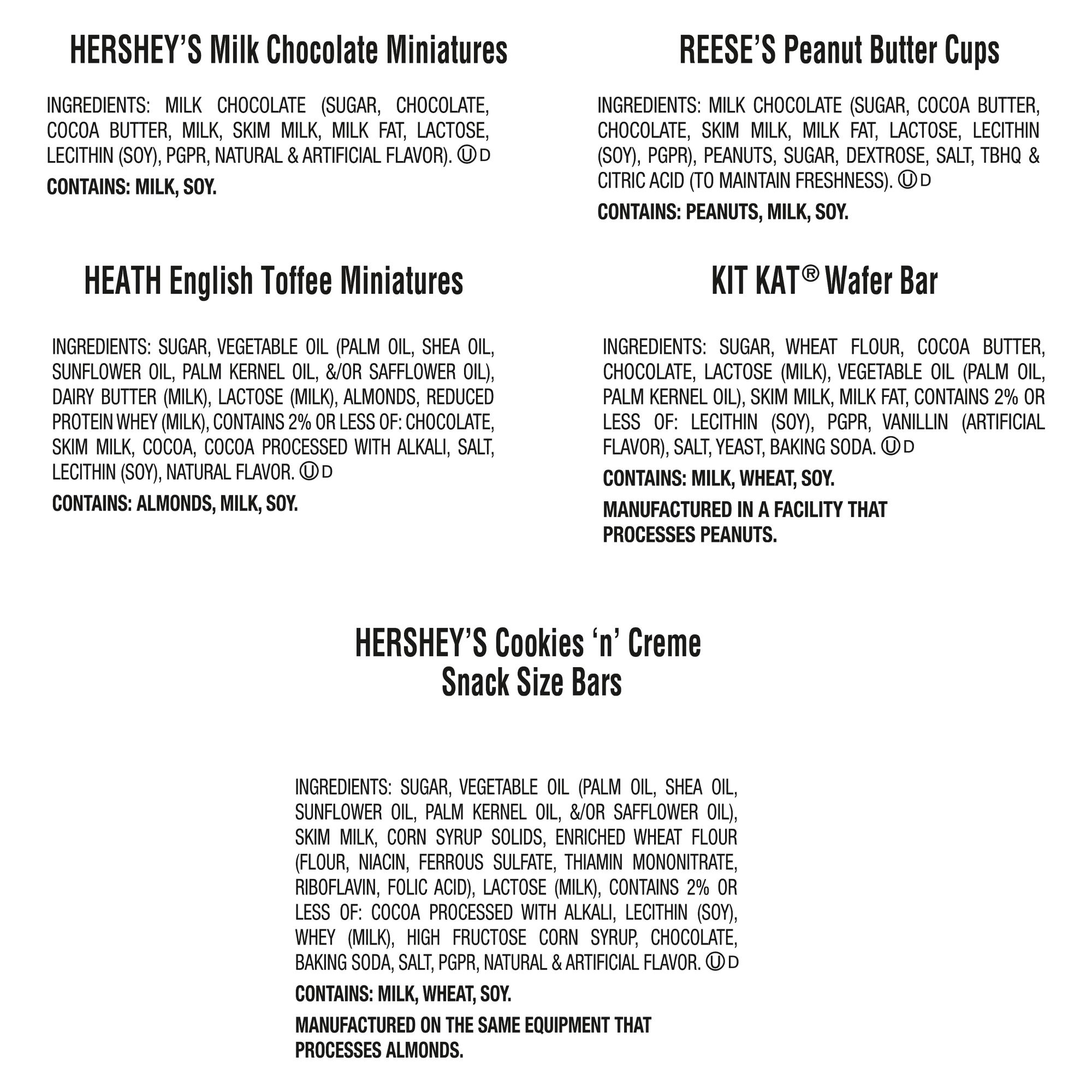 Ingredients: Hershey's Milk Chocolate Miniatures: Milk Chocolate (Sugar, Chocolate, Milk, Cooca Butter, Skim Milk, Milk Fat, Lactose, Lecithin (Soy), PGPR, Natural & Artificial Flavor). Reese's Peanut Butter Cups: Milk Chocolate (Sugar, Chocolate, Cooca Butter, Skim Milk, Milk Fat, Lactose, Lecithin (Soy), PGPR), Peanuts, Sugar, Dextrose, Salt, TBHQ & Citric Acid (To Maintain Freshness). Kit Kat Wafer Bar: Sugar, Wheat Flour, Cocoa Butter, Chocolate, Latcose (Milk), Vegetable Oil (Palm Oil, Palm Kernel Oil), Skim Milk, Milk Fat, Contains 2% or less of: Lecithin (Soy), PGPR, Vanillin (Artificial Flavor), Salt, Yeast, Baking Soda. Heath English Toffee Miniatures: Sugar, Vegetable Oil (Palm Oil, Shea Oil, Sunflower Oil, Palm Kernel Oil, &/OR Safflower Oil), Dairy Butter (Milk), Lactose (Milk), Almonds, Reduced Protein Whey (Milk), Contains 2% or Less of: Chocolate, Skim Milk, Cocoa, Cocoa Processed with Alkali, Salt, Lecithin (Soy), Natural Flavor. Hershey's Cookies 'n' Creme Snack Size Bars: Sugar, Vegetable Oil (Palm Oil, Shea Oil, Sunflower Oil, Palm Kernel Oil, &/Or Safflower Oil), Skim Milk, Corn Syrup Solids, Enriched Wheat Flour (Flour, Niacin, Ferrours Sulfate, Thiamin Mononitrate, Riboflvin, Folic Acid), Lactose (Milk), Contains 2% or Less of: Cocoa Processed with Alkali, Lecithin (soy), Whey (Milk), High Fructose Corn Syrup, Chocolate, Baking Soda, Salt, PGPR, Natural & Artificial Flavor.