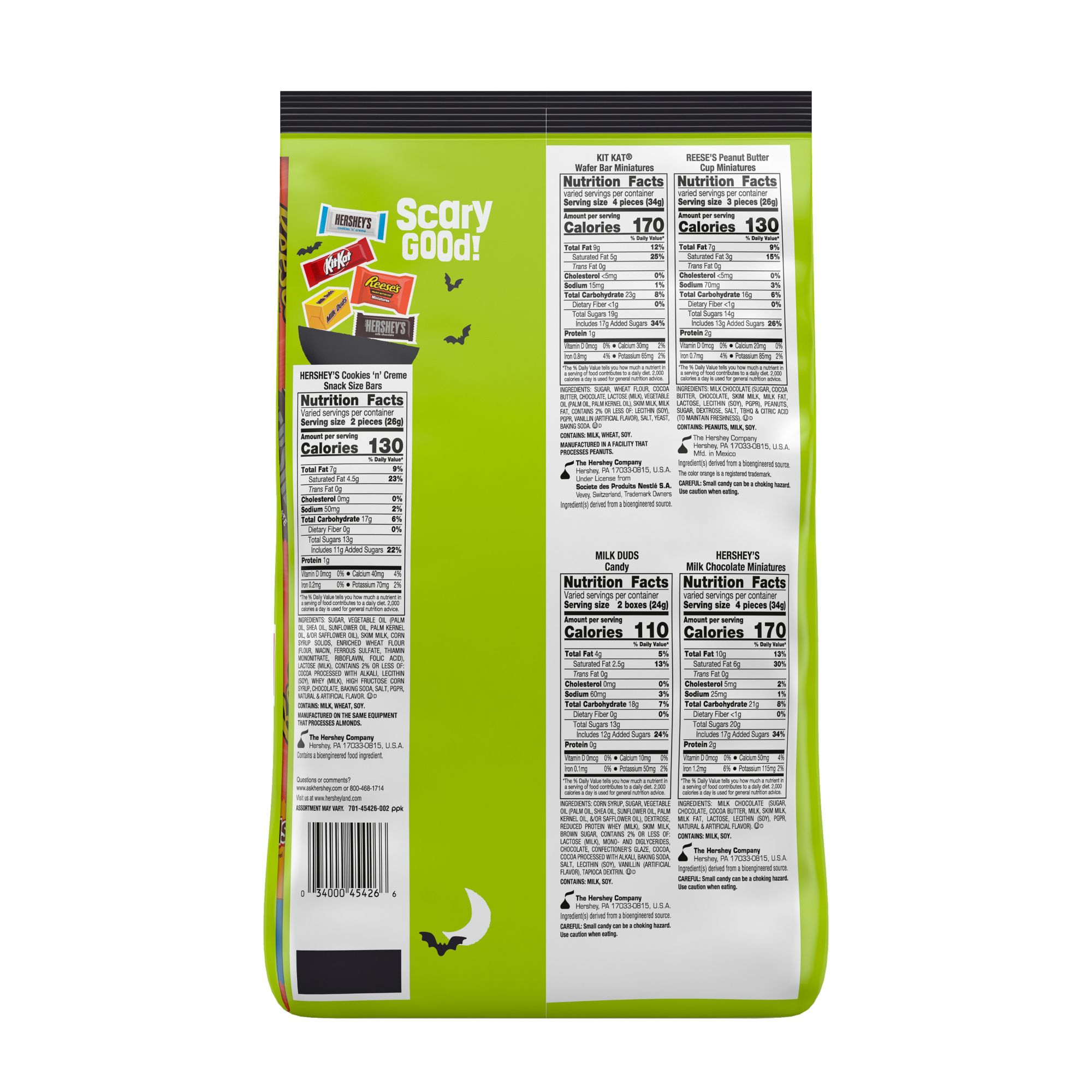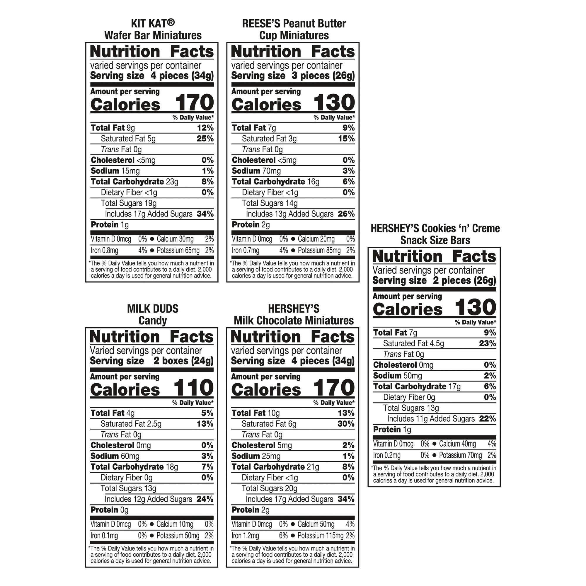 Ingredients Kit Kat Wafer Bar Miniatures: Sugar, Wheat Flour, Cocoa Butter, Chocolate, Lactose (Milk), Vegetable Oil (Palm Oil, Palm Kernel Oil), Skim Milk, Milk Fat, Contains 2% Or Less Of: Lecithin (Soy), Pgpr, Vanillin (Artifical Flavor), Salt, Yeast, Baking Soda. Reese's Peanut Butter Cup Miniatures: Milk Chocolate (Sugar, Cooca Butter, Chocolate, Skim Milk, Milk Fat, Lactos, Lecithin (Soy), Pgpr), Peanuts, Sugar, Dextrose, Salt, Tbhq & Citric Acid (To Maintain Freshness). Hershey's Milk Chocolate Miniatures: Milk Chooclate (Sugar, Chocolate, Cocoa, Butter, Milk, Skim Milk, Milk Fat, Lactos, Lecithin (Soy), Pgpr, Natural & Artificial Flavor). Hershey's Cookies 'N' Creme Snack Size Bars: Sugar, Vegetable Oil (Palm Oil, Sunflower Oil, Palm Kernel Oil), Skim Milk, Corn Syrup Solids, Enriched Wheat Flour (Wheat Flour, Niacin, Reduced Iron, Thiamin Mononitrate, Riboflavin, Folic Acid), Lactose (Milk), Contains 2% Or Less Of: Cocoa Processed With Alkali, Lecithin (Soy), Whey (Milk), Natural & Artificial Flavor, Salt, Baking Soda, Chocolate. Milk Duds Candy: Corn Syrup, Sugar, Vegetable Oil (Palm Oil, Shea Oil, Sunflower Oil, Palm Kernel Oil, &/Or Safflower Oil), Dextrose, Reduced Proteing Whey (Milk), Skim Milk, Brown Sugar, Contains 2% Or Less Of: Lactose (Milk), Mono & Diglycerides, Chocolate, Confectioner's Glaze, Cocoa, Cocoa Processed With Alkali, Baking Soda, Salt, Lecithin (Soy), Vanillin (Artificial Flavor), Tapioca Dextrin.