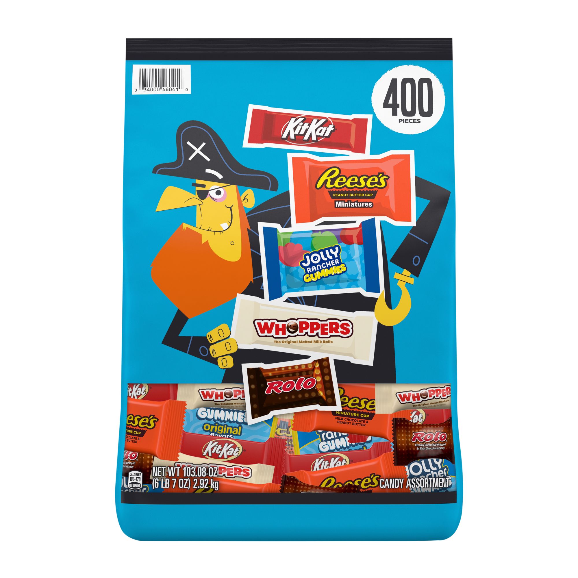 Contains one (1) 103.08-ounce, 400-piece bulk variety bag of Hershey Assorted Flavored Candy