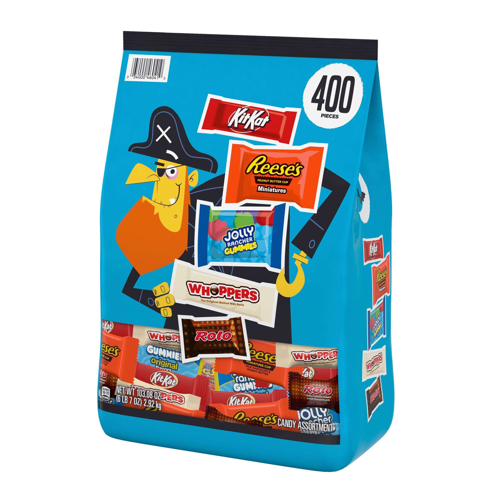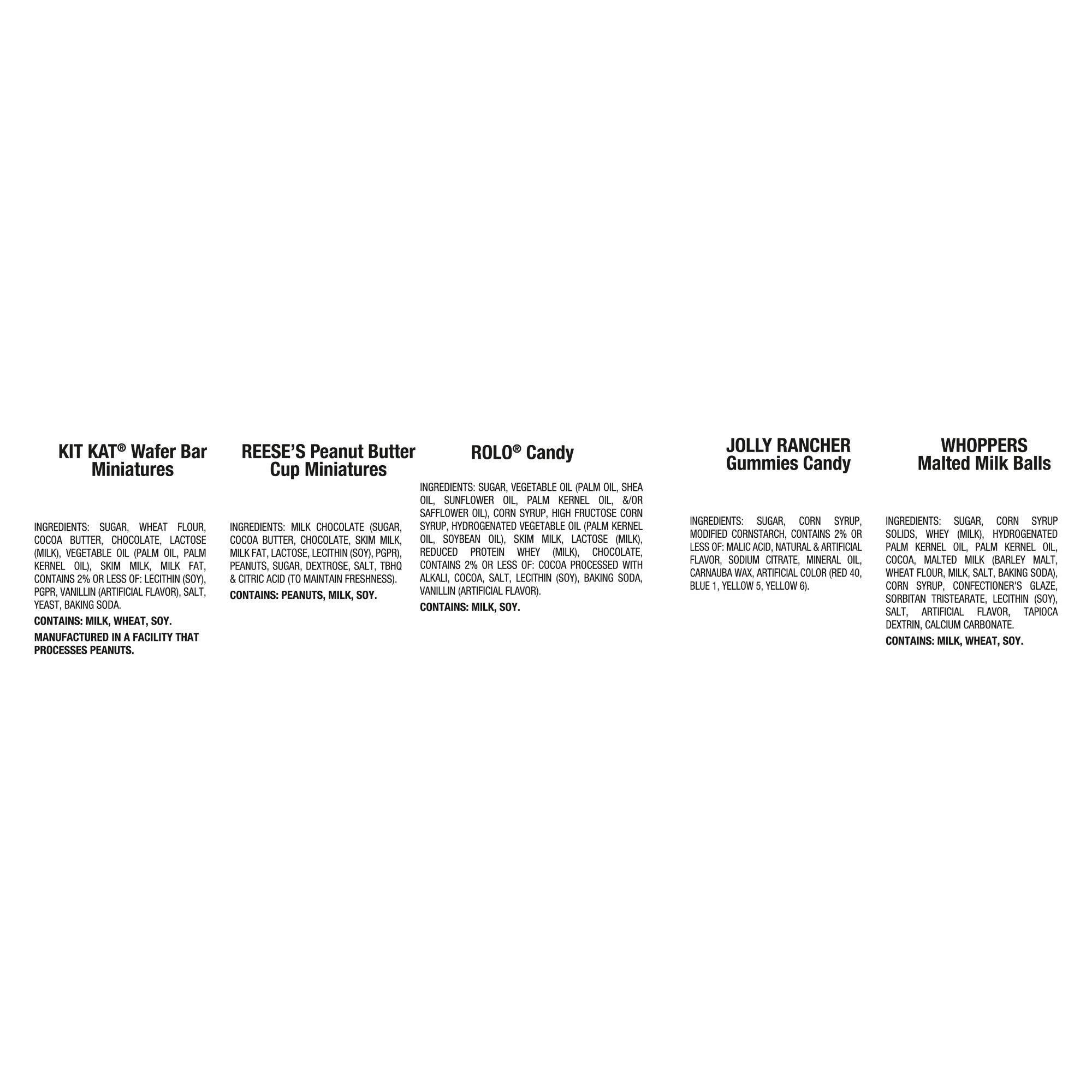 Includes Reese's milk chocolate peanut butter cups candy, Whoppers malted milk balls candy, Kit Kat milk chocolate wafer candy bars, Rolo rich chocolate caramel candy & Jolly Rancher gummies assorted fruit flavored candy, 400 ct.